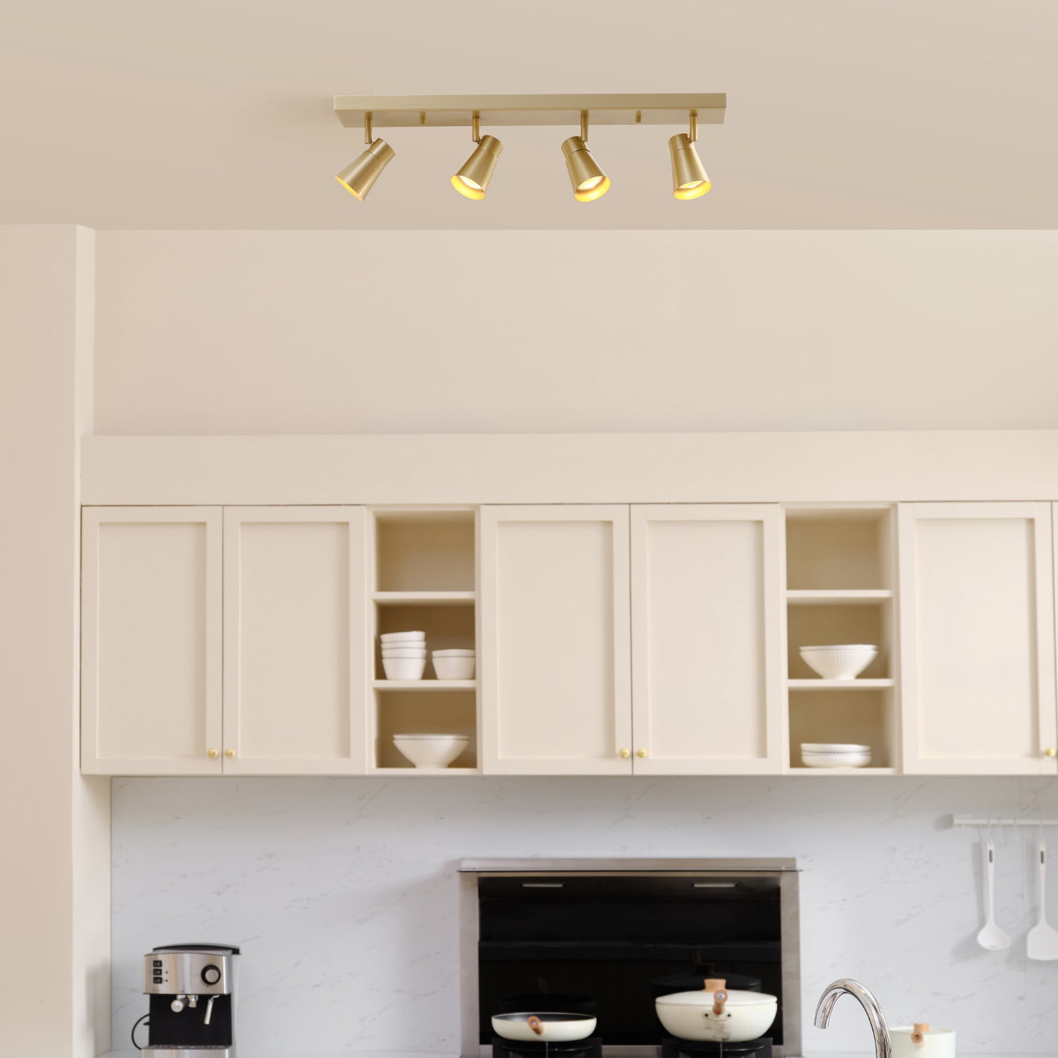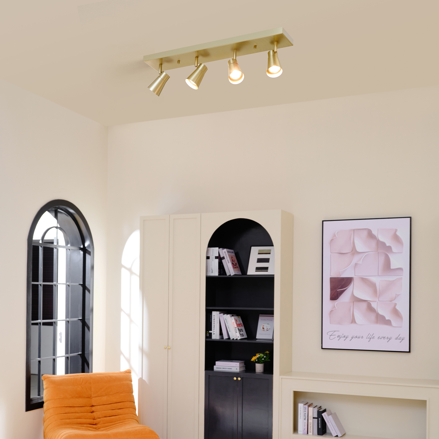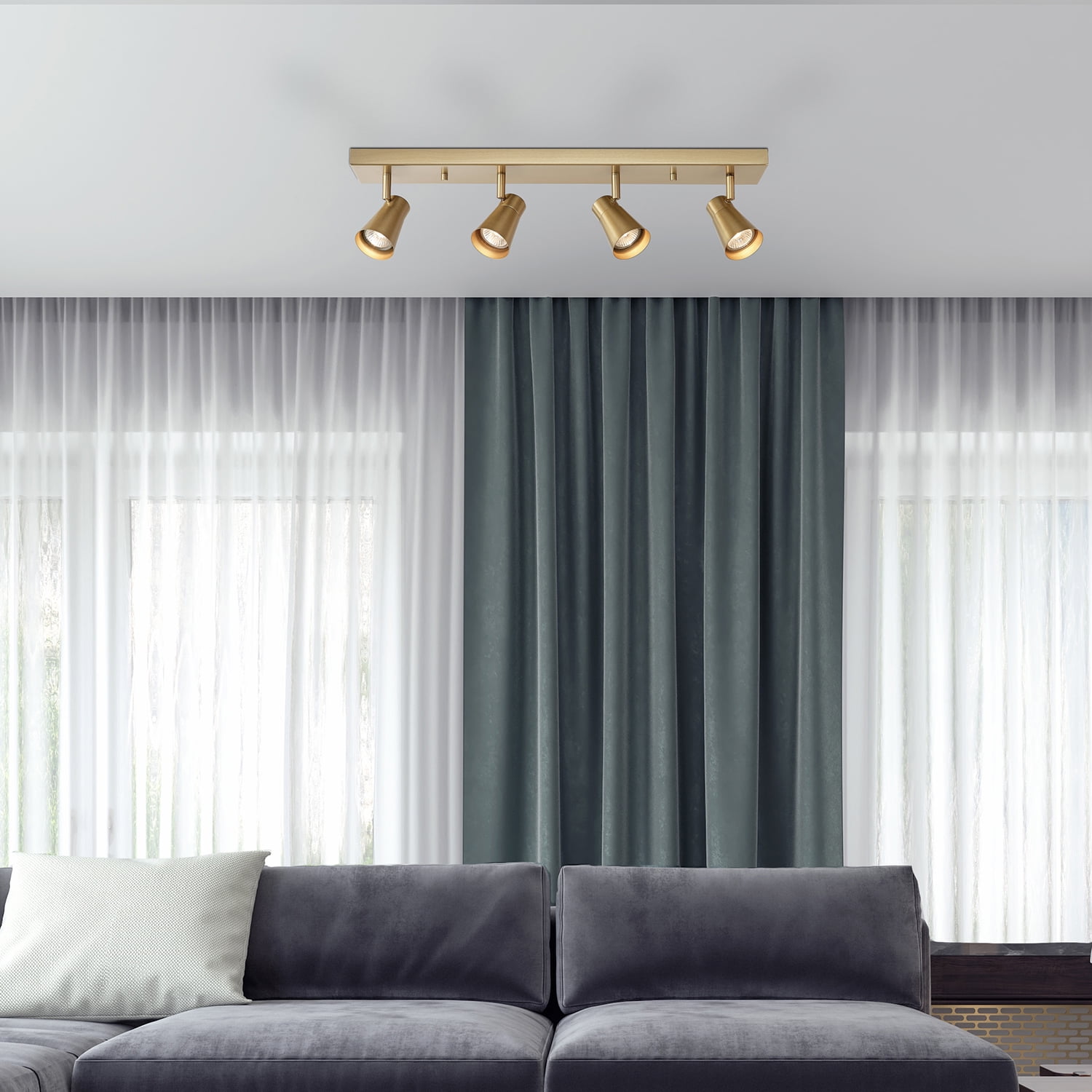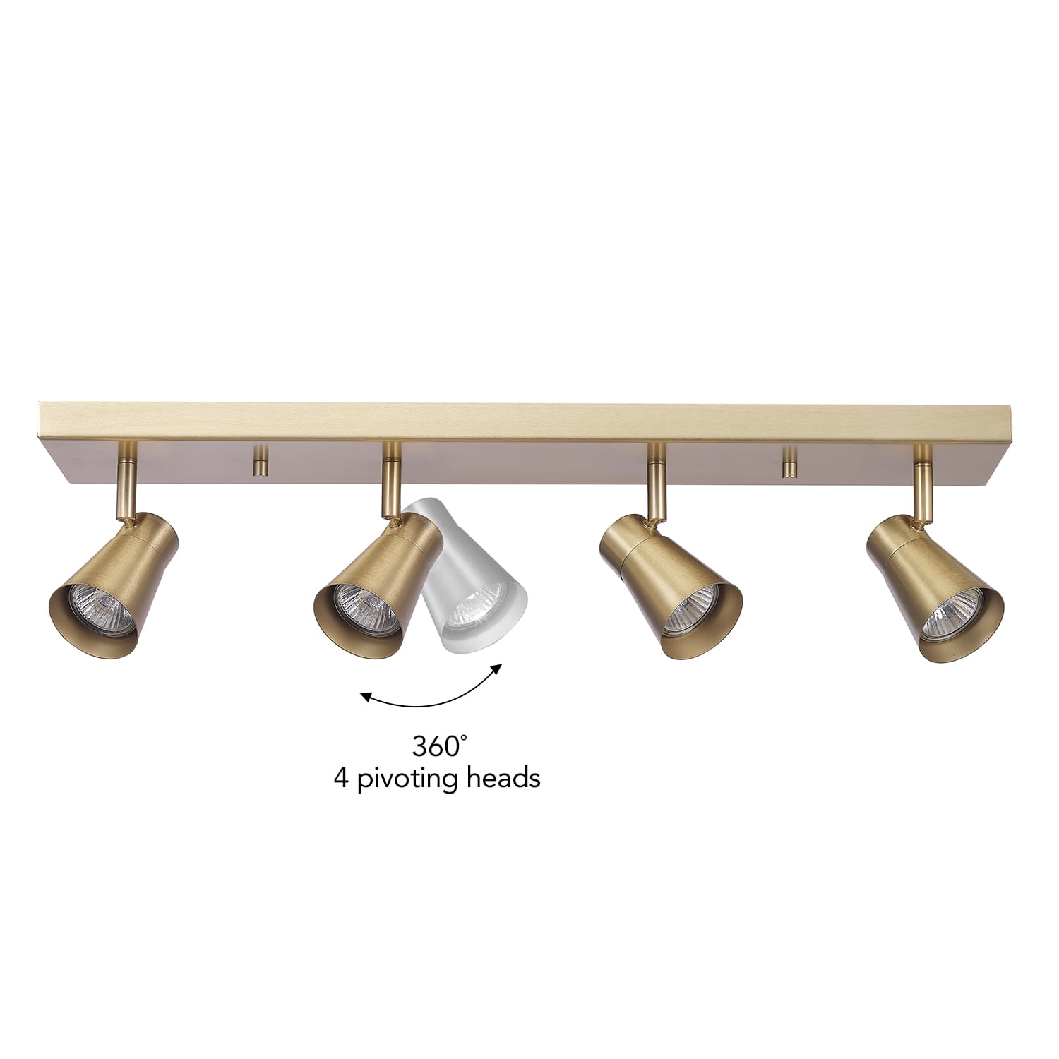 COZY GLAM DESIGN: with conical pivoting track heads and a matte brass finish, the 4-Light Track Light highlights a perfect cozy glam design trend suitable for any room in your well-decorated home PIVOTING TRACK HEADS: the pivoting track heads let you direct the light where you need it most providing the perfect lighting ambiance for every moment and every room BULB REQUIREMENTS: this track bar requires 4x GU10 Twist and Click Base 50W Max Bulbs (sold separately) – Compatible with LED and Incandescent Bulbs DIMMABLE: although the dimmer switch is not included, this track light bar is fully dimmable with a compatible dimmer switch to create the perfect atmosphere for any situation LIGHT YOUR HOME IN STYLE: the matte brass finish offers stylish lighting for your well decorated home – perfect for any kitchen, hallway, or living room setting EASY INSTALL: this stunning track ceiling light includes all mounting hardware for quick and easy installation – can be installed on a sloped or vaulted ceiling MAKE IT SMART: automate your track light by adding a Globe Electric Smart on/off or dimmer switch – simply replace your existing switch and connect your light to create new results with your phone