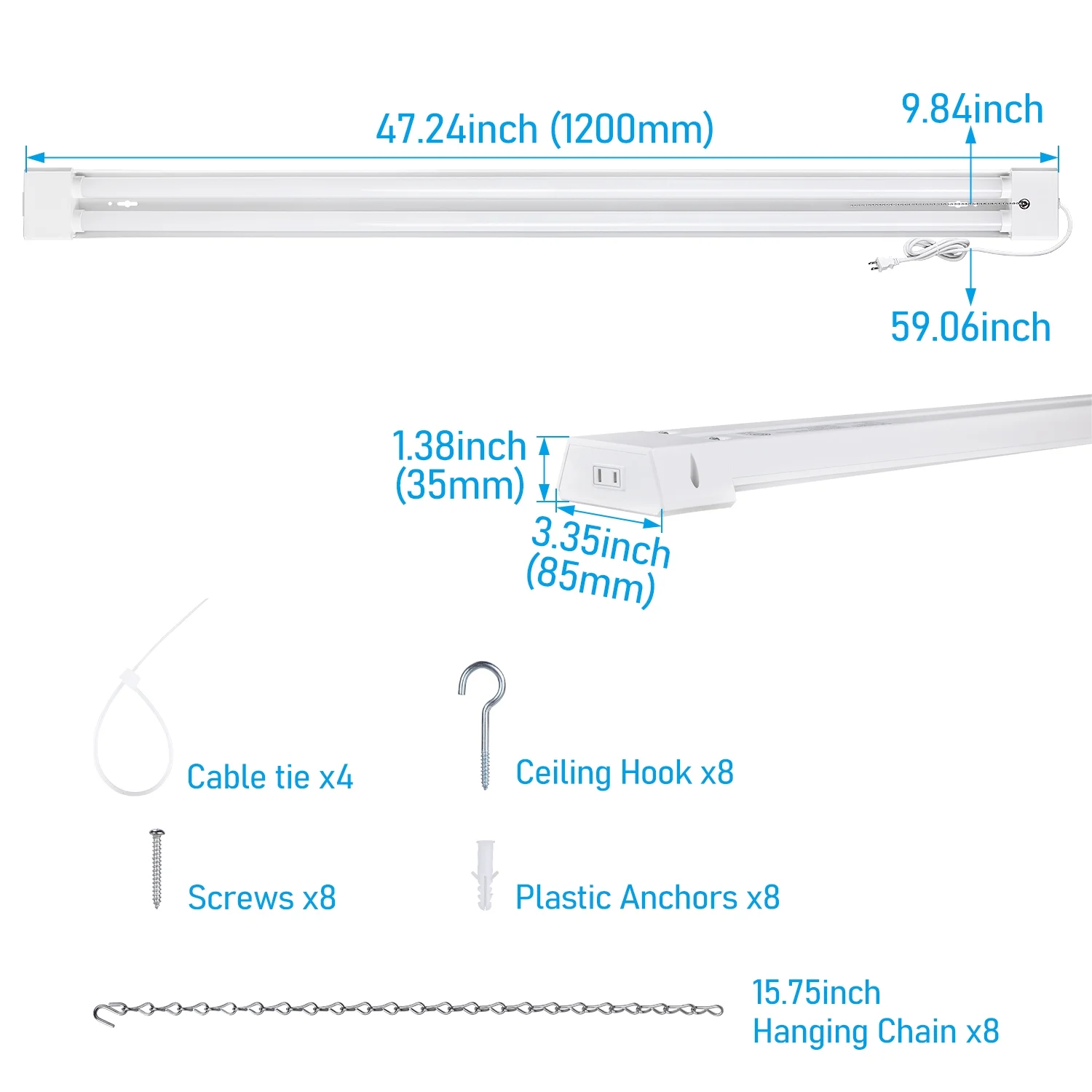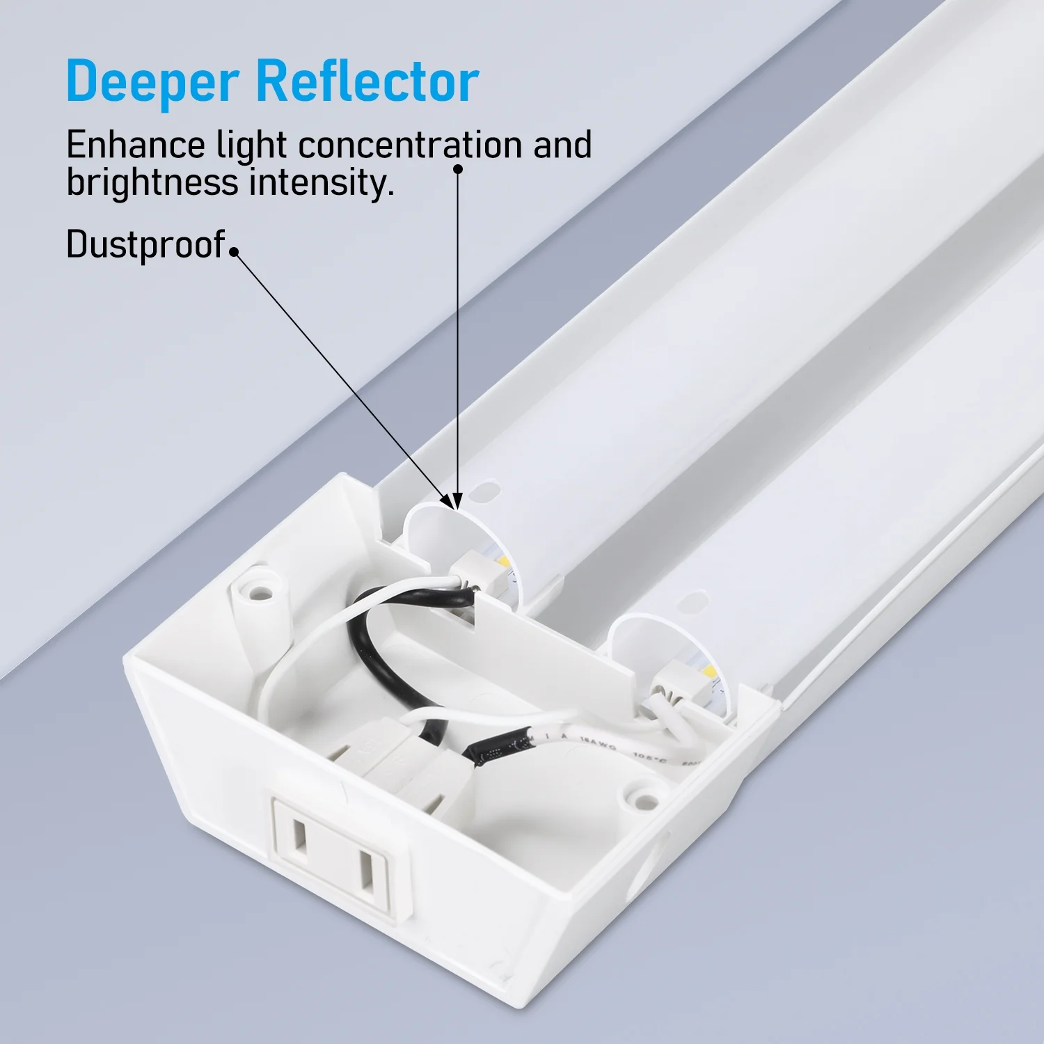 Low Power Consumption Despite its lower wattage, this 4ft LED shop light still delivers ample brightness. The 5000K natural daylight emitted is neither blue nor dazzling, ensuring a more pleasant and comfortable lighting environment for your work. Enhanced Reflective Design Our innovative deep reflector design offers superior performance by minimizing glare and reducing light loss. Additionally, it provides improved dustproof capabilities, protecting the lamp body and extending its lifespan for prolonged usage. Easy-to-Use Linkable Design Each light comes with a 59-inch power cord featuring a 1-15P plug, allowing you to effortlessly connect up to four lights using just one power supply. Our product comes with all the necessary accessories, making it easy for you to choose between surface mounting or suspended mounting according to your requirements. This versatility makes it perfect for various settings such as garages, stores, fast-food restaurants, gyms, and more. Certified for Safety and Quality ETL, FCC and ROHS listed, ensuring its compliance with rigorous safety and quality standards. Additionally, it comes with a generous 3-year warranty, providing you with peace of mind and assurance of its reliability. Specifications Wattage: 40W Voltage: 120V Luminous flux: 4000LM CCT: 5000K Daylight Lifespan: 35,000hrs Waterproof: Damp Working temperature: -4°F-104°F Dimmable: No Beam Angle: 115°