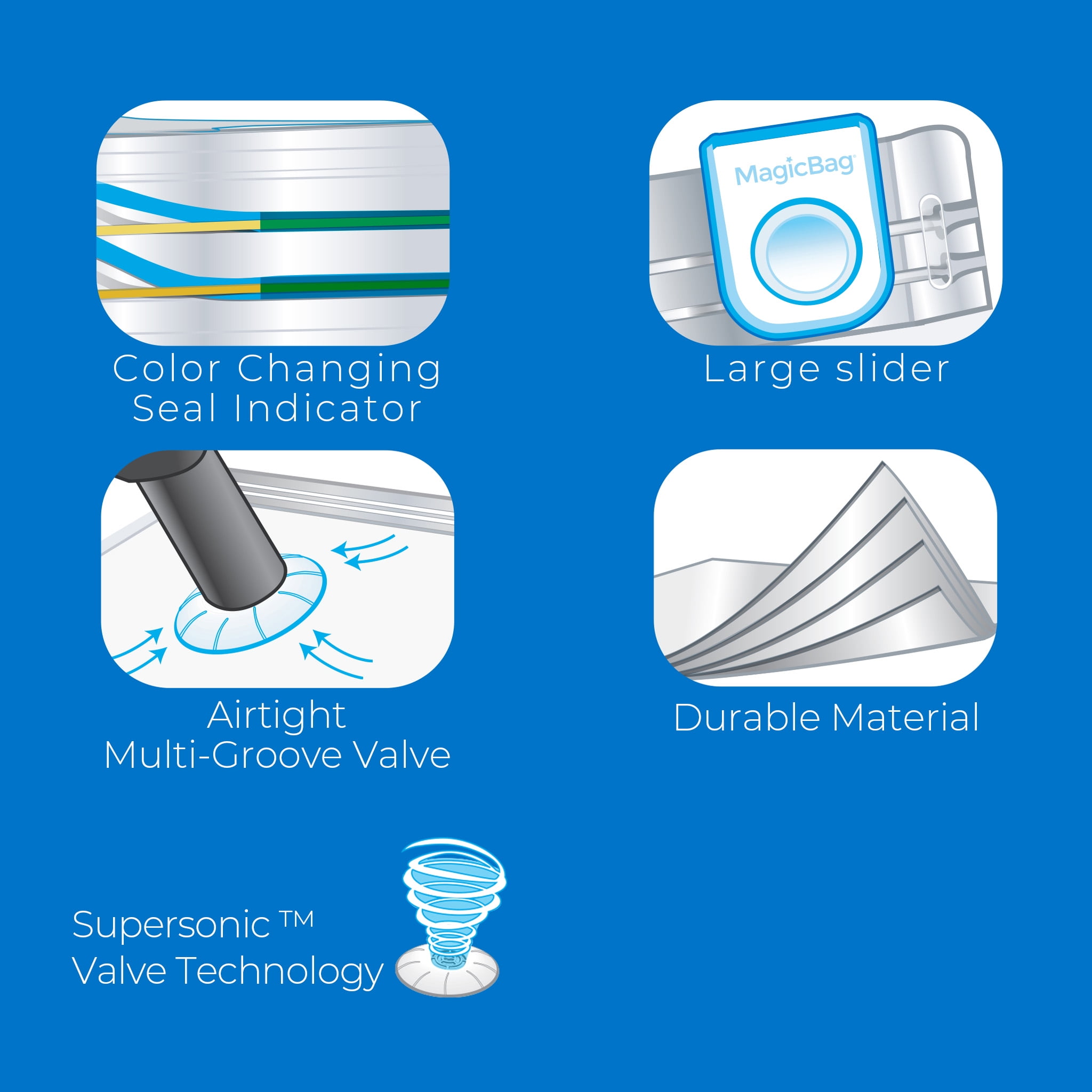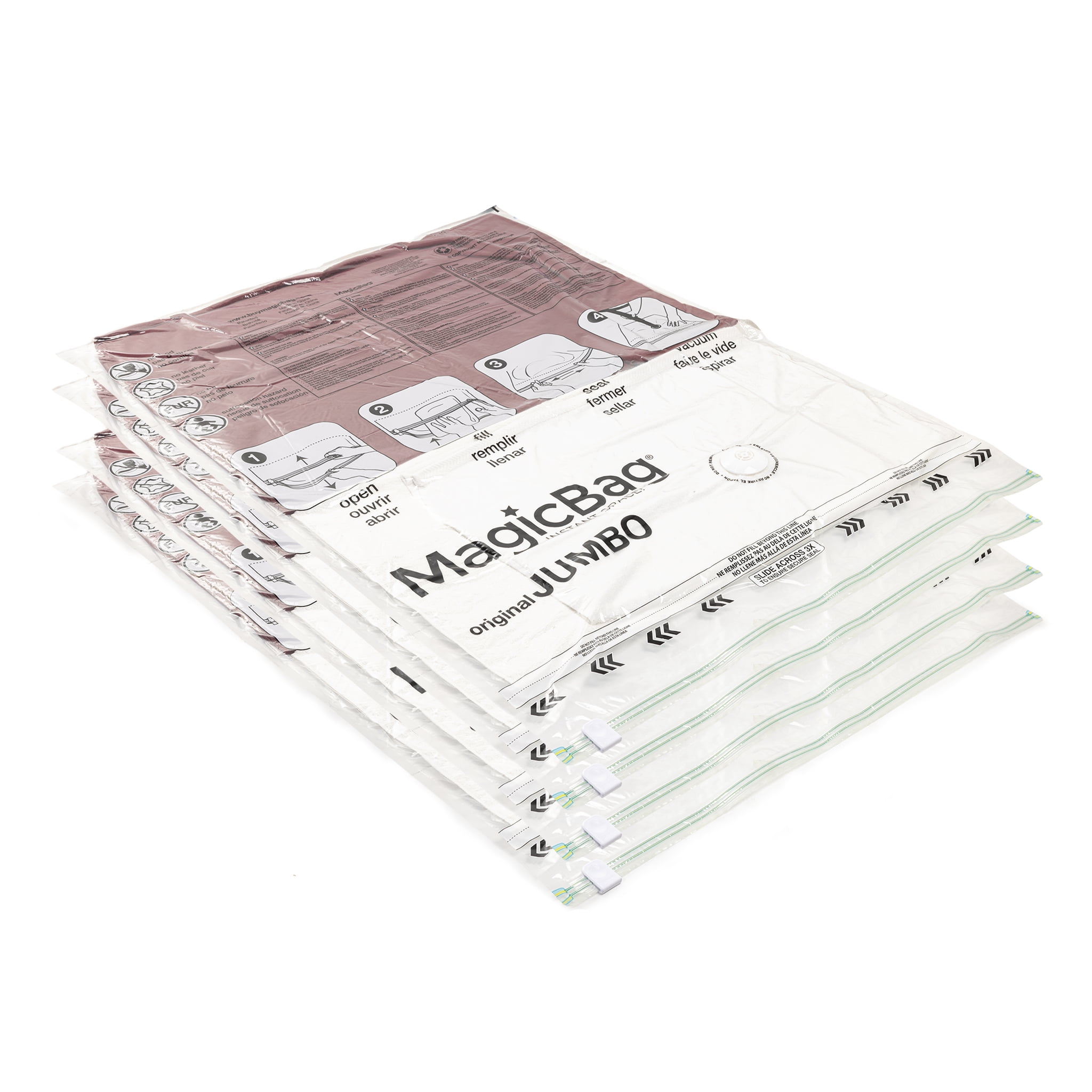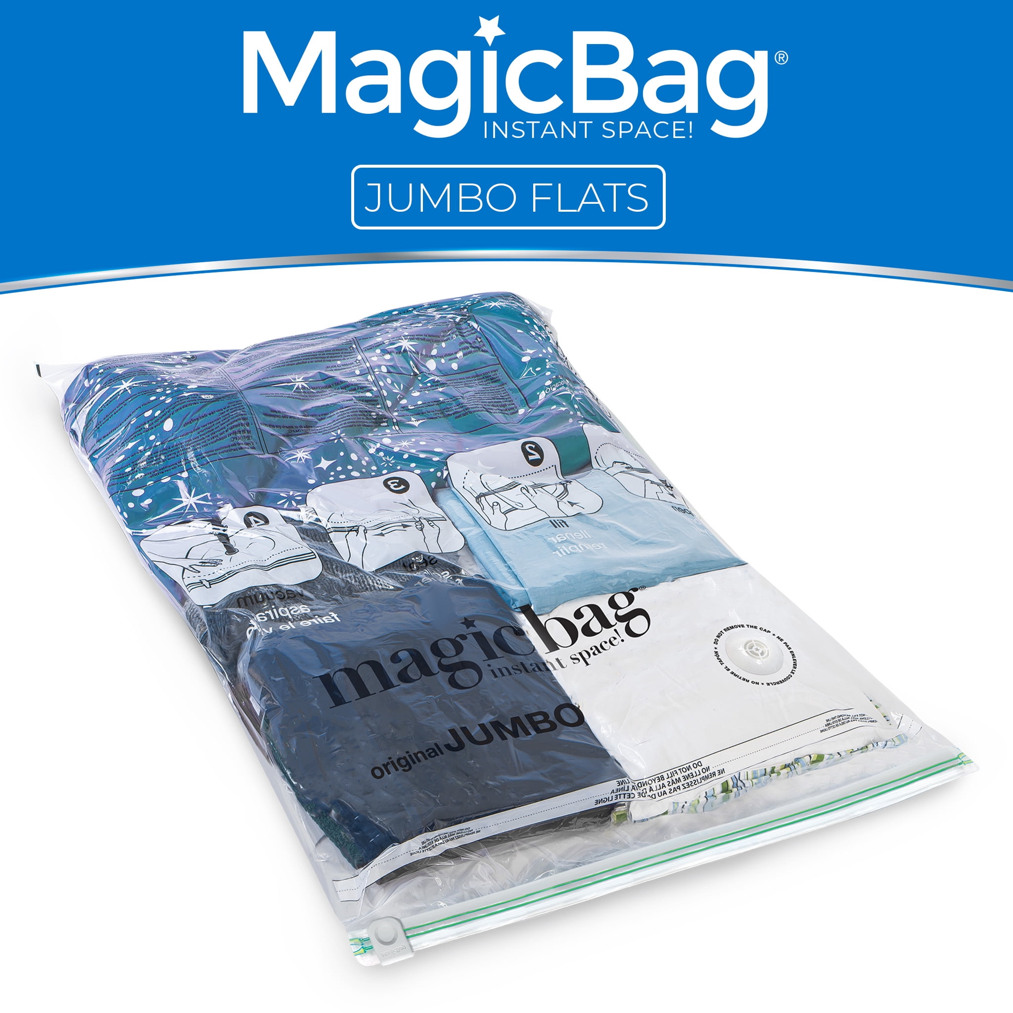 MagicBag are easy to use, simply pack items inside the MagicBag, zip up bag using the easy grip slider, vacuum out air, and store in the closet, under the bed, garage or anywhere in your home. Package includes 4 Flat Jumbo airtight one-way valve that fits almost all vacuum hoses and does not allow air back in. The Flat Jumbo bag can hold up to 2 bedding sets and 4 pillows or is ideal for seasonal clothing, sports garments, jackets, sweaters, comforters, bedding, pillows, & bulky items and keeps items airtight and protected from water, dirt, & odors. Double zipper acts as a safety to keep the airtight seal. MagicBags are reusable and create 3 times more space in your closet, under your bed, in your garage, or in any area of your home.