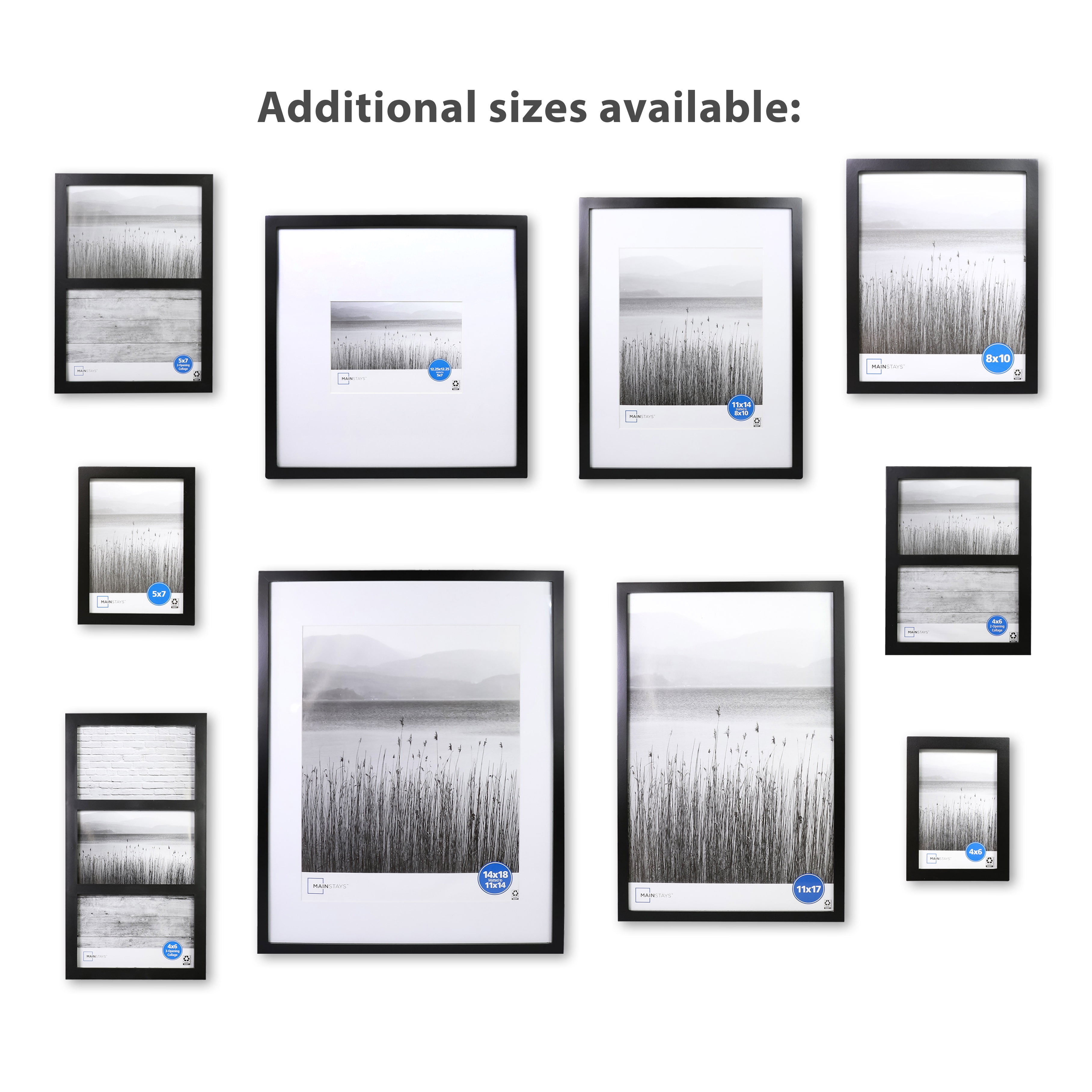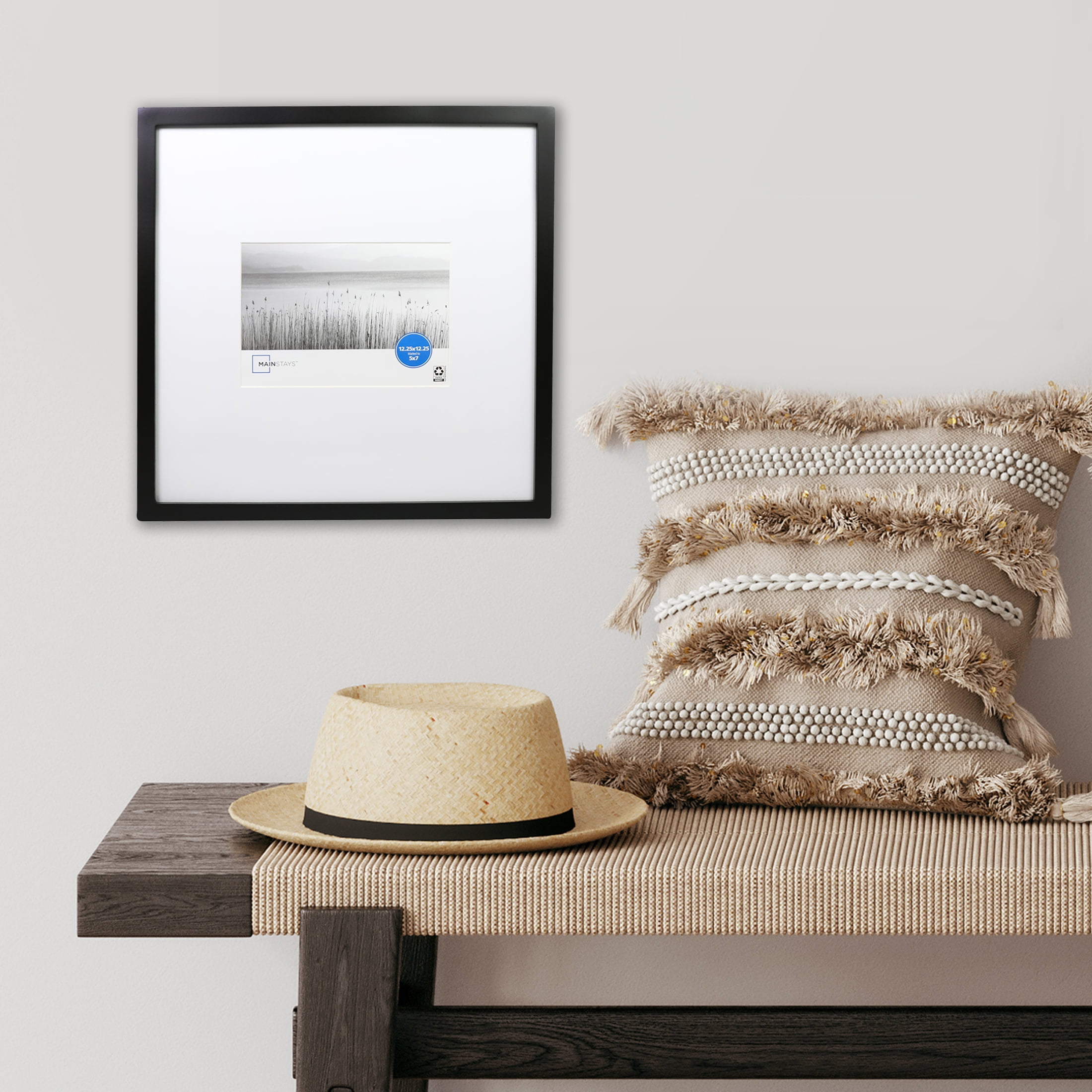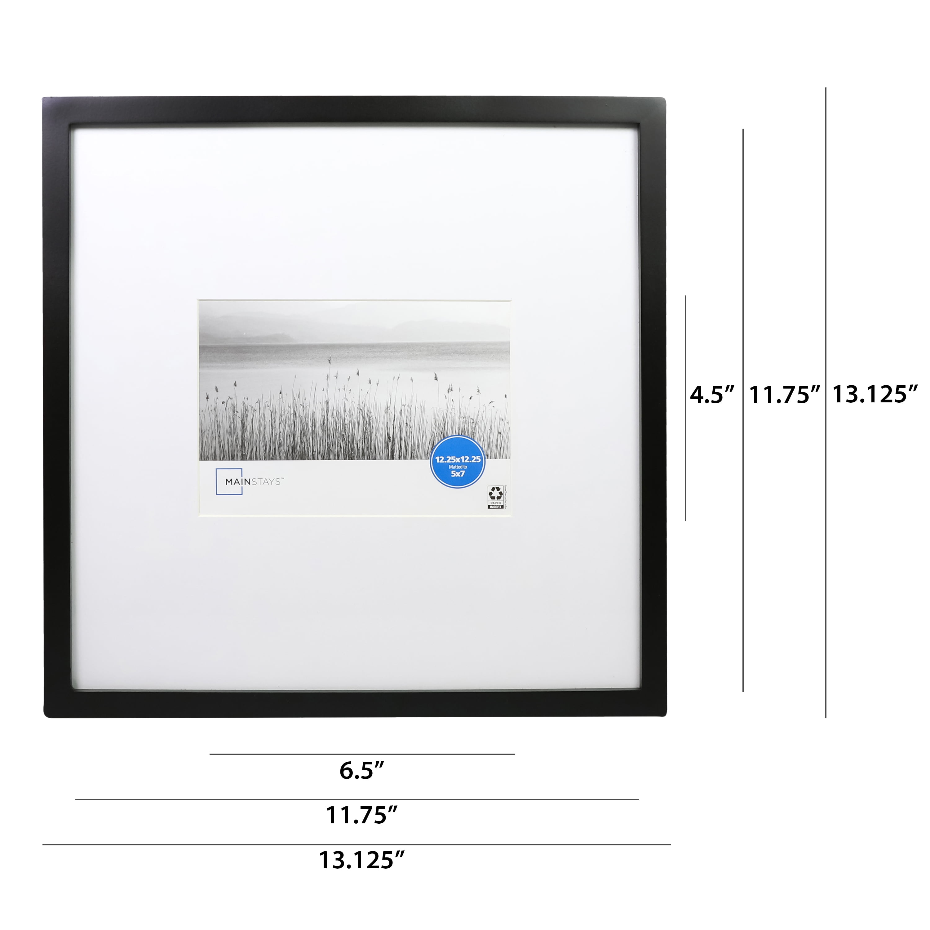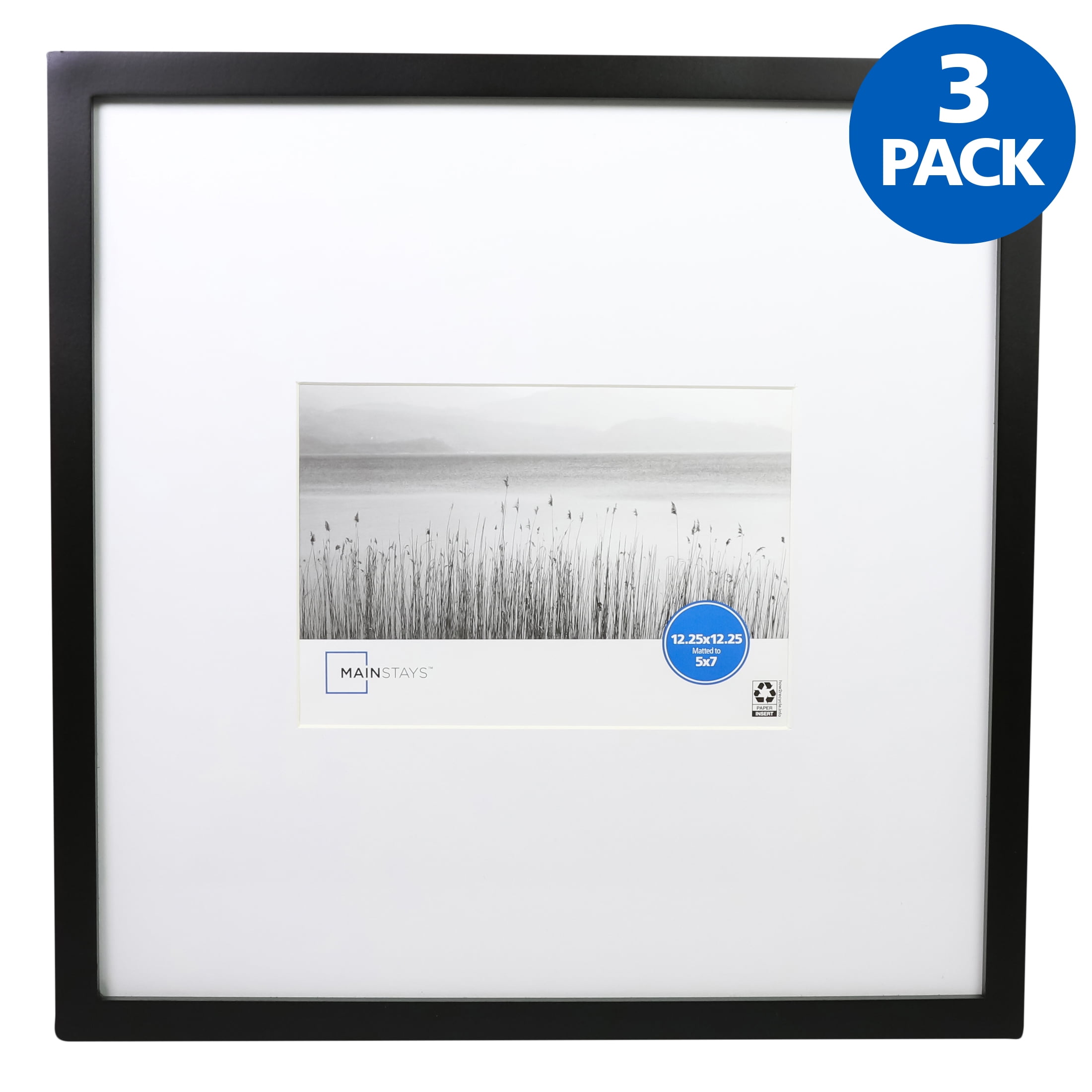 Mainstays 13″ x 13″ Matted to 7″ x 5″ Linear Frame: Each set includes three black 12.75″ x 12.75″ frames to showcase your favorite photographs, artwork or autographs Picture frame pack holds 5″ x 7″ photos matted or 12.75″ x 12.75″ photos without the white mat Wood composite MDF frames Ideal for creating your very own gallery wall look Features a glass front and removable white mat Intended for wall mounting only Set includes 3 pack of classic black square frames