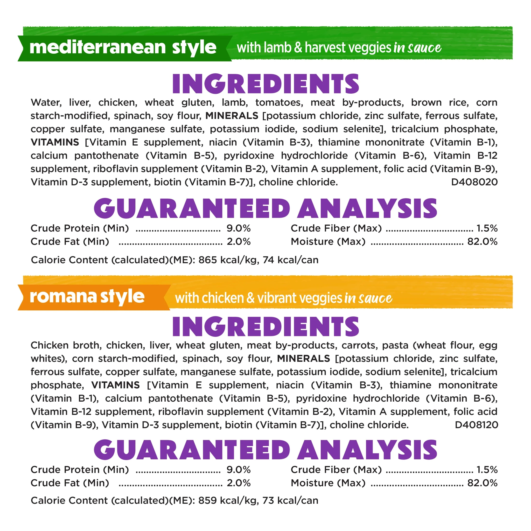 Purina Beneful Medleys Wet Dog Food Variety Pack Chicken Lamb Beef, Dial up the excitement at mealtime with the culinary recipes inspired from around the world in the Purina Beneful Medleys adult wet dog food variety pack. This canned dog food variety pack features some of your pal’s favorite flavors, including Tuscan, Romana and Mediterranean Style. Tender chunks made with real beef, chicken or lamb come together with high-quality ingredients you can see, like real carrots, tomatoes and spinach, and whole grains like pasta. We then drench the premium dog food with generous portions of savory sauce he can’t wait to dive into.
