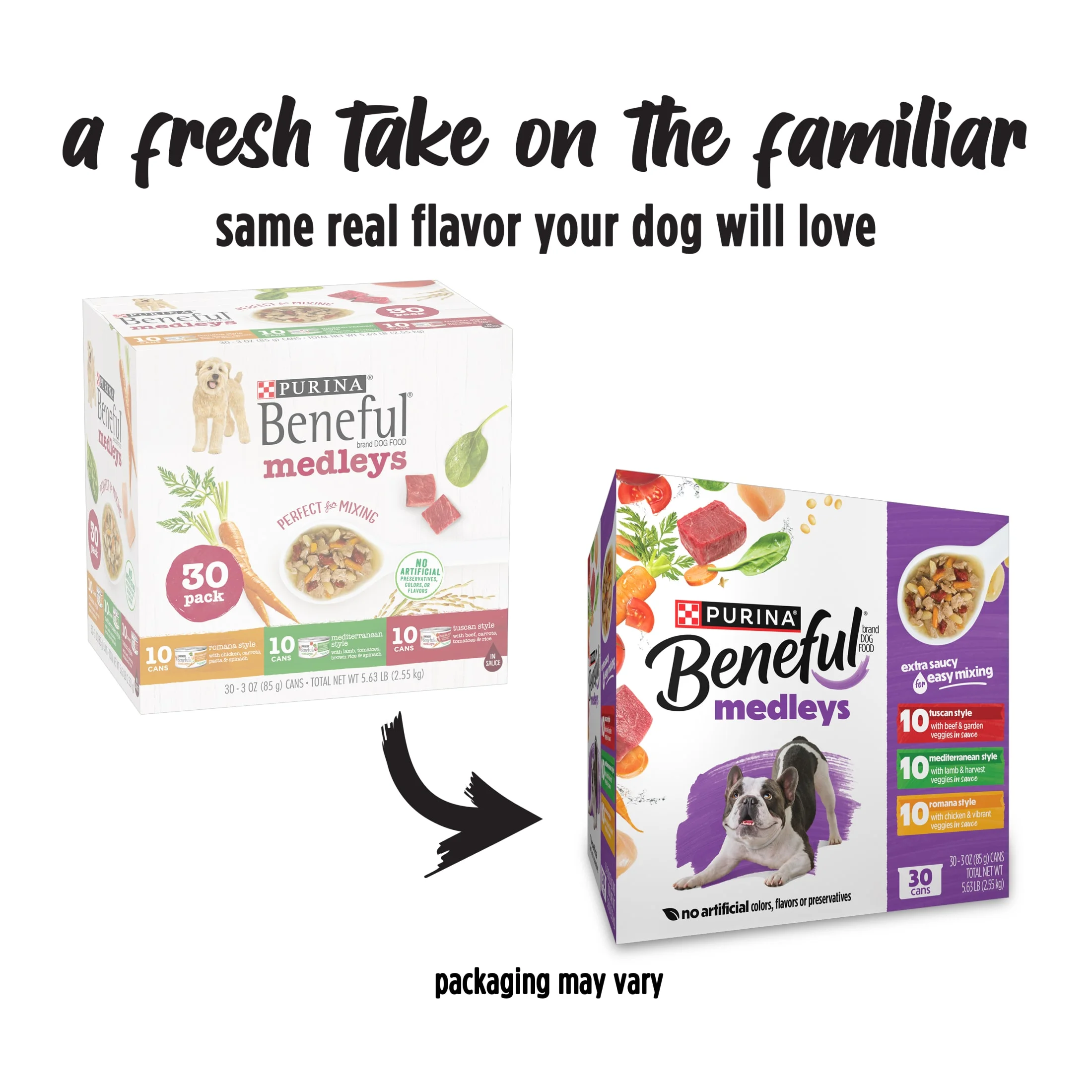Purina Beneful Medleys Wet Dog Food Variety Pack Chicken Lamb Beef, 3 oz Cans (30 Pack) Beneful Medleys wet dog food variety pack features culinary-inspired recipes with real beef, chicken or lamb and real vegetables and grains you can see High protein dog food helps support strong muscles and contains no artificial colors, flavors or preservatives Beneful wet dog food with grain recipes are made with tender, meaty chunks in a generous flavorful sauce perfect for serving as a meal or mixing with his favorite dry kibble Variety pack dog food provides 100 percent complete and balanced nutrition for adult dogs along with 23 essential vitamins and minerals to support his overall health Premium dog food with gravy proudly produced in Purina-owned facilities