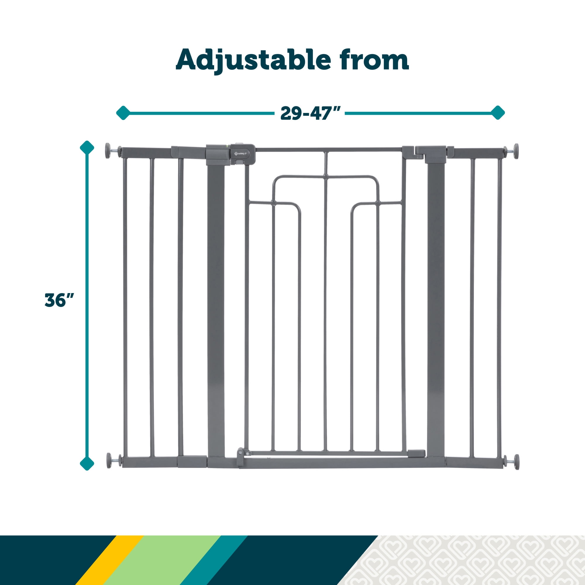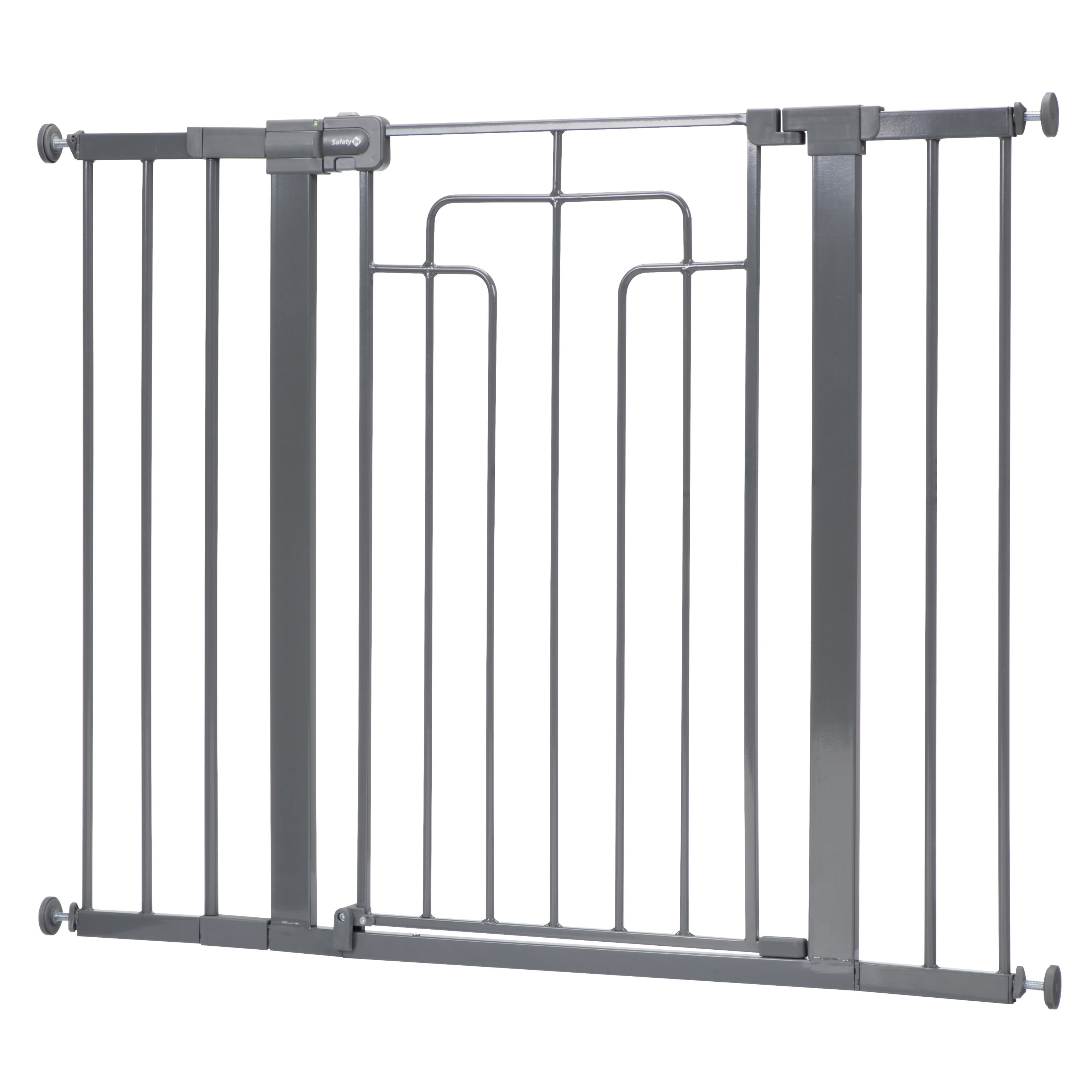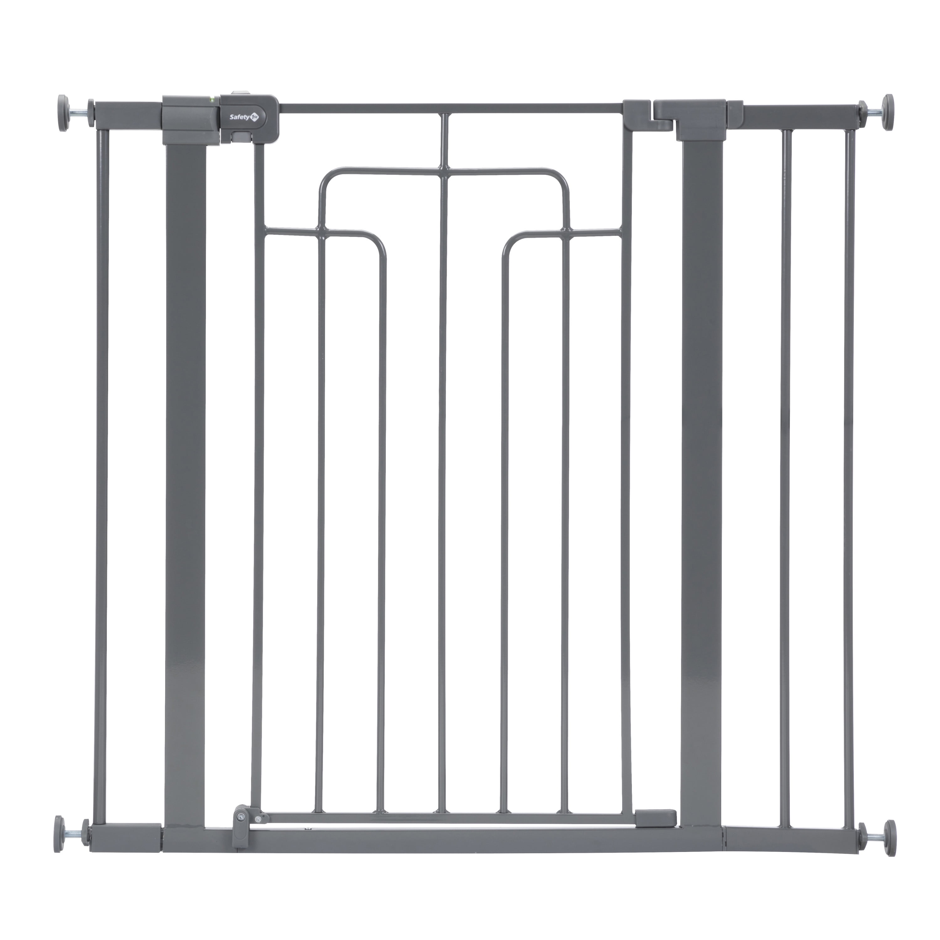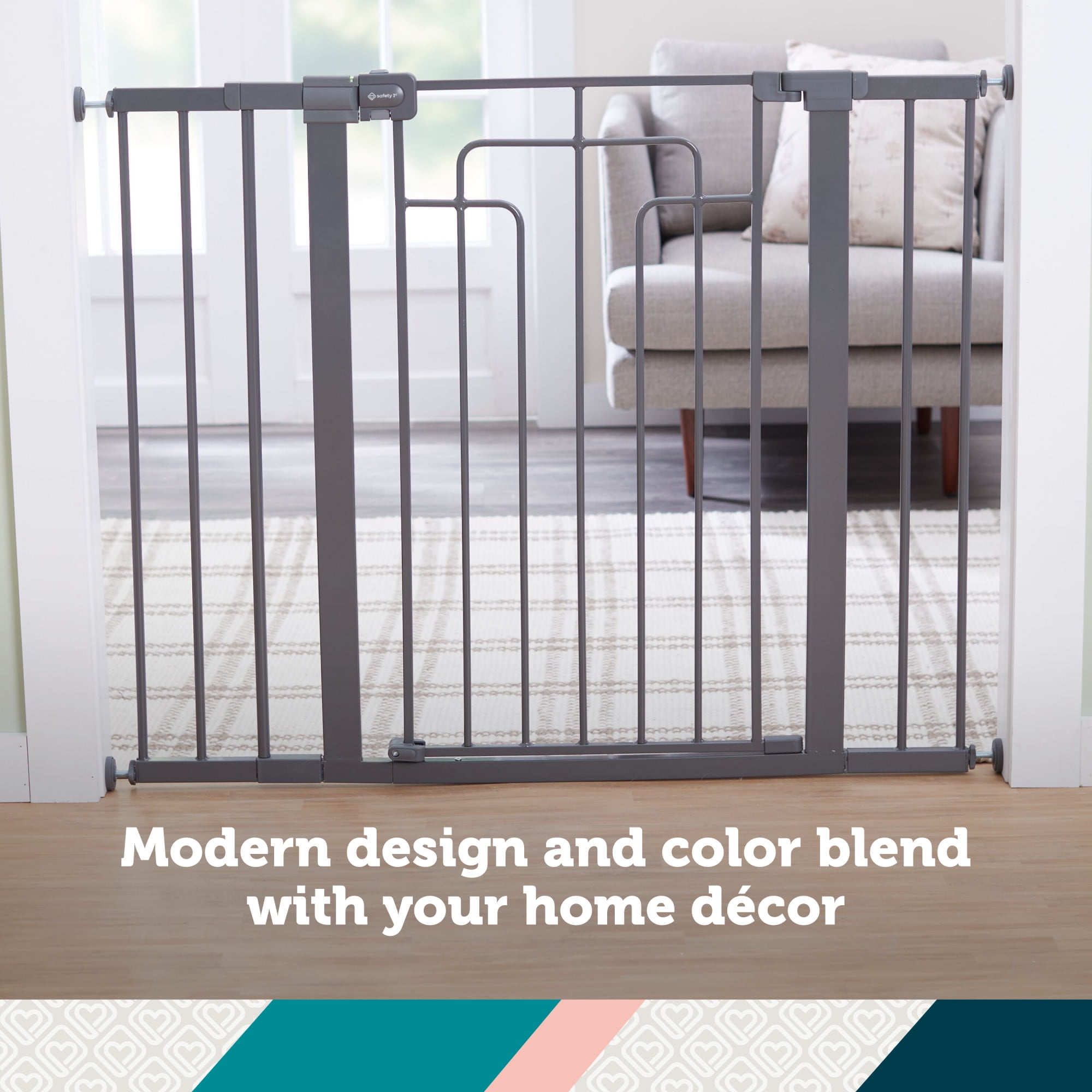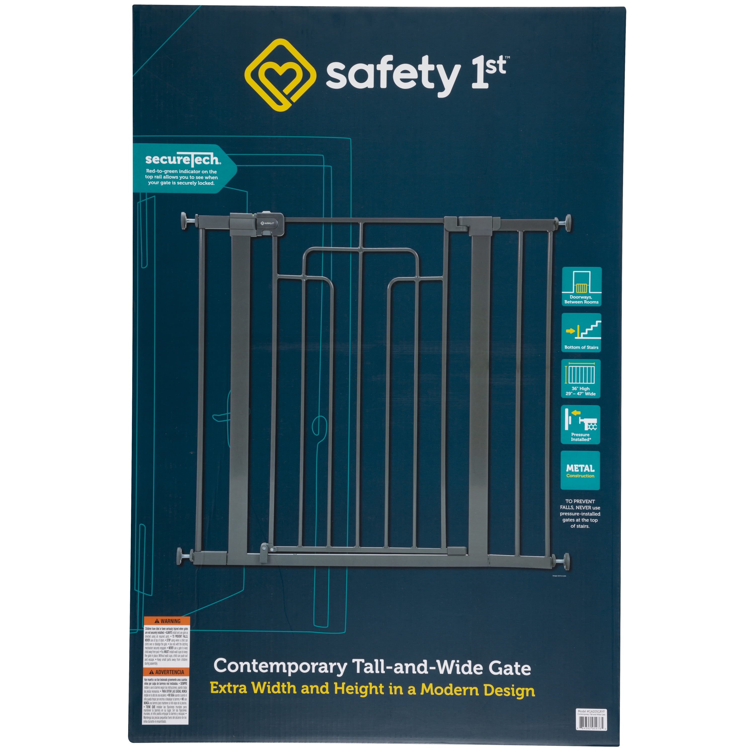 Safety 1ˢᵗ Contemporary Tall-and-Wide Gate, Grey Modern design and color blend with your home décor Quick and easy to install with just one screw Fits most doorways and works between rooms or at the bottom of the stairs Perfect for children 6–24 months Great for pets too 29”–47” wide 36” tall Features SecureTech®, Safety 1st’s red-to-green indicator on the top rail that allows you to see when your gate is securely locked Note: When the gate is uninstalled, the frame may appear bent. This is normal. The frame is constructed in this manner to provide pressure to remain in place when installed properly.