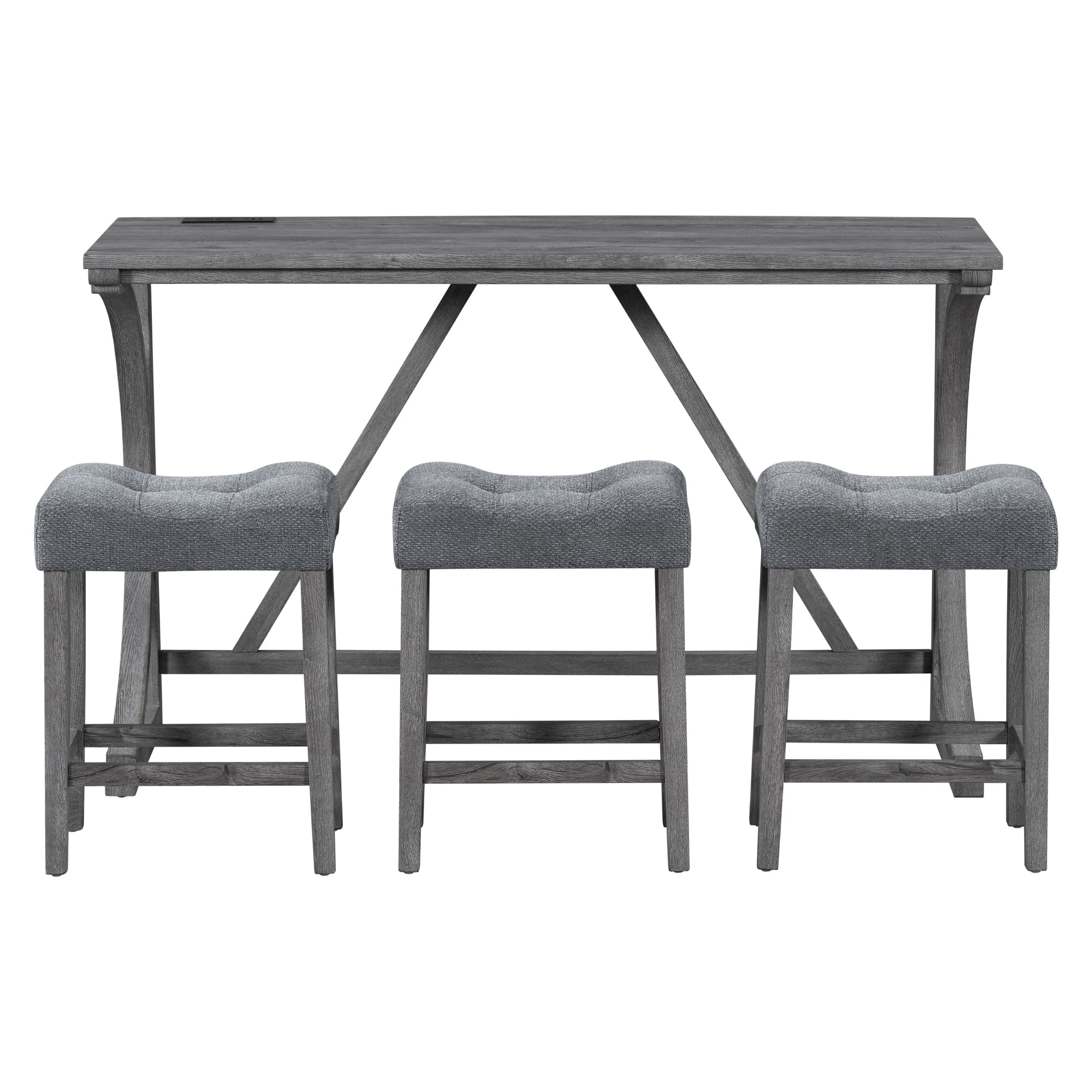 4 Piece Bar Table Set with Power Outlet,Industrial Style Dining Table Set for 3,Breakfast Table and Chairs Set for Living Room,Dining Room, Game Room,Gray