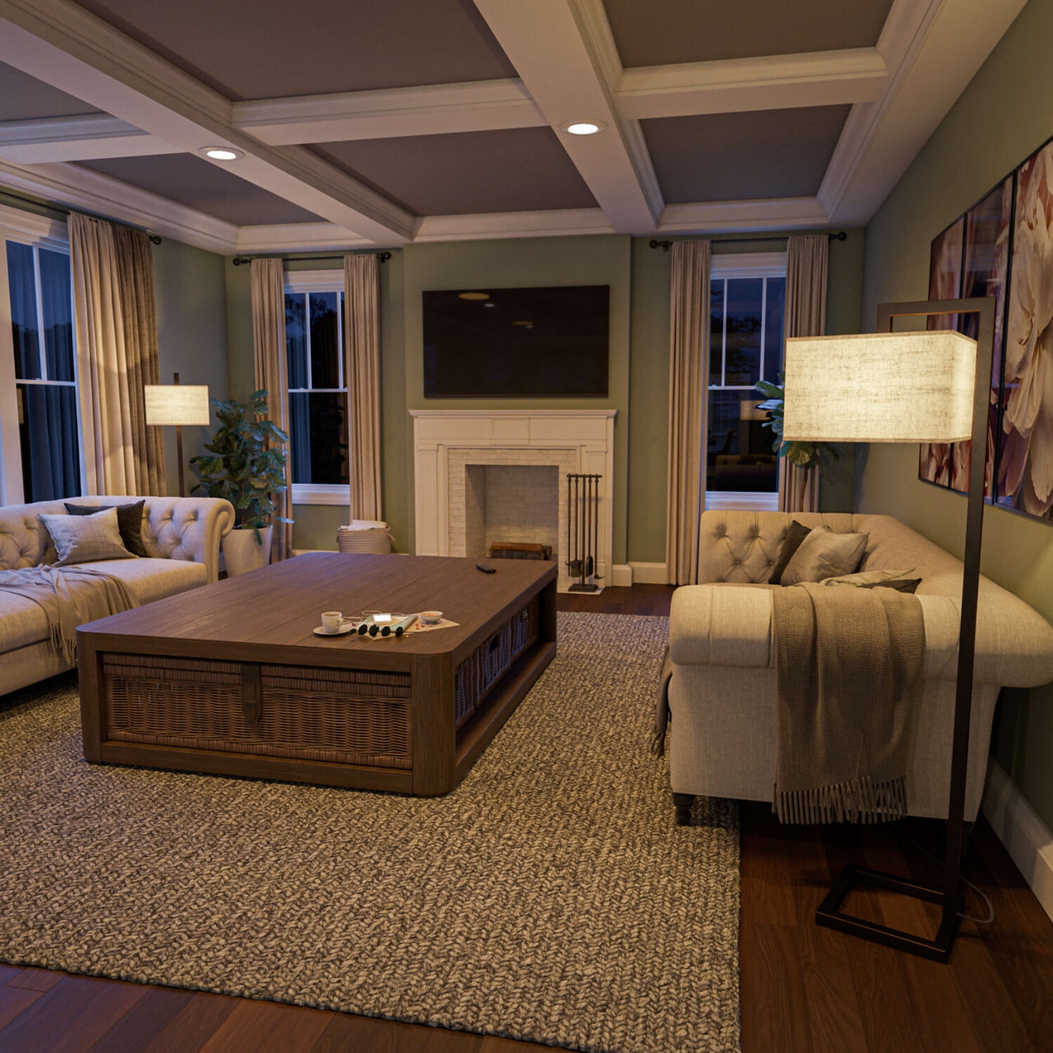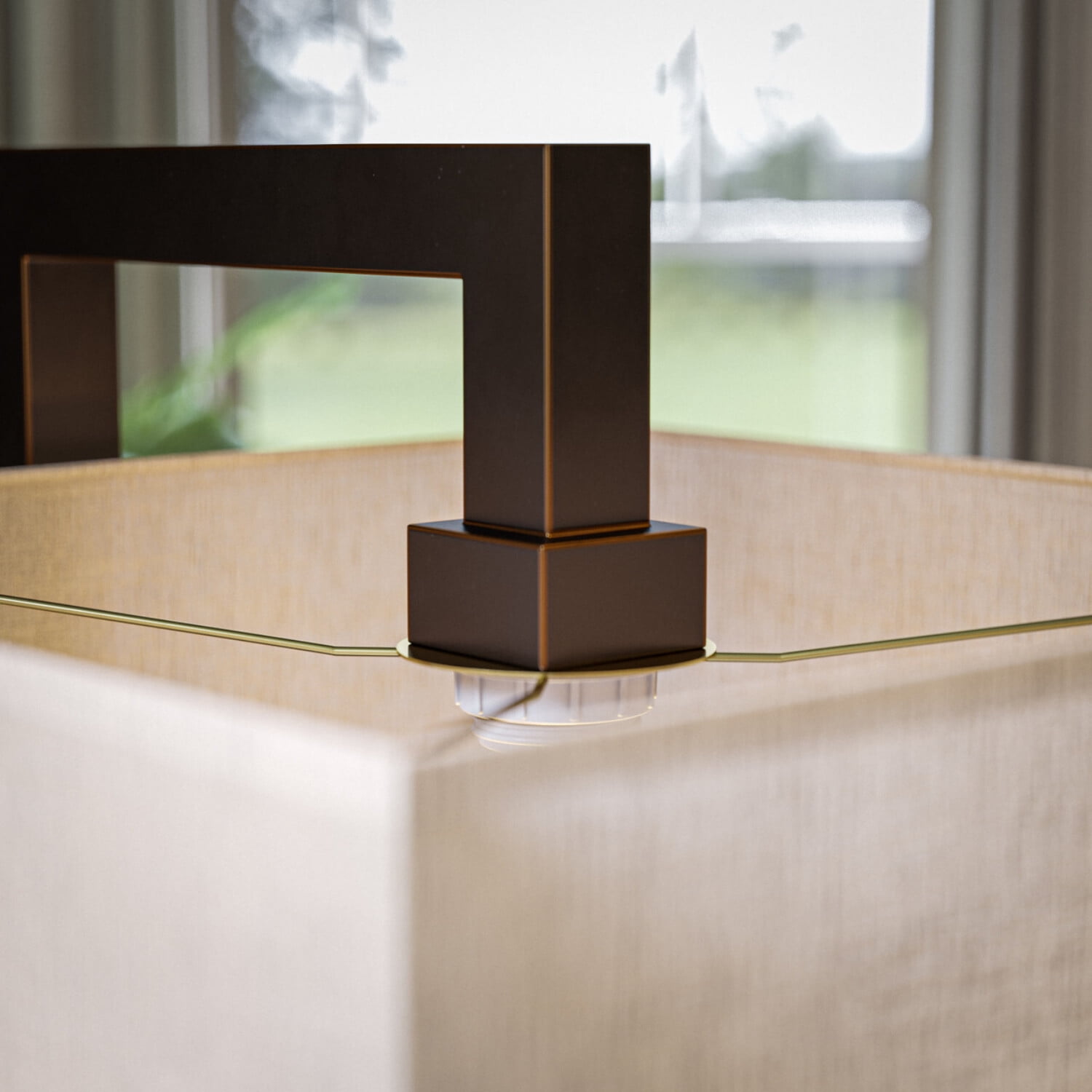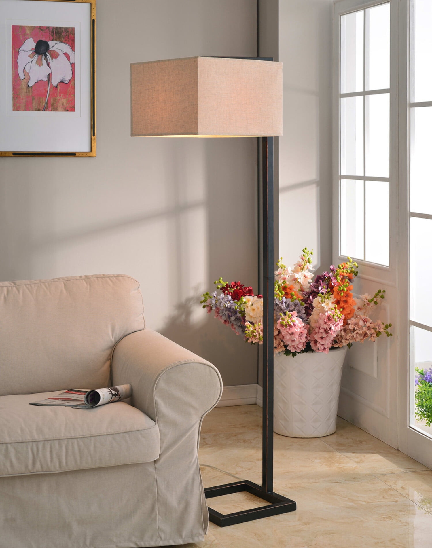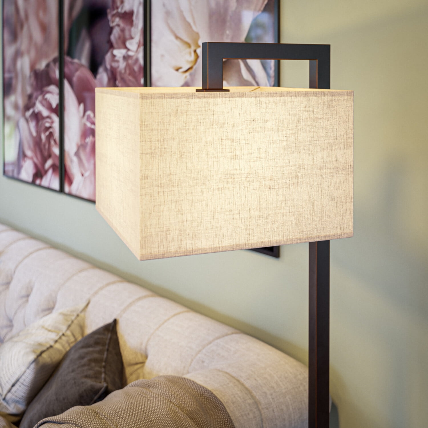 Geometrically Modern: Endlessly modern with a geometric profile and a contrasting color palette, this contemporary floor lamp features a dark oil-rubbed bronze finish and a unique square-shaped tan fabric shade that complements your transitional home décor. Dimensions: 64 Inch Height, 15 Inch Width, 17.5 Inch Ext; Requires 1-150 Watt Maximum Medium Base Bulb or LED Equivalent; Convenient On/Off Foot Switch Lighting Profile: When illuminated, the tan square shade casts a calm area filling light; great for ambient living room and bedroom lighting, exceptional for reading and soft end of day relaxing light Alexa Compatible: works with Amazon Alexa compatible smart plugs for on/off voice activated operation (Amazon Alexa and smart plugs sold separately) Foot