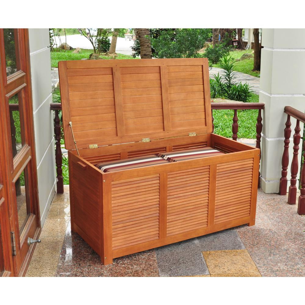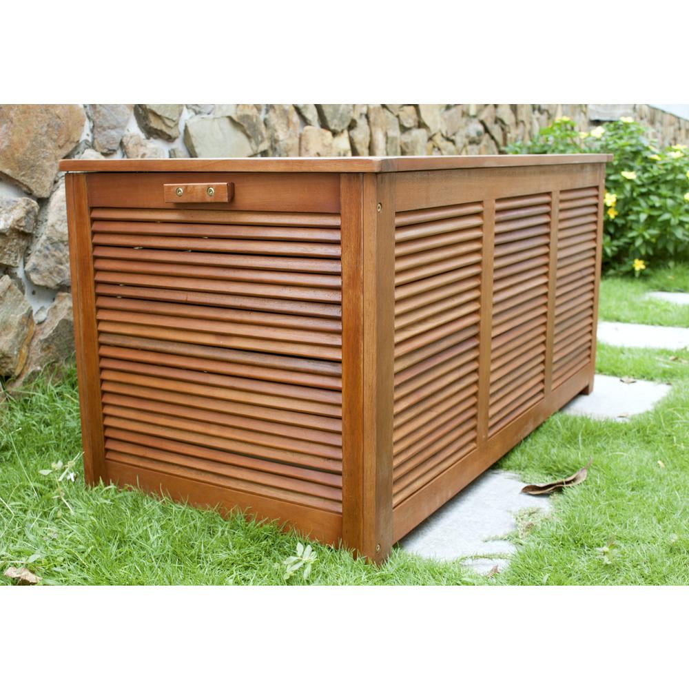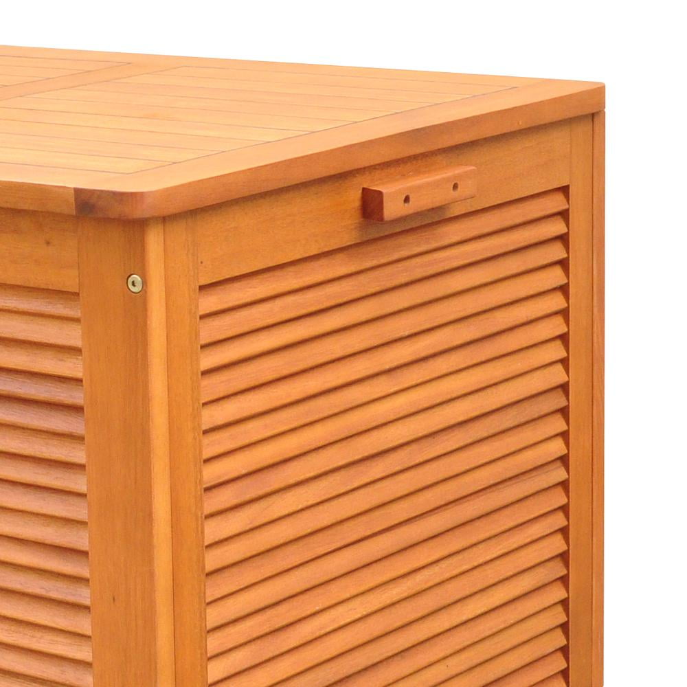 Keep your stuff organized and enjoy a clutter-free living space! The top panel uses a water-proof silicone sealant to shield the interior contents from rain. Each panel features a shutter slat design, which is very stylish and eye-catching. The interior is spacious and ideal for protecting your outdoor cushions from fading or soaking in the rain when not in use. Made entirely from Eucalyptus hardwood, this storage bench will grace your patio for a long time. Features: Cushion storage box Easy assembly; hardware and instructions included Water-proof silicone sealed top with hardware intended for outdoor use Protects patio cushions form fading in the sun or soaking in the rain Durable and functional outdoor storage box Made from Eucalyptus hardwood with an oil-based stain Dimensions: 23.62″H x 48.62″W x 23.62″D Material(s): hardwood
