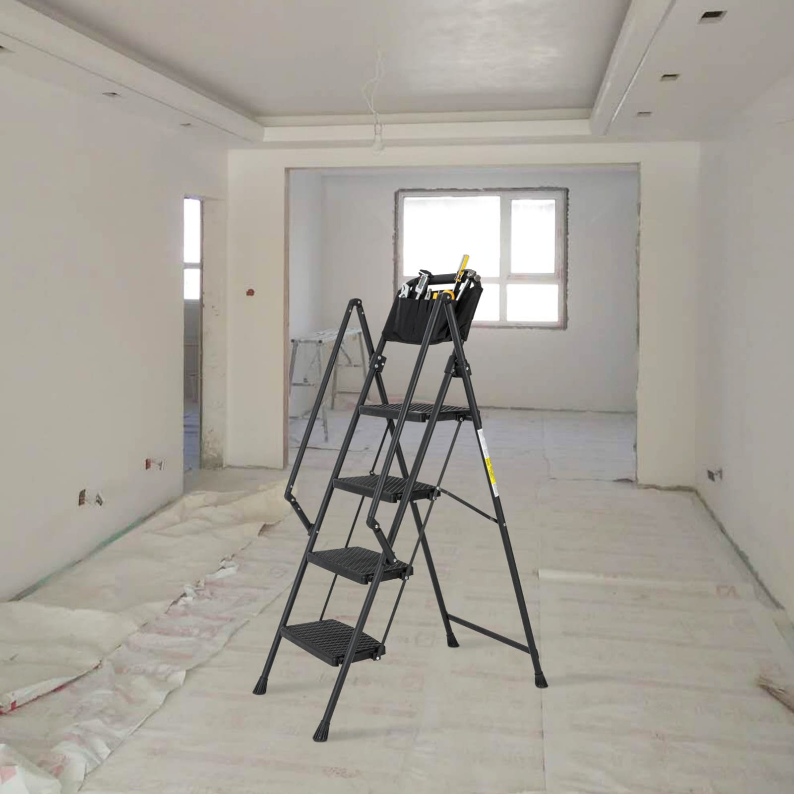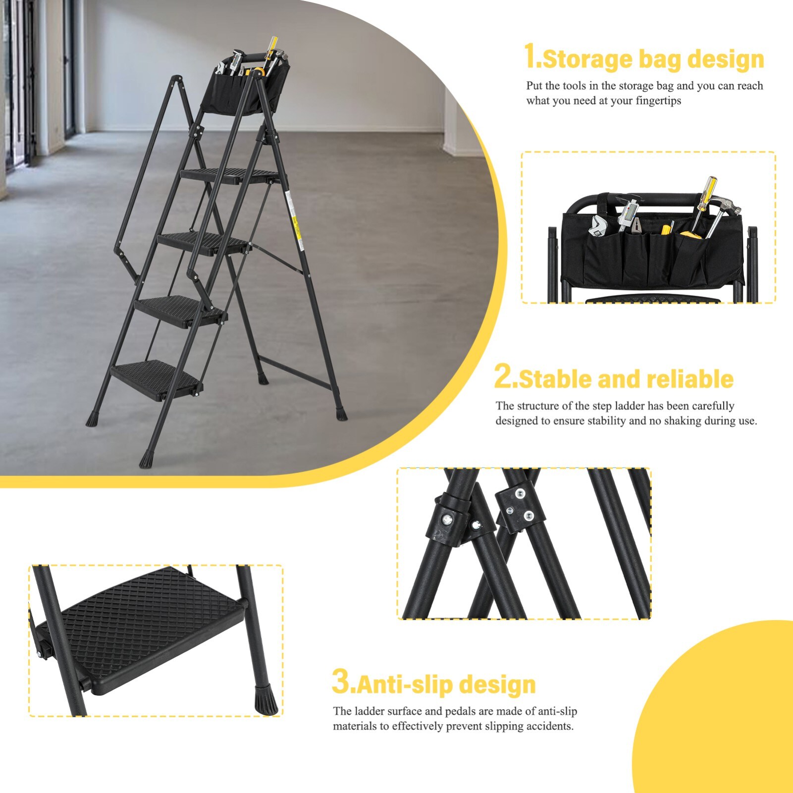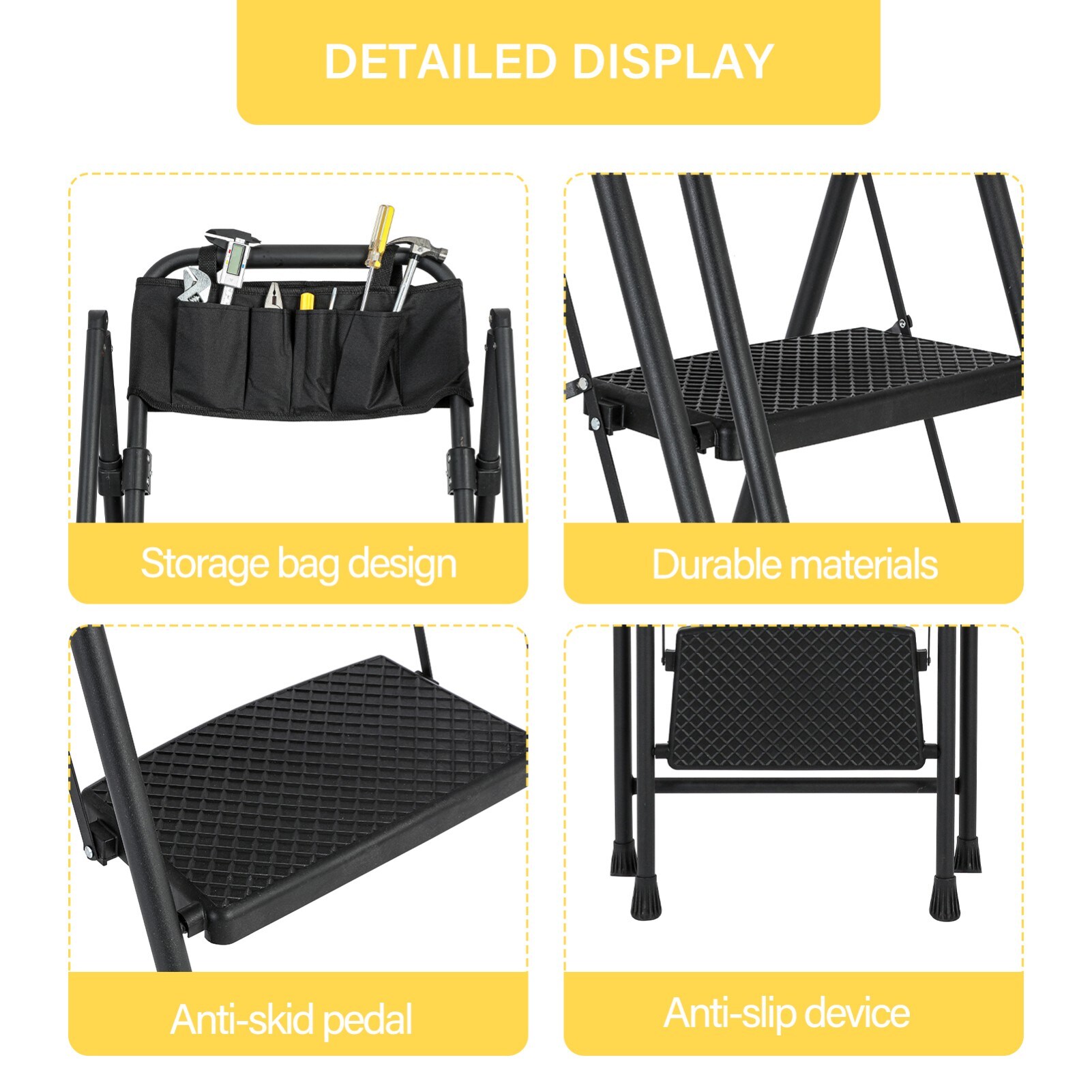 Introducing our exceptional ladder, designed with your safety and convenience in mind! Crafted with a high-strength steel frame, it offers durable construction and a 550lb weight capacity. The anti-slip pads and pedal ensure stability and safety on various surfaces. The sponge handle makes it easy to carry, while its versatile use extends beyond traditional ladder tasks. Portable and space-saving, it’s a must-have. Plus, the storage bags enhance work efficiency at heights.