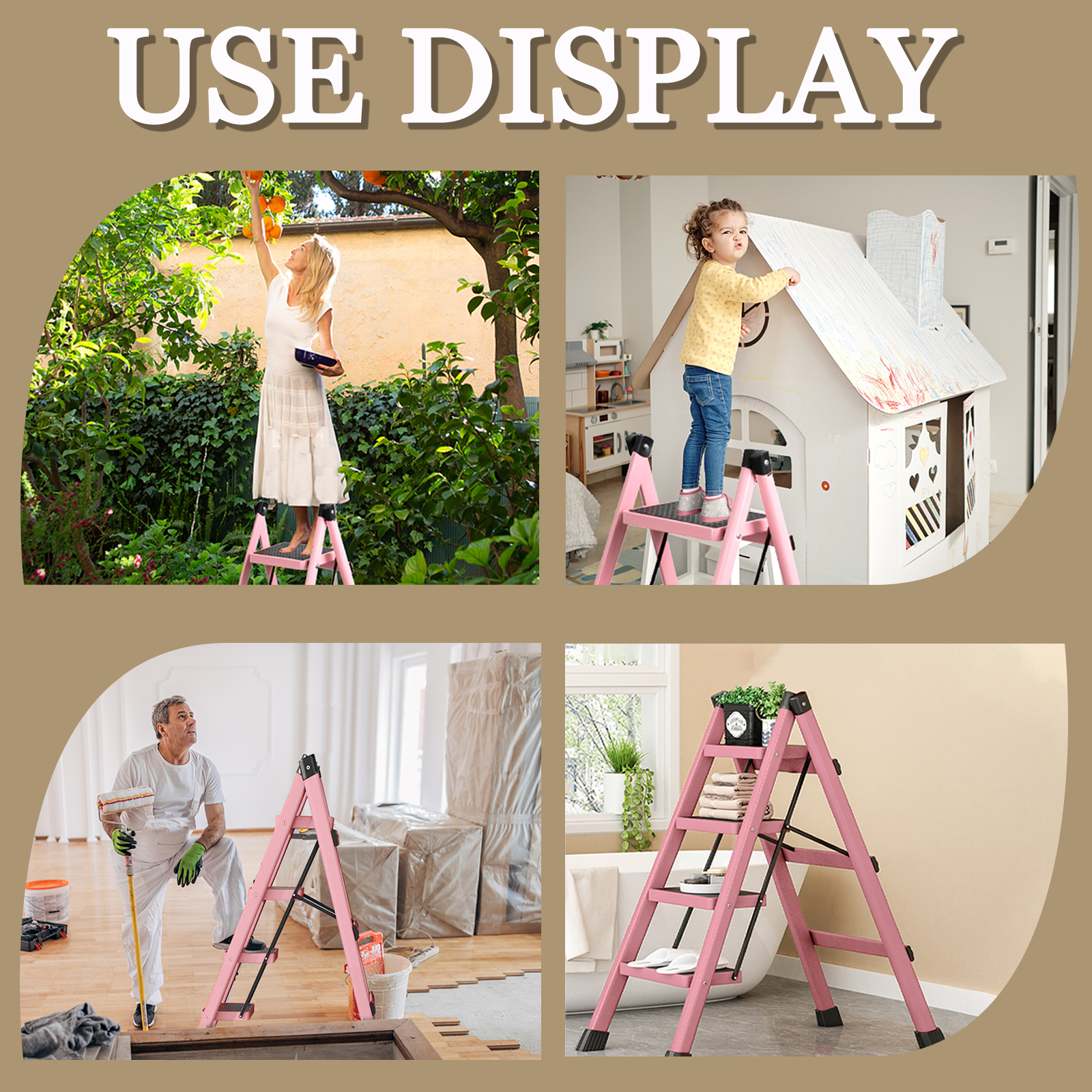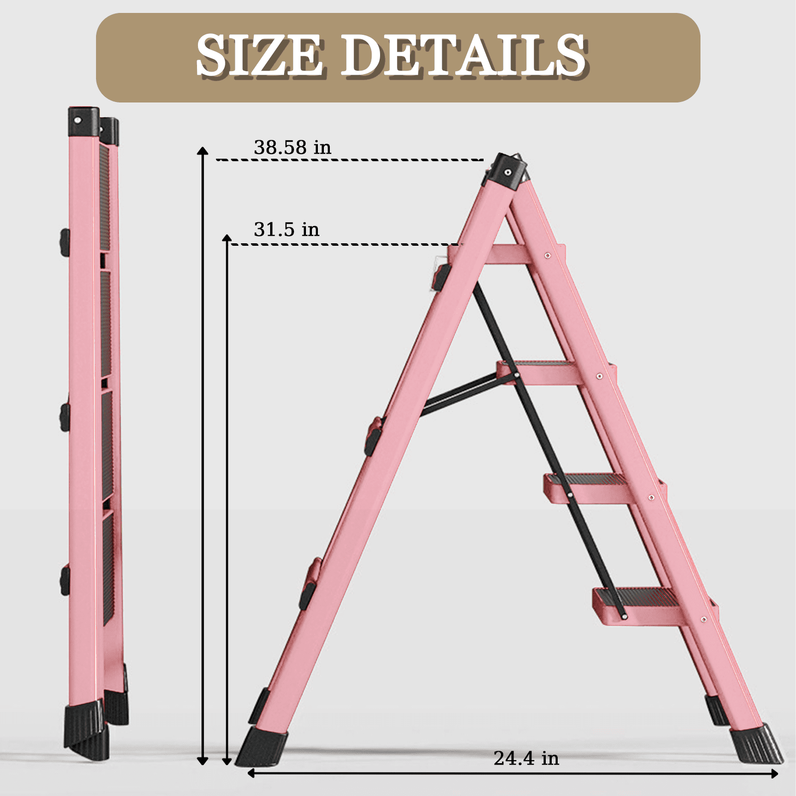 【MULTI-USE STEP STOOL LADDER】The step stool ladder is a great tool for home improvement & festival decorations. You can use it as a shelf for books, clothes at home, or flowers in the garden. Ideal for indoor and outdoor activities, gardening, kitchen, and painting. It is also a small step stool for kids or can be used as a ladder or pet stairs. 【SECURITY AND STABILITY】 Our 4-step ladder has designed the step ladder with stable triangular frame, widened pedals & thickened beams for reliable support.The surface has been treated to make it wear-resistant and rust-proof. High- grade frame and structure make your use secure and stable.The side cross brace structure strengthens the basic support, making you feel safer when using the step ladder (even on the top pedal). 【ANTI-SLIP PEDAL and SUPPORT FEET】All pedals are 7” wide with non-slip textures for your safety when climbing the closet step ladder. all 4 legs have non-slip rubber caps to ensure that the ladder remains stable while you perform high-up tasks and there is no noise when moving it. 【ULTRA LIGHTWEIGHT & SAVE SPACE】A lightweight, foldable design, convenient storage and transportation. Very easy to move around indoors. Folds to only 1.9″ thickness – ideal for storing away to fit in a narrow place under the bed or in a corner. 【FOLDABLE STEP LADDER】The ladder is featured with triangular support and can load up to 330lbs. Folded (L x H x W): 40.94” x 18.5” x 1.9”, Unfolded (L x H x W): 38.58”x 24.4” x 16.3”. The foldable design makes it easier to use and carry