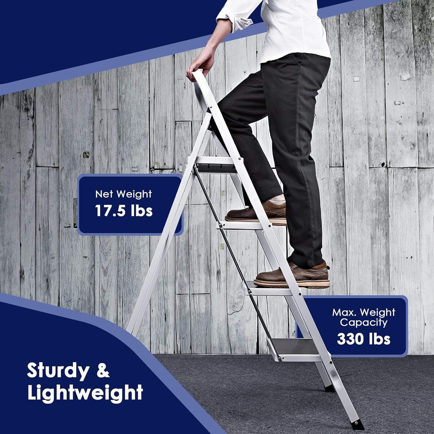【FOLDABLE STEP SLADDER】The ladder’s foldable design allows for easy portability, with folded dimensions of 55.3’’ x 18.5’’ and unfolded dimensions of 50.4’’ x 18.5’’ x 32.5’’. And foldable desig can place it in the washroom, narrow spacing, or behind a closet with ease. You also can hang it on the wall in the pantry when not using it. 【ANTI-SLIP DESIGN】You can easily find our pedals thicker and wider, and the anti-slip line is deeper. This can increase your sense of security. Thickened rubber feet fully touch the ground to keep the ladder stable when in use, and can effectively prevent scratches on the floor. The top handrail can give you extra support when climbing. 【WIDEN NON-SLIP STEPS】This aluminum step ladder has 7.9″ X 11.8″ large pedal steps. The pedals also have a specially designed grip texture that is anti-slip and safe to hold. 【SAFETY HANDRAIL ON TOP】A handrail at the top is great stability for tall ladders, which means you can climb all the way up to the top and climb down without a problem. 【Versatile Step Stool】Convenient 4-step ladder provides multi-use to reach high-up spaces, ideal for indoor kitchens, bathrooms, offices, or outdoor garages.