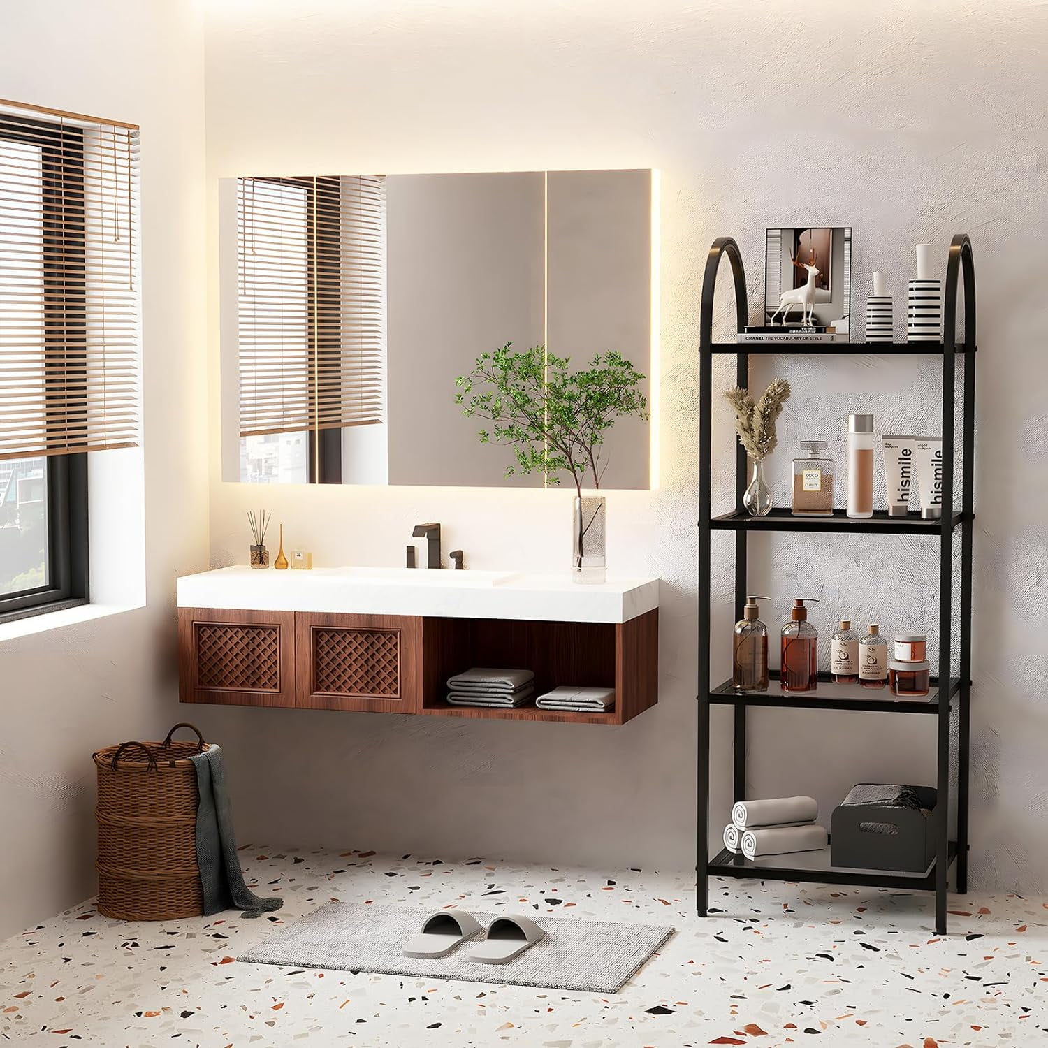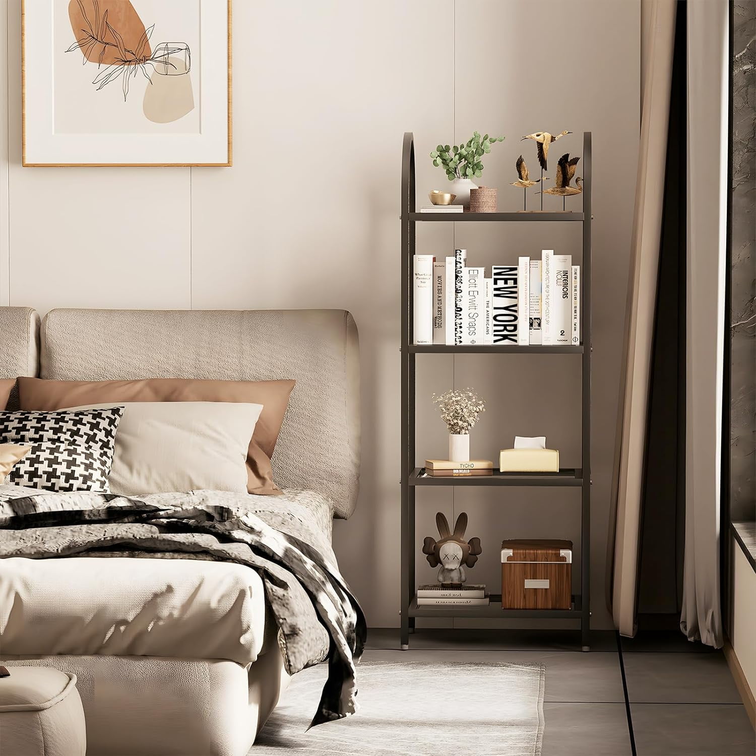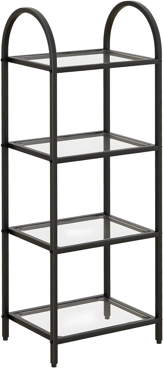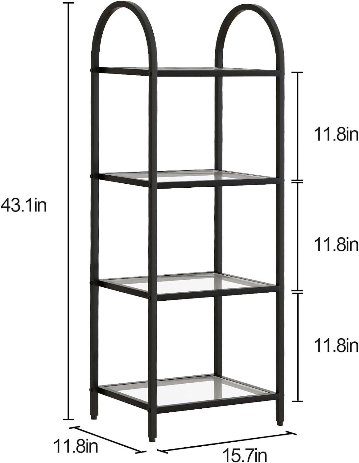 【Sturdy and Strong】The book shelf is made of a metal frame and tempered glass, and each shelves can hold up to 44.1 pounds. It has good stability and load-bearing capacity and is very durable. 【4 Tiers to Maximize Space】 This 4-Tier narrow bookshelf takes up only 11.8″ D x 15.7″ W floor space, and the 37.4″ height allows you to take full advantage of the vertical space for storage. 【Versatile & Convenient】You can use this glass shelf to store and display books, decorations, plants, towels and other items. It is suitable for placing in the living room, bedroom, bathroom, study and other Spaces. 【Elegant design】The top of this small bookshelf features a unique arch design for a slim and elegant look. No matter where it is placed, it can decorate the space well and show the owner’s taste in style. 【Easy Assembly & Cleaning】The package comes with installation instructions, hardware and installation tools so you can easily assemble it in 15 minutes. Daily only need to gently wipe, it can be as clean as new.