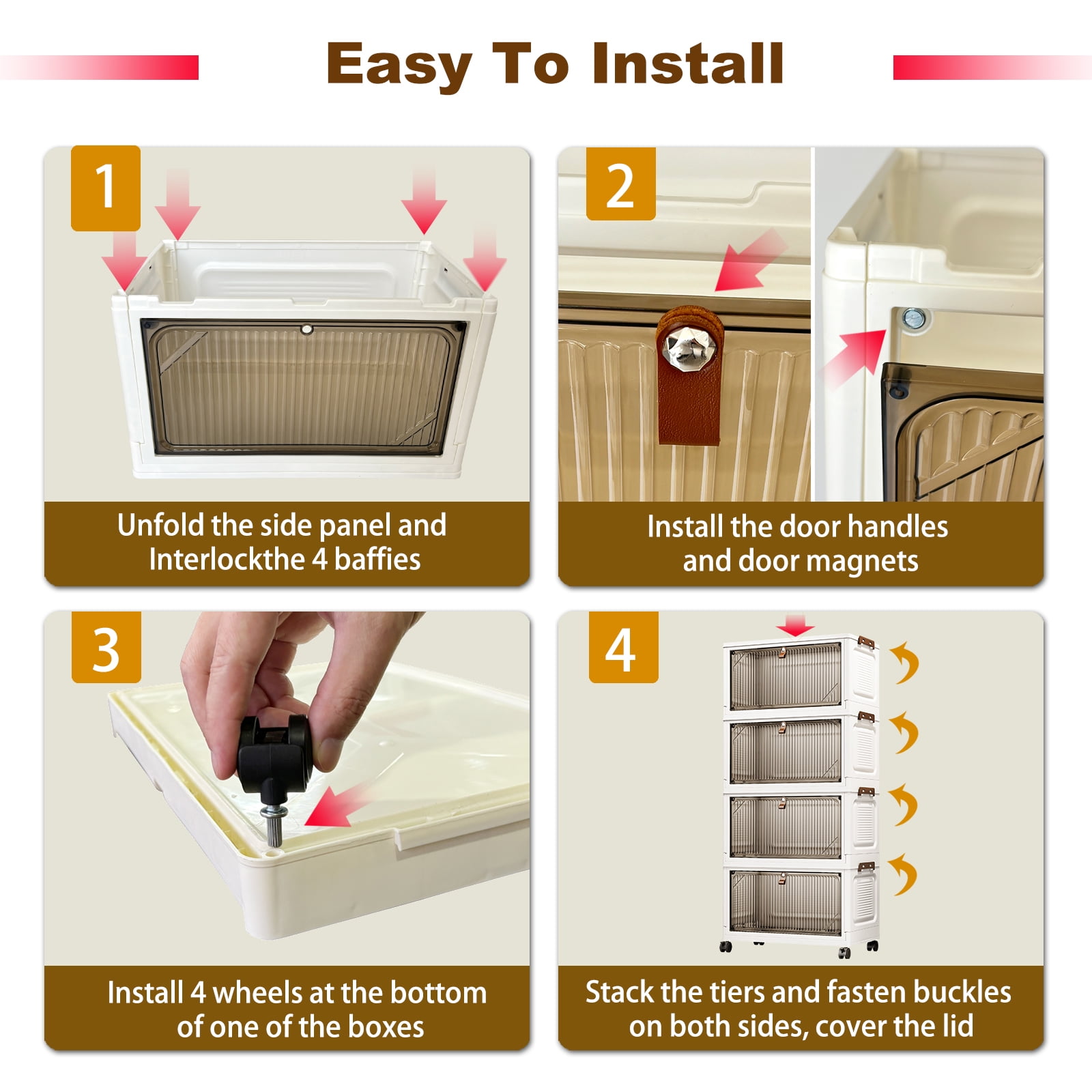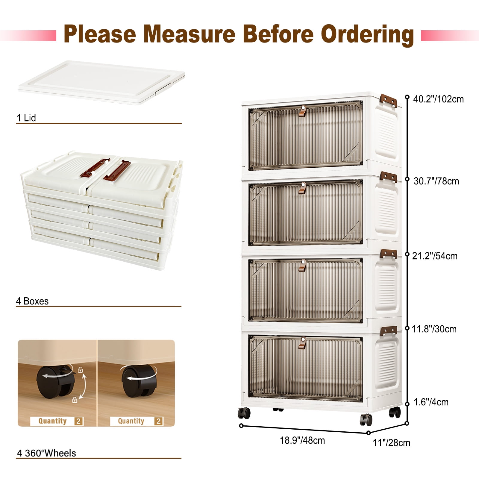 【4-Tier Reinforced Structure with Safety Lock】Equipped with locking system on the side to lock the box when stacking, preventing the organizer from tilting or slipping, 200% safer than standalone storage cabinets. 【Sturdy Magnetic Flap Door + Leather Handle】Upgraded 800GS magnetic attachment system (average 500GS for similar products) ensures the door close tightly. delicate leather handle is non-slip, durable and comfortable to touch. 【Intelligent Mobility System】4 bottom 360° universal wheels (2 with brakes) with a weight capacity of up to 50 lbs/layer for smooth movement on carpet/hard floors. 【Vertical Space Optimizer】40.2″(102cm) of height optimizes vertical space in closets/corners, and the 5-tier construction provides a total capacity of 144 quarts. Total size: 18.9″ L * 11″ W * 40.2″ H, perfect for storing small or lightweight items. (Note: only one top lid). 【Ready-to-Use, Fast Folding】 No assembly required, ready to use, folds in 10 seconds, folds to a thickness of 2.2 inches in a single box, easy to store under beds, cabinets, corners.
