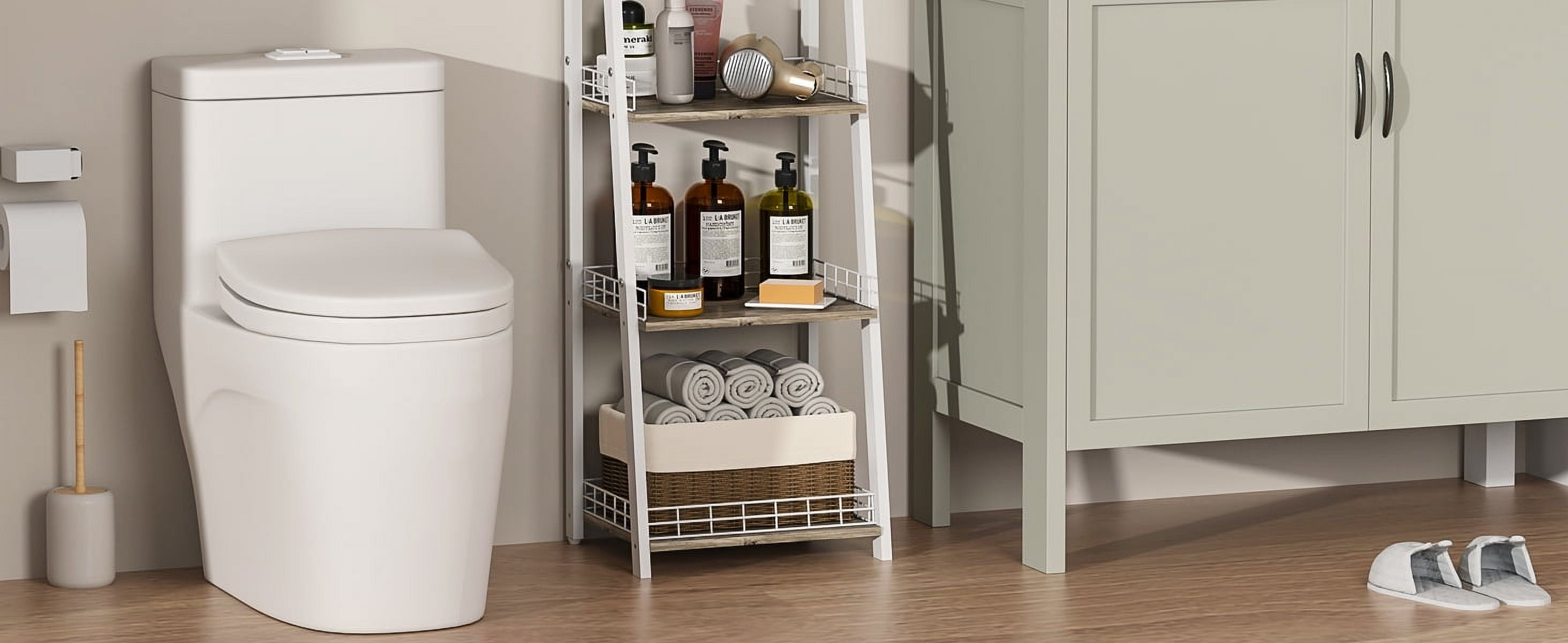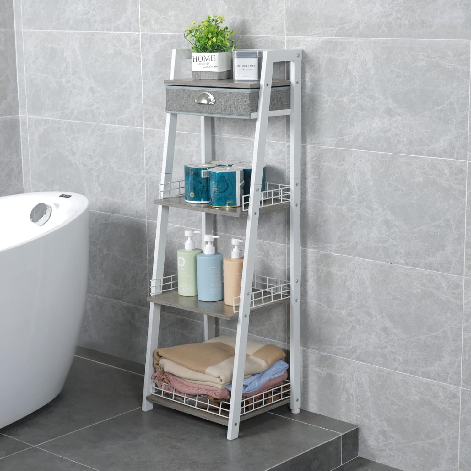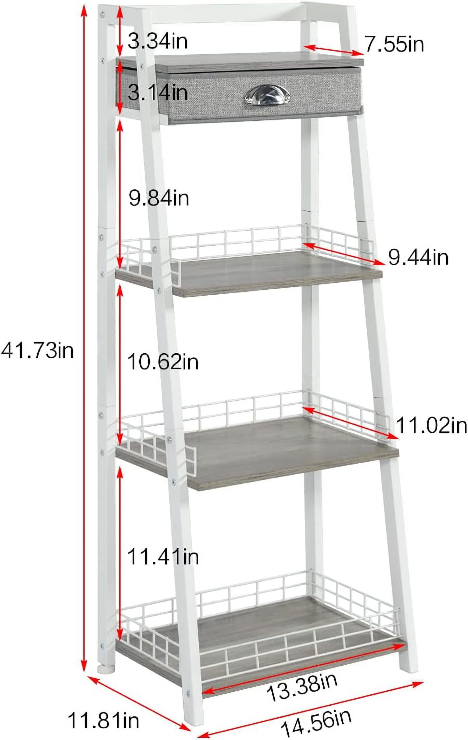 Drawer Stucture Bookshelf : It can be used to put combs, earrings and other small parts. Adjusting Feet Ladder Shelf with Drawer: Easily adjust end table height on uneven surfaces and enhancing stability. Retro style MDF Display Shelf: Made of by medium density fiberboard,more stable.Elegant performance let it easy fit any where in your home, like kitchen,bathroom, living room, bedroom, entryways, hallways, balcony etc. Fence Design Bathroom Shelf: 3 Tier shelf with Side and back iron wire prevents items from falling out. Our bathroom ladder shelf is made of high quality material, which is not easy to rust and is very durable. Large Storage Capacity Bookcase Bathroom Ladder Shelf: Modern ladder book shelf provides ample space for storing any items you want to collect and display. The 3/4 boards of the book shelf get wider from top to bottom can be used to display or store plants, photos, books, CDs, ornaments, collections. Easy to Assemble Bathroom Storage: This tall storage rack organizer attached with easy-to-follow instructions, marked parts and necessary tools, and the screw holes are pre-drilled for easy assembly. Features-Sturdy, Stable, Stylish, Safe Standing Shelves. Rustic Freestanding Storage Shelves Meets All Your Needs Easy to Assemble Laundry Room Shelves: All the necessary elements for assembly are included together with the Easy-To-Read Instructions.