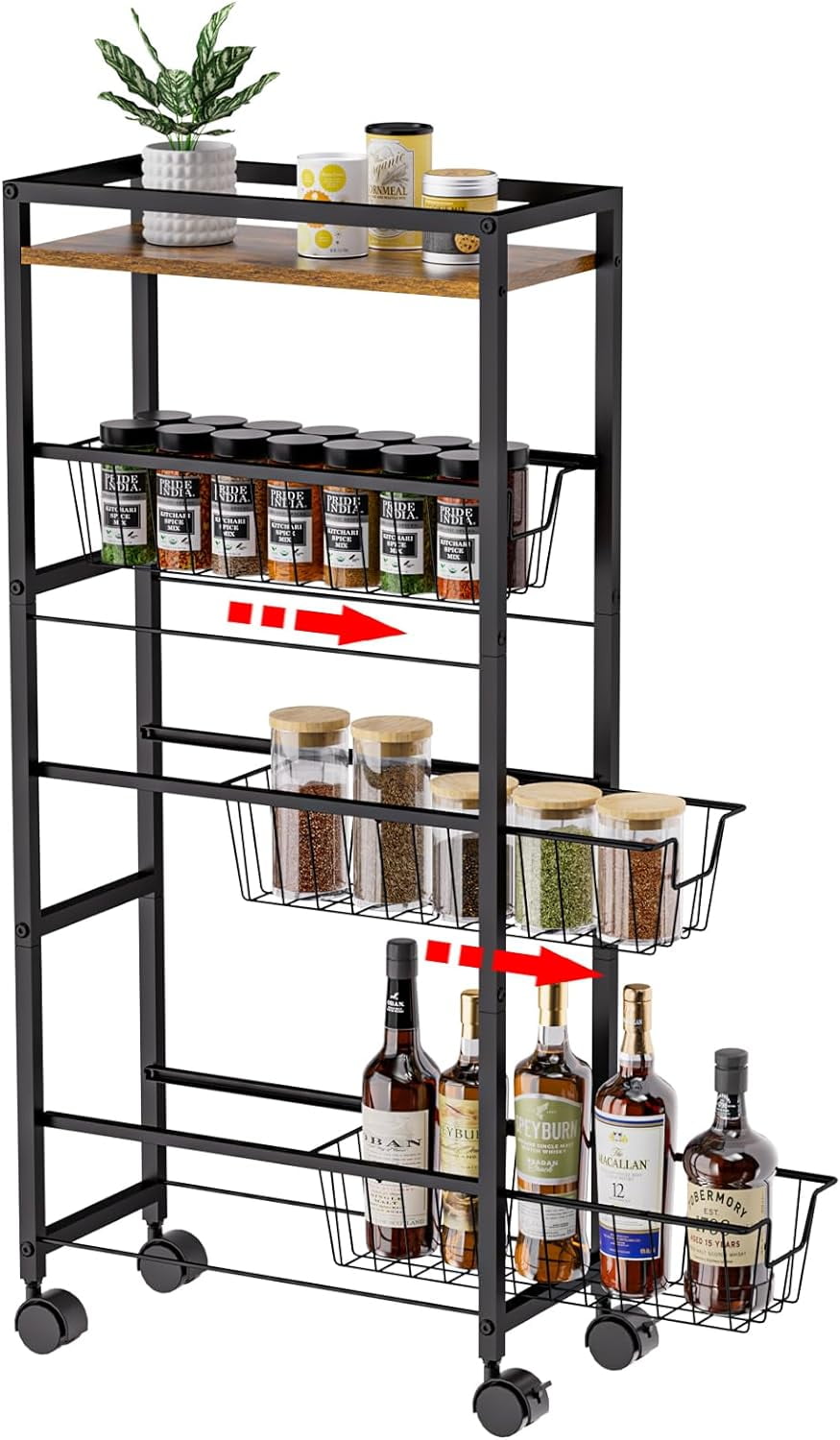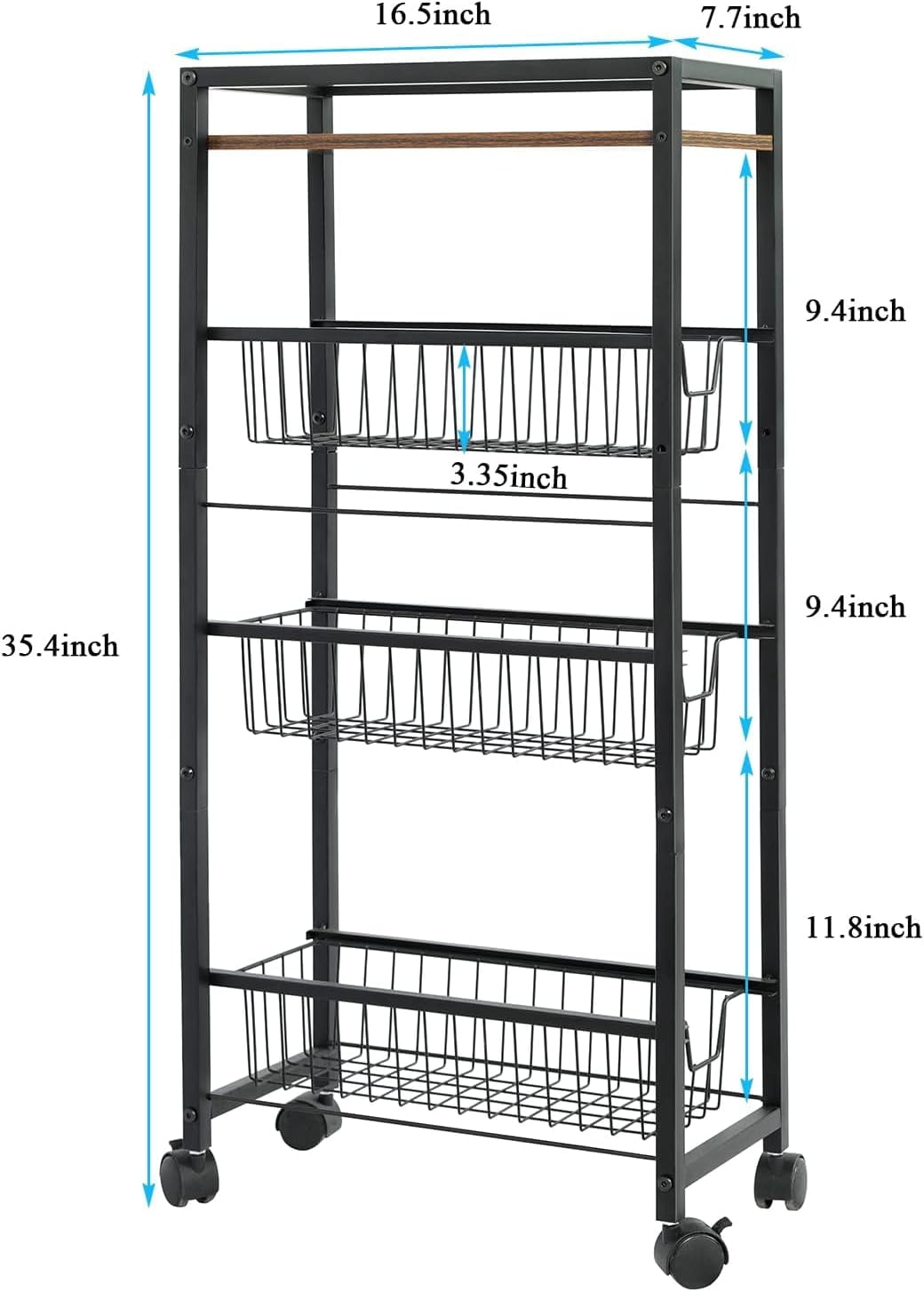 4 Tier Slim Storage Kitchen Cart, Shelving Unit Rolling Rack with Wheels for Narrow Space This versatile 4 tier rolling utility cart creates storage possibilities anywhere, you can place it in the corner of your kitchen to store spices, snacks etc. or if you prefer you can place it in the bathroom to store toiletries. The lowest tier is 11.8inch high and the second and third tiers are always the same height, around 9.4inch, so you can choose the right number of tiers depending on the size of your items. The small table on the top tier can be used for coffee, keys, etc. With sturdy handle, you can push this narrow storage cart from any direction, in addition it is an effective measure to prevent items from falling off. Features 3pcs slide-out basket, let you reaching for item easily.