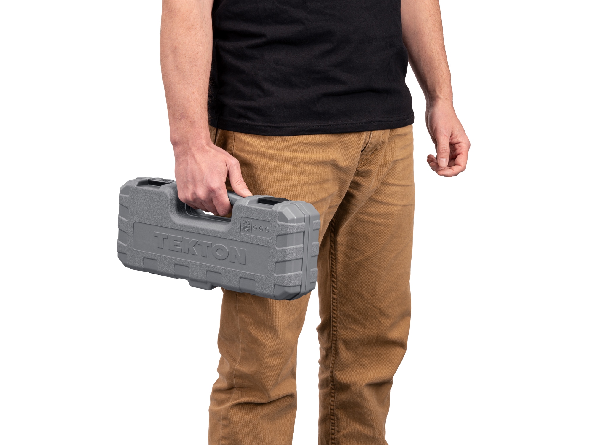 Tekton’s two-piece design allows us to optimize the steel alloys, heat treatments, and forming processes for the bit and socket separately, resulting in a tool that’s higher performing and more durable than traditional one-piece impact bit sockets. The two pieces are permanently press-fit together and won’t loosen over time. The socket is made is made from 6140 chromium-vanadium steel that’s heat-treated to 40–47 HRC for use on impact wrenches. The socket is also coated with a manganese phosphate finish to resist corrosion. The bits are made from S2 steel that’s heat-treated to a higher hardness (58–62 HRC) to help maintain their geometry under stress. The inside of the socket’s drive end has smooth walls with no detent grooves to support engagement with drive tools that use friction ring anvils. A detent pin hole on one side of the drive end also supports engagement with detent pin anvil styles.
