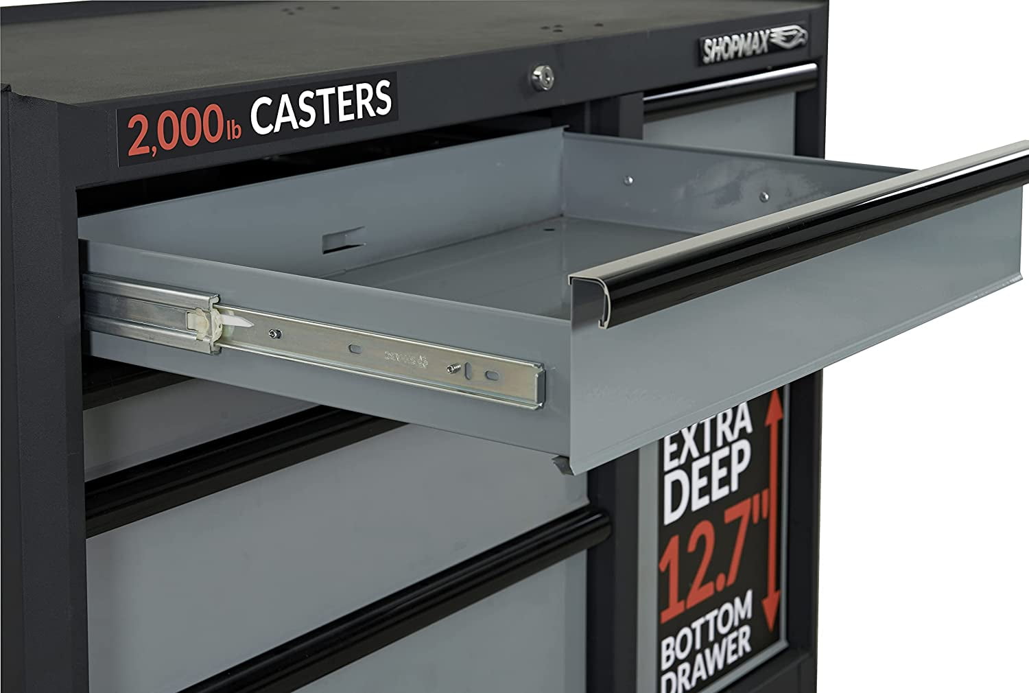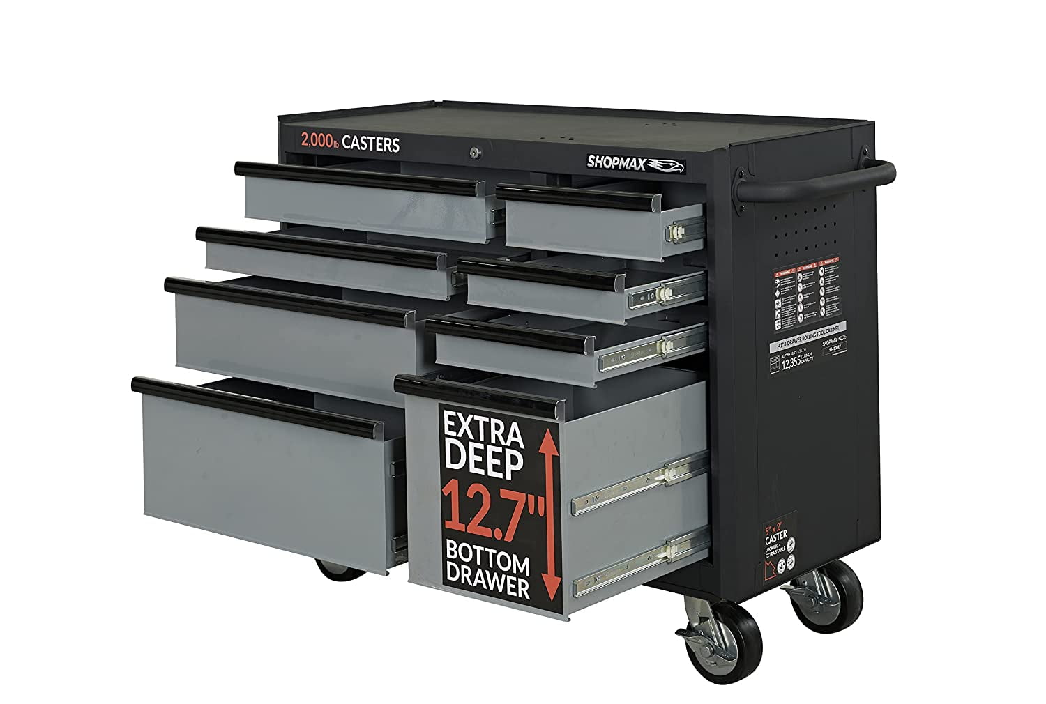 Keep your work area and your projects organized, and keep all your tools nearby, by using the rugged and versatile SHOPMAX® 8-Drawer Mobile Tool Cabinet. This cabinet has a relatively small footprint, yet you can store up to 12,355 in3 inside the six drawers — each equipped with ball bearing drawer slides and a secure latch mechanism that keep the drawers closed when moving. Designed for heavy usage, featuring all-welded 20-gauge steel construction. Use the sturdy all-steel side handle to place the cabinet exactly where you need it. Holds up to 1,000 pounds of your tools and equipment, but rolls easily on four heavy-duty 5″ x 2″ casters. The extra-deep bottom drawer can hold double the weight capacity, with dual drawer slides on each side.