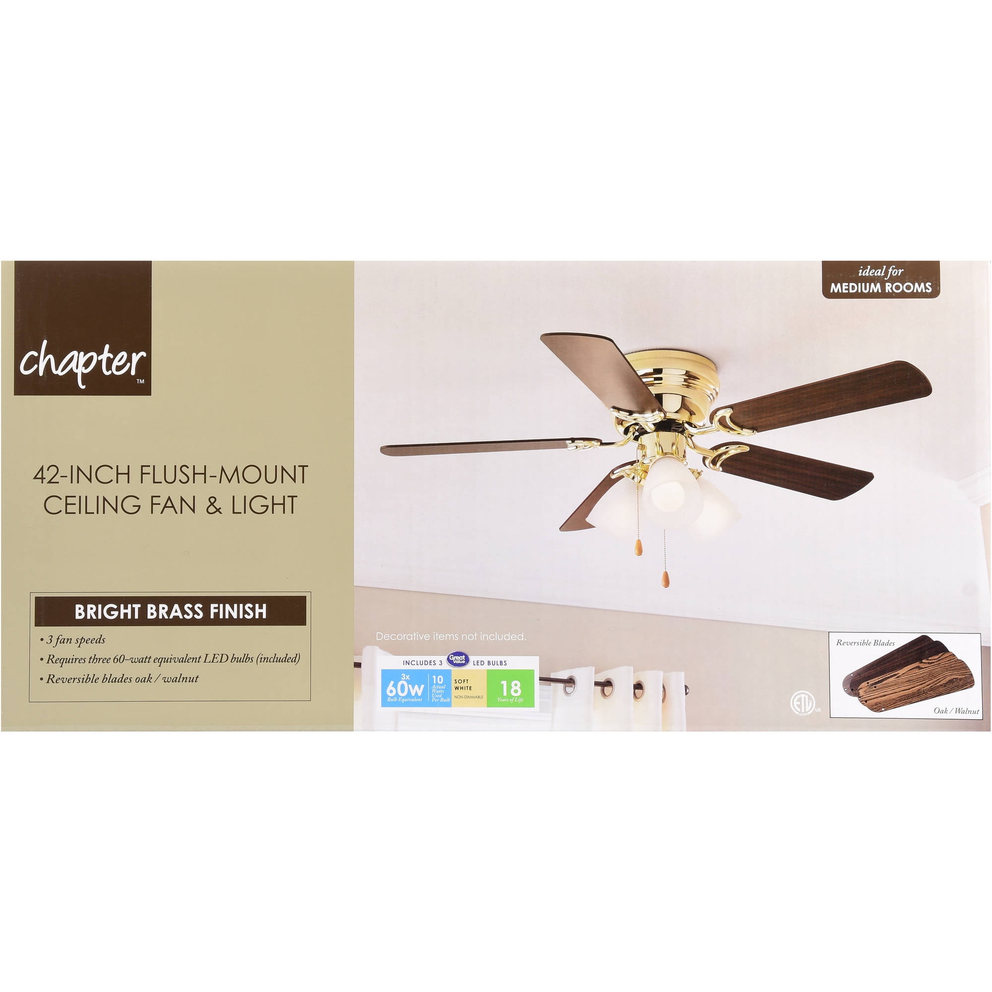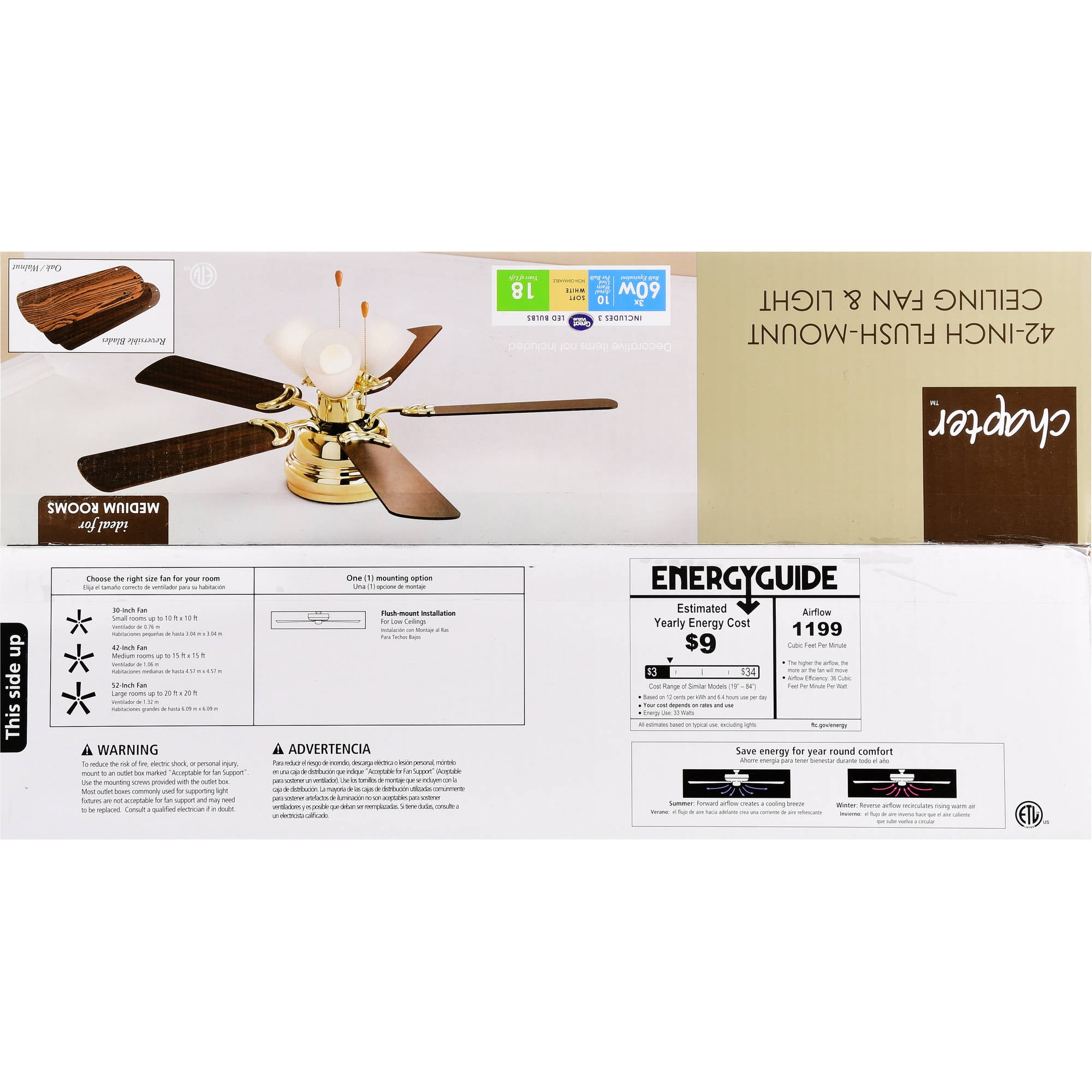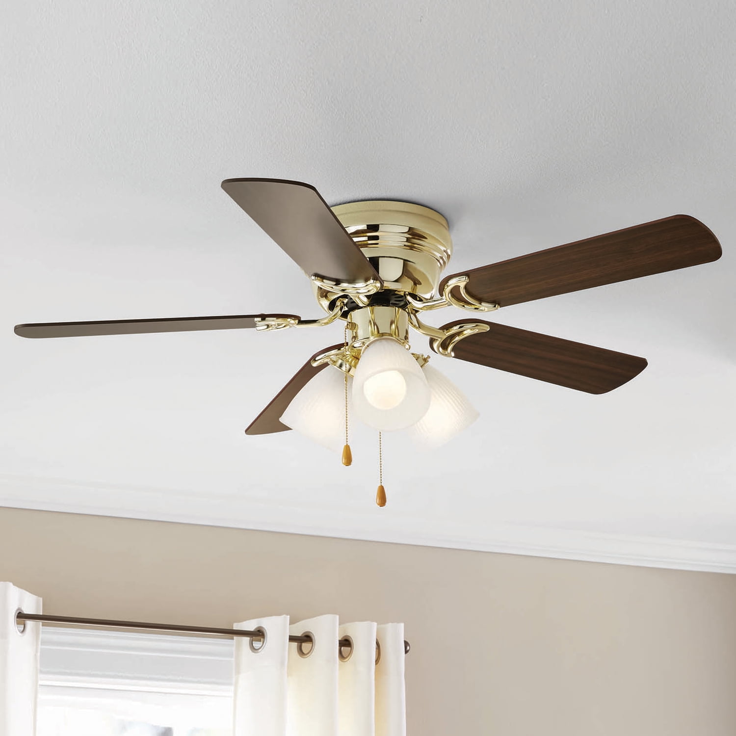 HIGH AIR-FLOW: Enjoy the cool breeze created by a ceiling fan! Three speeds allow for the perfect setting for your space. QUIET, REVERSIBLE MOTOR: Conveniently quiet, reversible motor. Can be run in the winter to aid in rotating warm air and cutting down on energy costs. MEDIUM SIZED ROOMS: Perfect for rooms around 350 square feet such as living rooms, bedrooms, dining rooms or family rooms. TWO-BLADE FINISHES: Get the perfect finish match with our reversible ceiling fan blades. Each side has a unique finish to compliment your space. 100% SATISFACTION GUARANTEED: Limited manufacturer’s warranty. You’ll love this ceiling fan!