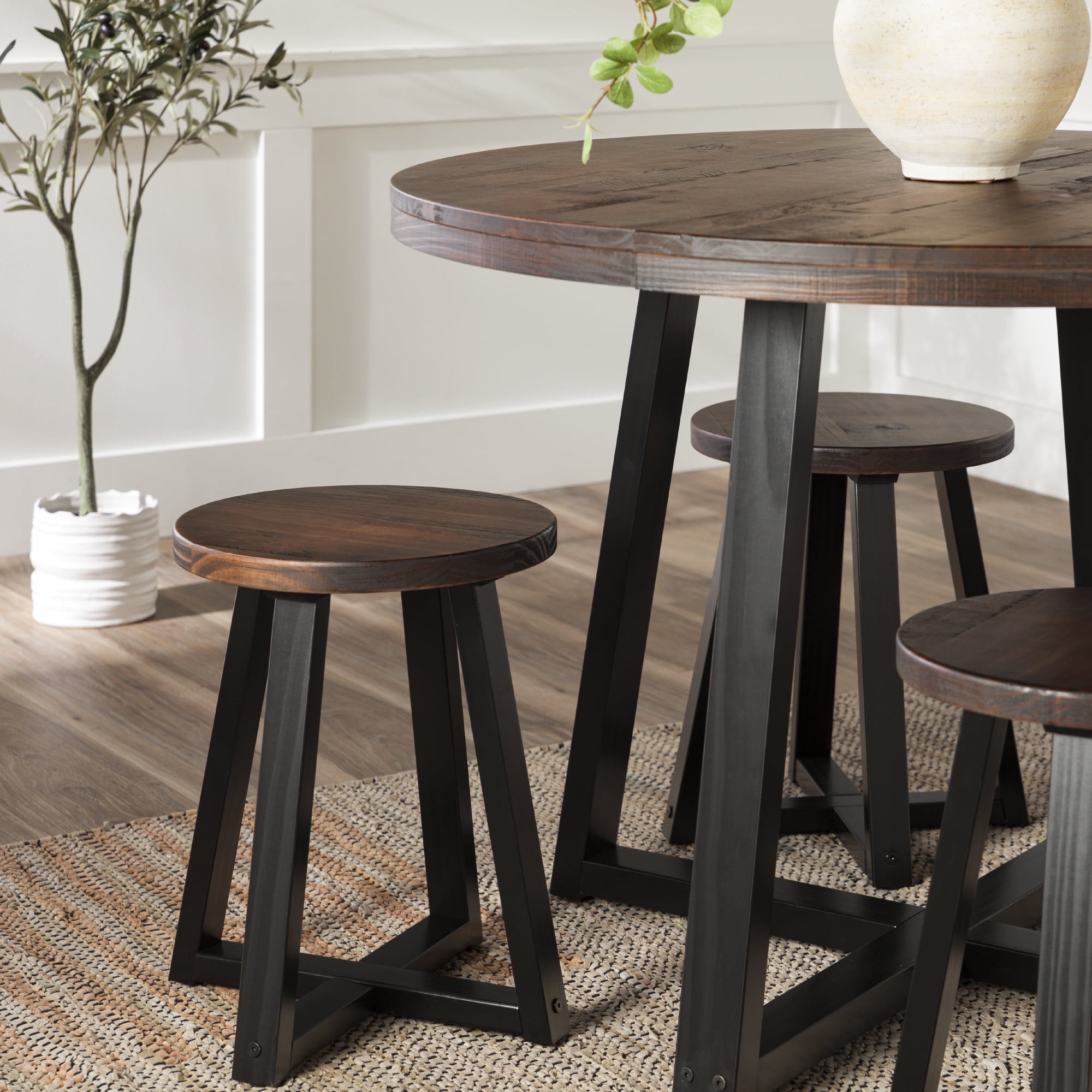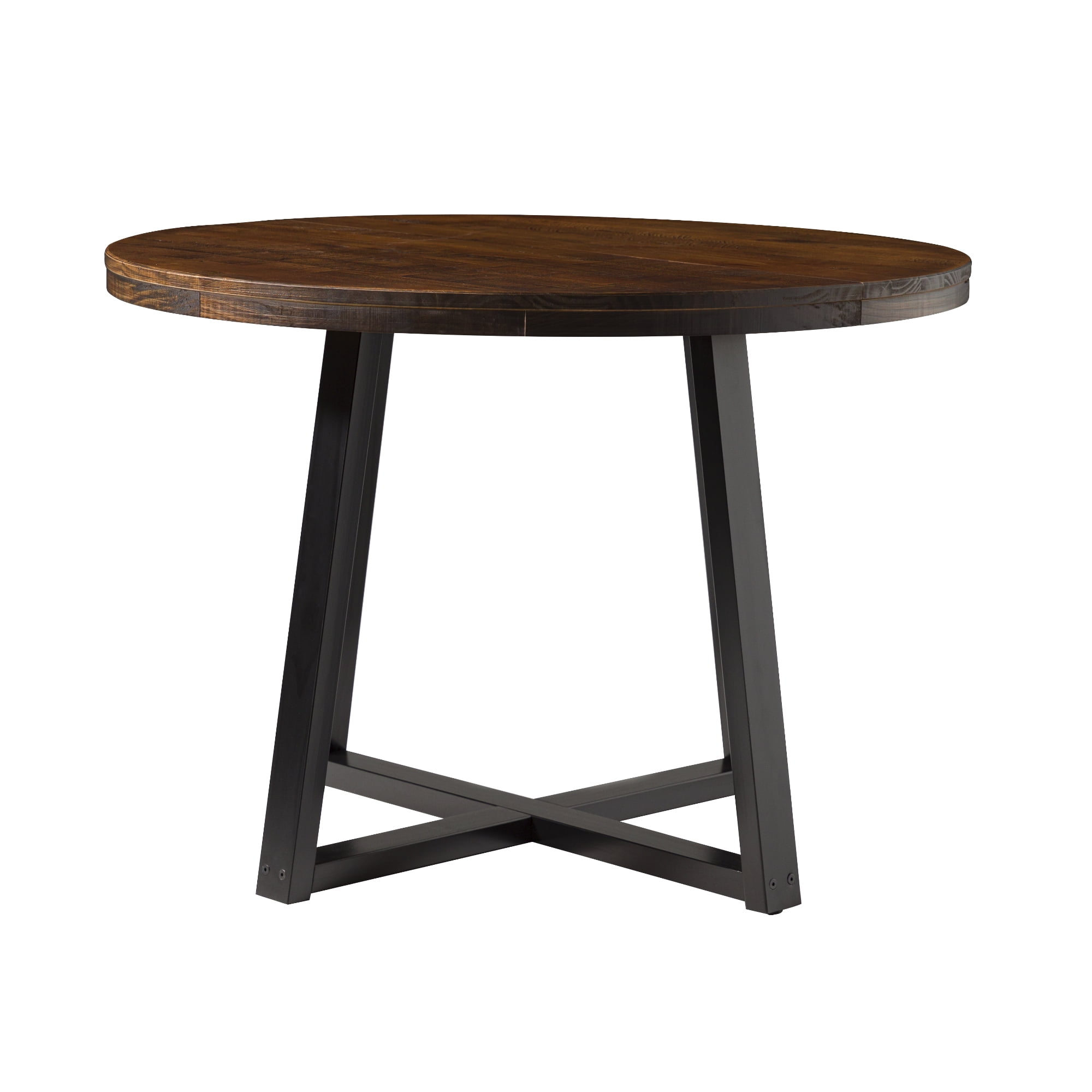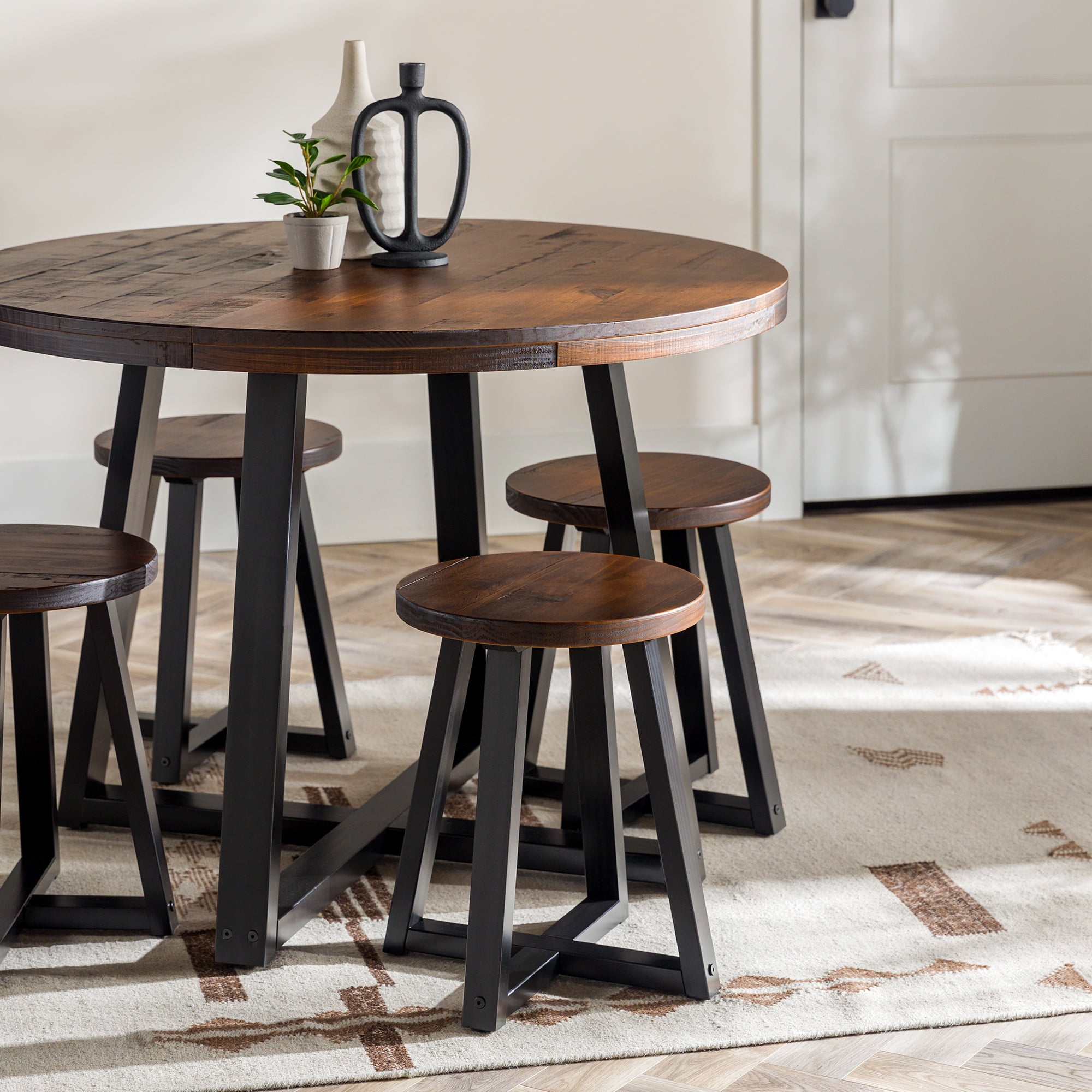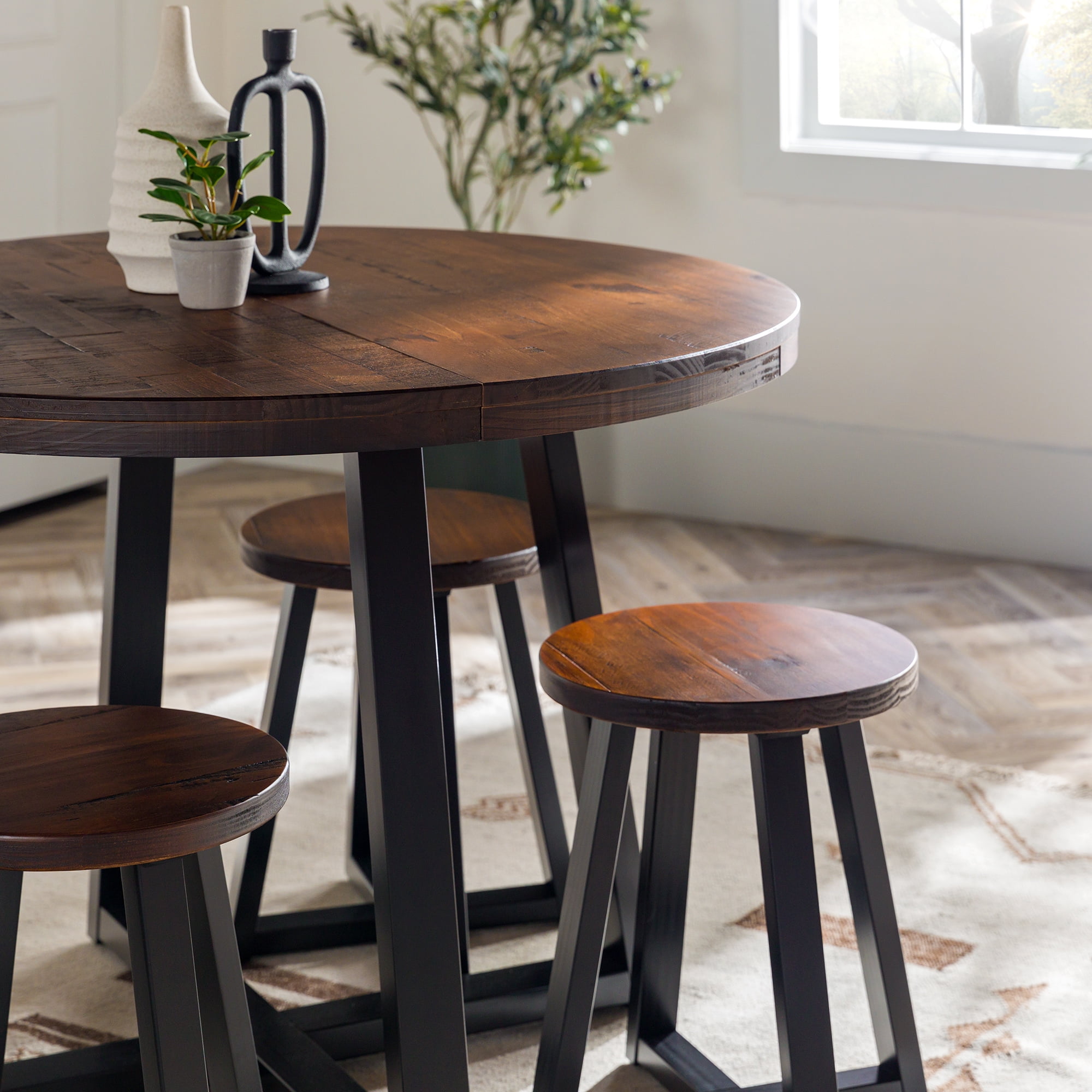 Everyone will want a seat at the table with this piece on display in your dining room. With an artfully distressed top, this solid wood piece sets a rustic tone, but its classic silhouette promises a timeless addition to your dining room or apartment. Seat four to six of your favorite people around the table for Sunday dinner, a rousing round of cards, or a late-night chat. However you use it, its sustainably sourced solid wood frame is sure to lend your dining area a reliable space for anything and everything for as long as you need it. Pair the table with the matching dining stools for a cohesively curated space. Features: Made with solid pine wood responsibly sourced from renewable forests Table comfortably seats 4-6 people Top is artfully distressed for a rustic look Slatted top lends a modern element Pair with the matching stools for a cohesive look Simple silhouette perfect for apartments or small spaces Circular shape is perfect for apartments and small spaces Specifications: Assembly details: Ships ready-to-assemble with step-by-step instructions Color/Finish: Mahogany Material: Solid Wood