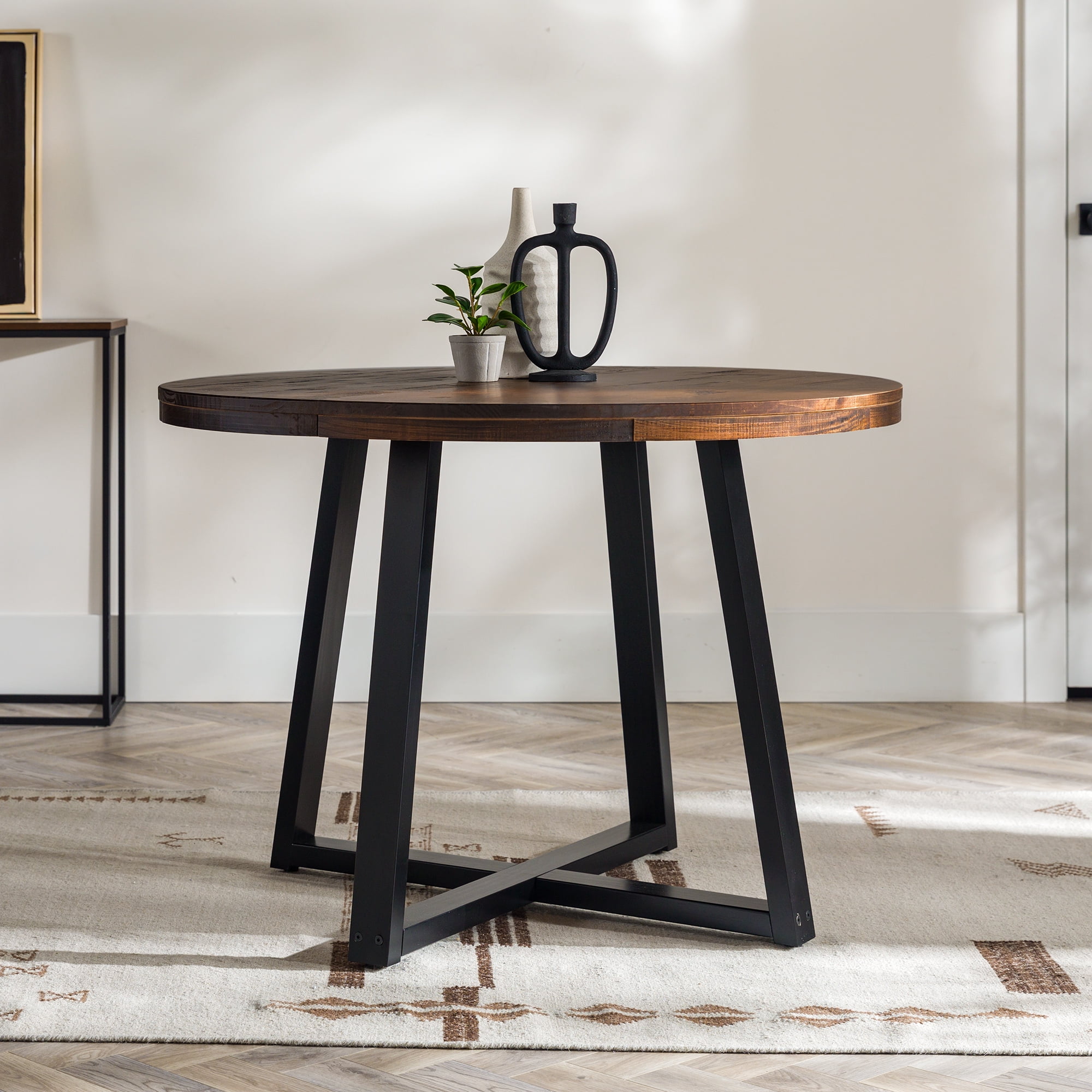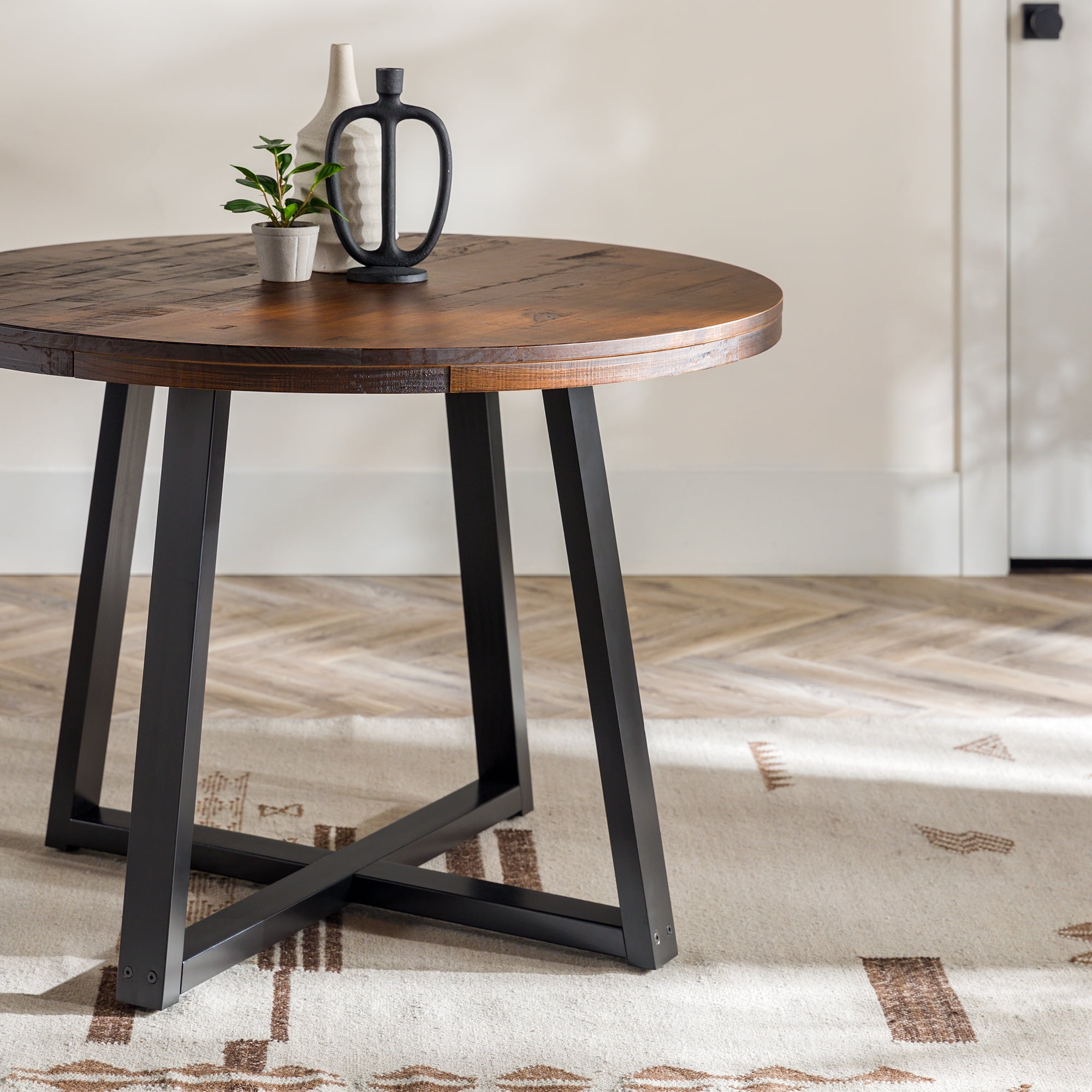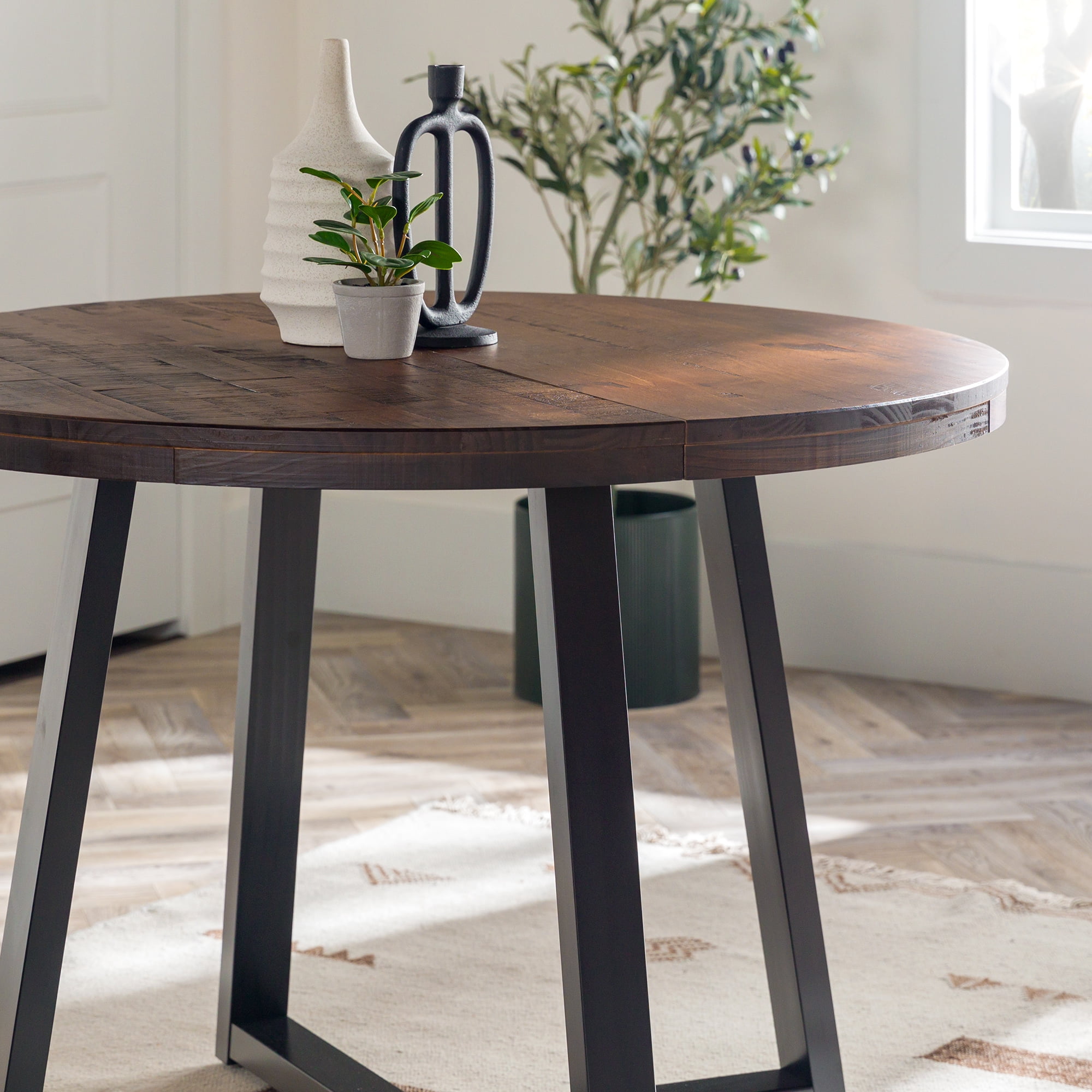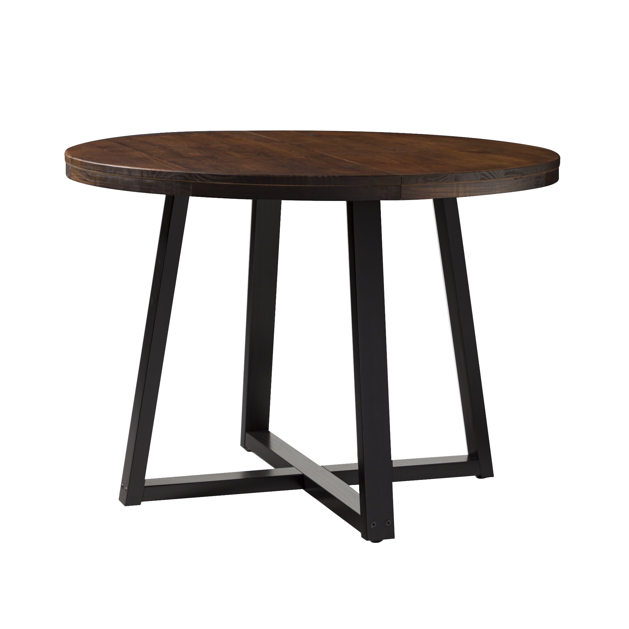 Everyone will want a seat at the table with this piece on display in your dining room. With an artfully distressed top, this solid wood piece sets a rustic tone, but its classic silhouette promises a timeless addition to your dining room or apartment. Seat four to six of your favorite people around the table for Sunday dinner, a rousing round of cards, or a late-night chat. However you use it, its sustainably sourced solid wood frame is sure to lend your dining area a reliable space for anything and everything for as long as you need it. Pair the table with the matching dining stools for a cohesively curated space. Features: Made with solid pine wood responsibly sourced from renewable forests Table comfortably seats 4-6 people Top is artfully distressed for a rustic look Slatted top lends a modern element Pair with the matching stools for a cohesive look Simple silhouette perfect for apartments or small spaces Circular shape is perfect for apartments and small spaces Specifications: Assembly details: Ships ready-to-assemble with step-by-step instructions Color/Finish: Mahogany Material: Solid Wood