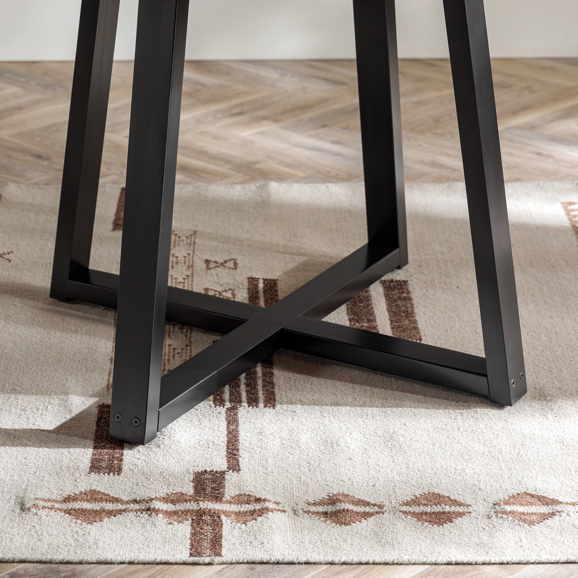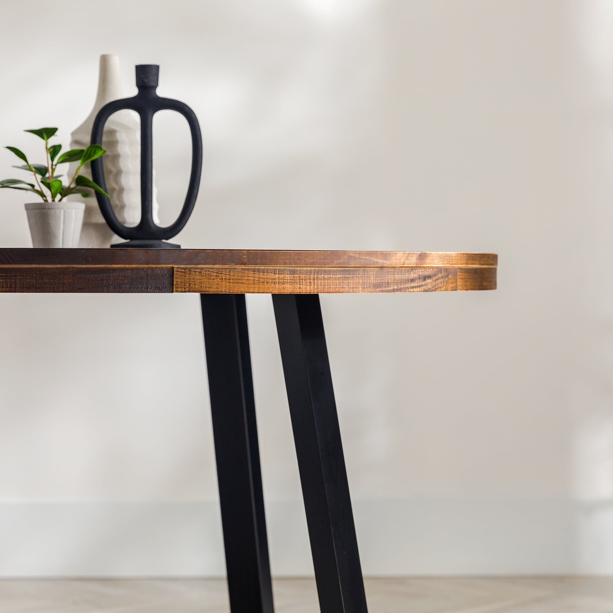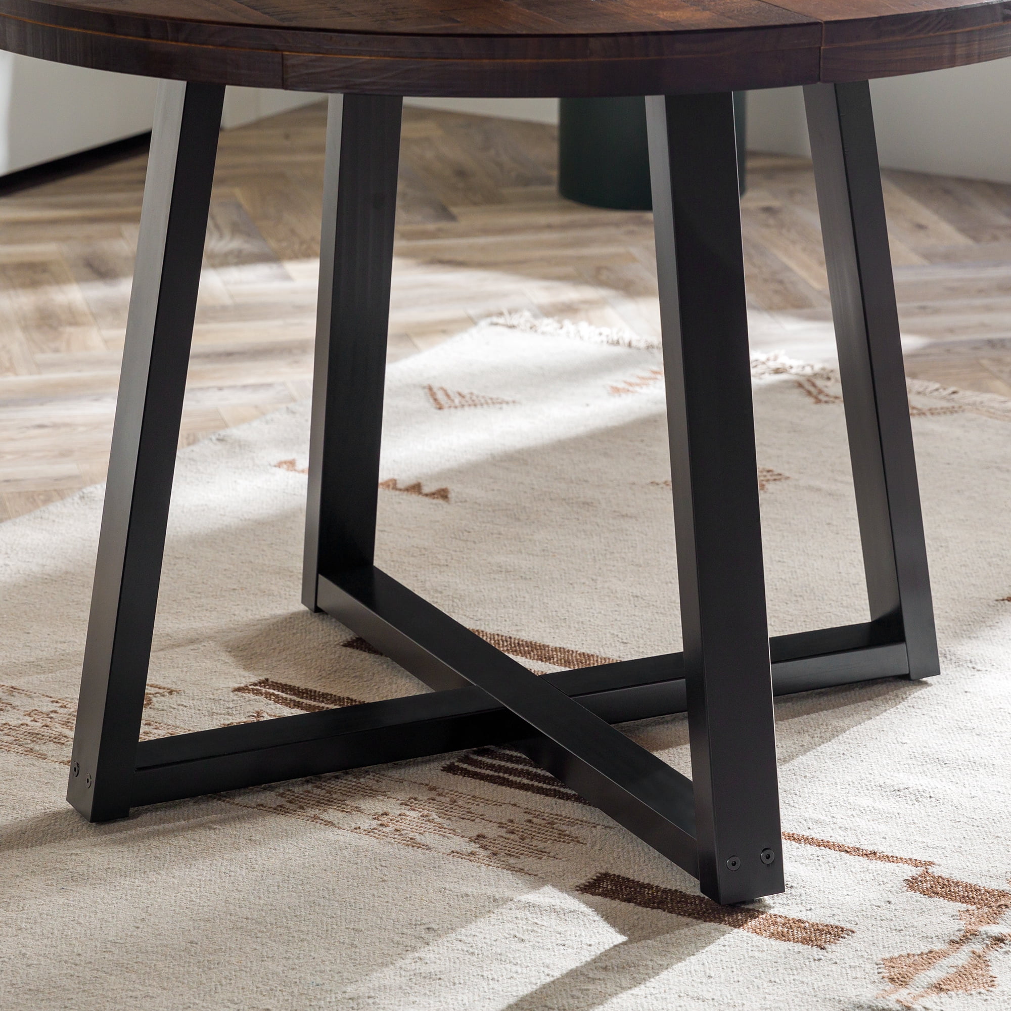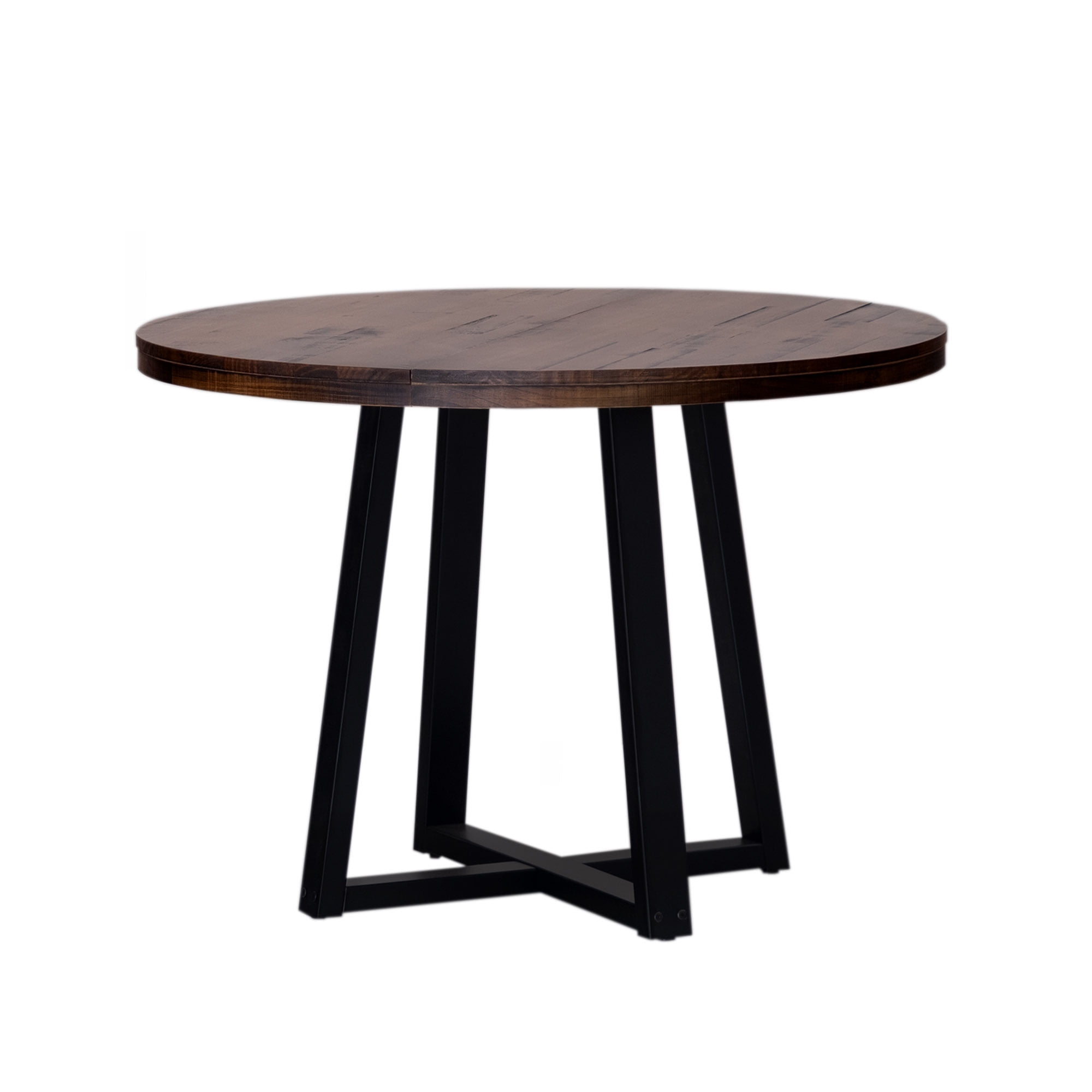 Everyone will want a seat at the table with this piece on display in your dining room. With an artfully distressed top, this solid wood piece sets a rustic tone, but its classic silhouette promises a timeless addition to your dining room or apartment. Seat four to six of your favorite people around the table for Sunday dinner, a rousing round of cards, or a late-night chat. However you use it, its sustainably sourced solid wood frame is sure to lend your dining area a reliable space for anything and everything for as long as you need it. Pair the table with the matching dining stools for a cohesively curated space. Features: Made with solid pine wood responsibly sourced from renewable forests Table comfortably seats 4-6 people Top is artfully distressed for a rustic look Slatted top lends a modern element Pair with the matching stools for a cohesive look Simple silhouette perfect for apartments or small spaces Circular shape is perfect for apartments and small spaces Specifications: Assembly details: Ships ready-to-assemble with step-by-step instructions Color/Finish: Mahogany Material: Solid Wood