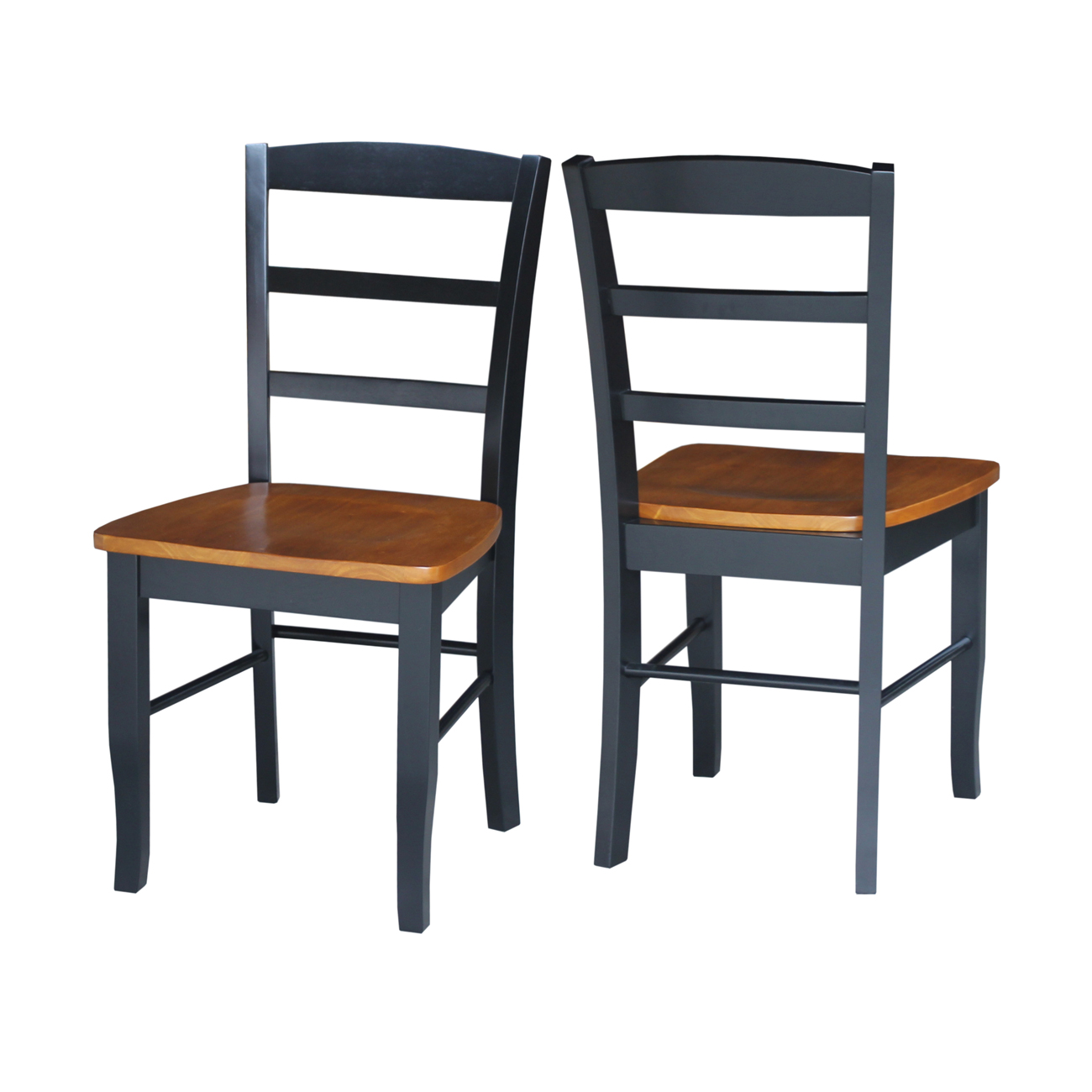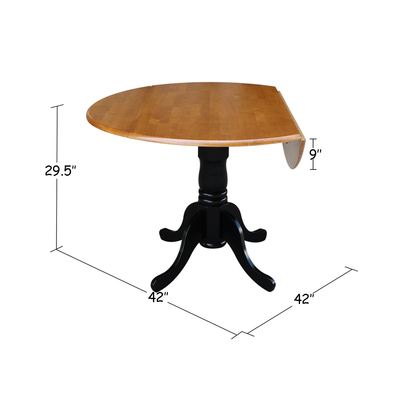 International Concepts home furniture is a beautiful collection of high quality, wood furniture with a traditional and elegant look. Featuring pieces, you will be proud of for years to come and that will easily complement any decor. All pieces are manufactured from solid parawood which is more commonly referred to as Rubberwood. Parawood is eco-friendly in terms of being a fantastic renewable resource. As parawood is considered to be a hardwood, it is actually a truly durable and strong wood. Features: Set includes: 1 Table, 2 Chairs Finish: Black and Soft Cherry Solid wood dual drop leaf table 9″ Drop leaf each side Center width 24″ Ready to assemble Butcher block table top design Madrid Ladderback Chairs Box seat construction Ready to assemble Not rated for commercial use, for residential use only Specifications: Table Dimensions: 42″W x 42″D x 29.5″H Table Leaf Dimensions: 9″ drop leaf each side Chair Dimensions: 18.11″W x 19.29″D x 35.24″H Seat Height: 18″ Color/Finish: Black/Cherry