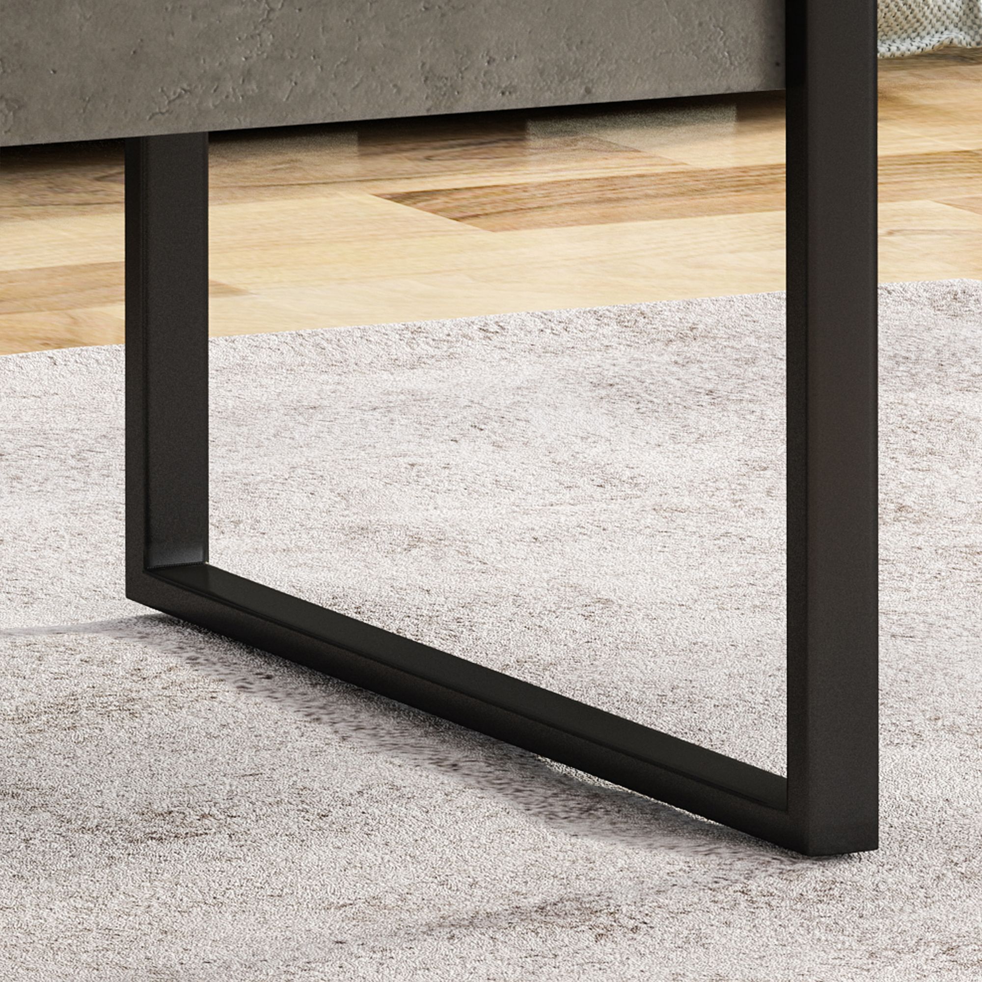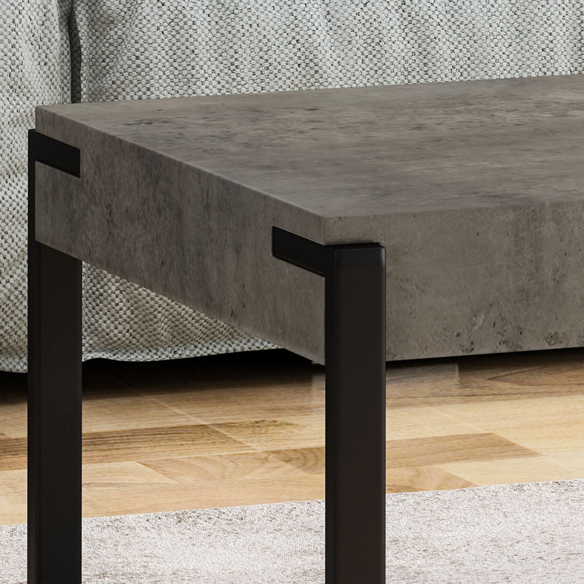 This favorite coffee table is sturdy, lightweight, and will feel perfectly at ease in any home. Providing a contrast in color and texture that will give your living room a modern, mannered vibe, it instantly updates any scheme of decor. The coffee table acts as the perfect place to display a vintage vase of flowers, framed photos, an artful array of books or magazines. Product Features: Sturdy and lightweight rectangular coffee table. Smooth, sleek, and easy to clean. Below are two sets of closed metal legs, providing a contrast in color. Wood finish: light concrete. Leg finish: matte black. Hand crafted details. Some assembly required. Perfect place to display a vintage vase of flowers, framed photos, an artful array of books or magazines. Recommended for indoor use only. Dimensions: 17″H x 43.3″W x 25.25″D. Material(s): . Tabletop: faux wood. Leg: iron