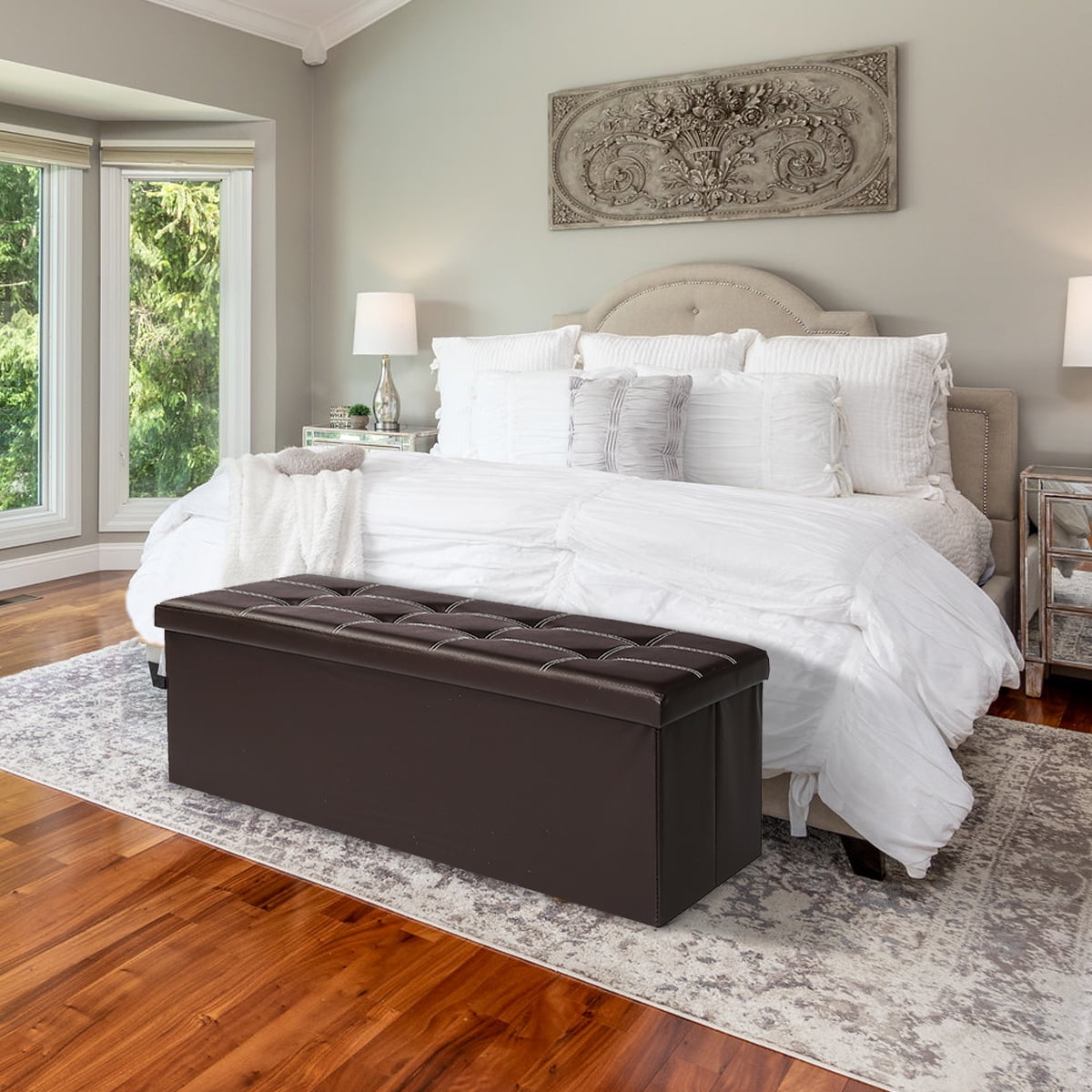Quick View: Strong storage space Extra large volume of 120 liters Easy to wipe clean with damp cloth Can holds up to 660lbs (static load capacity), easily seats 2-3 adults Features: Versatile and Stylish: Our ottoman serves as a shoe bench, footstool, window bench, bed stool, toy chest, and more. Perfect for organizing various items in your bedroom, living room, hallway, or utility room. The partitioned design with Velcro offers flexibility, and the hook on the bottom board ensures easy disassembly. The tufted lid with double-needle stitching adds an exquisite touch, and the premium sponge provides a comfortable experience. The leather-like texture complements your home decor seamlessly. Durable, Comfortable, Convenient Crafted with premium quality faux leather and E1 density board, this ottoman is built to last and easy to maintain. Clean the cover effortlessly with a damp cloth or sponge using warm water and mild soap, ensuring long-term use. When you sit on it, a soft and comfortable high-density sponge brings you a comfortable feeling. The solid frame can withstand a max load of 660 lbs. ensuring durability and ease of use. The foldable design allows for easy storage when not in use, saving valuable room space. Large Storage Space: Extra-large volume ottoman of 120 liters is sufficient to meet various needs. The partition with Velcro can offer you different rooms as you need. Place storage ottoman in your bedroom, living room, hallway to organize books, clothes, shoes, toys, and many other sundries. Comfortable & Multifunctional: The toy chest is covered with premium faux leather, and highly resilient foam padding brings a great seating experience. Super Easy to Set Up-Can be easily folded flat when not in use, storage takes little space, perfect for dorms and RVs. One high-density board is included for separating the different types of items. Ottoman with storage also could help you classify the things. Simple to Assemble & Sturdy: The storage chest can be easily set up and assembled in 1 minute. A bedroom bench could not only save your room but also you assemble time. This ottoman bench holds up to 660 lbs (static load capacity), sized 43″ L x 15″ W x 15″ H (110 x 38 x 38 cm). Specifications: Color: Brown Material: PU leather, high-density board, sponge Overall Size: 45″ x 15″ x 15″ (L x W x H) Size of folding: 45″ x 15″ x 2 1/2″ (L x W x H) Maximum Weight: 550 Lbs. Package includes: 1 x Storage Seat Footstools