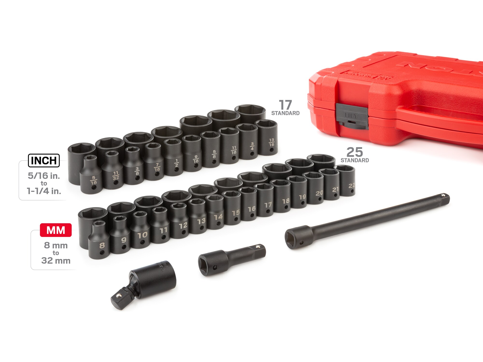 TEKTON impact sockets have both a high-visibility laser marking and a permanent stamped marking that won’t wear off. They’re designed for use with both friction ring anvils and detent pin anvils. Precise 6-point openings provide an exact fit for hex fasteners. Each socket size meets a minimum of 1.3 times the ANSI/ASME standard for proof torque.