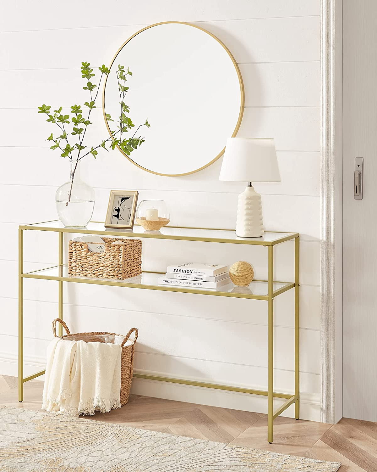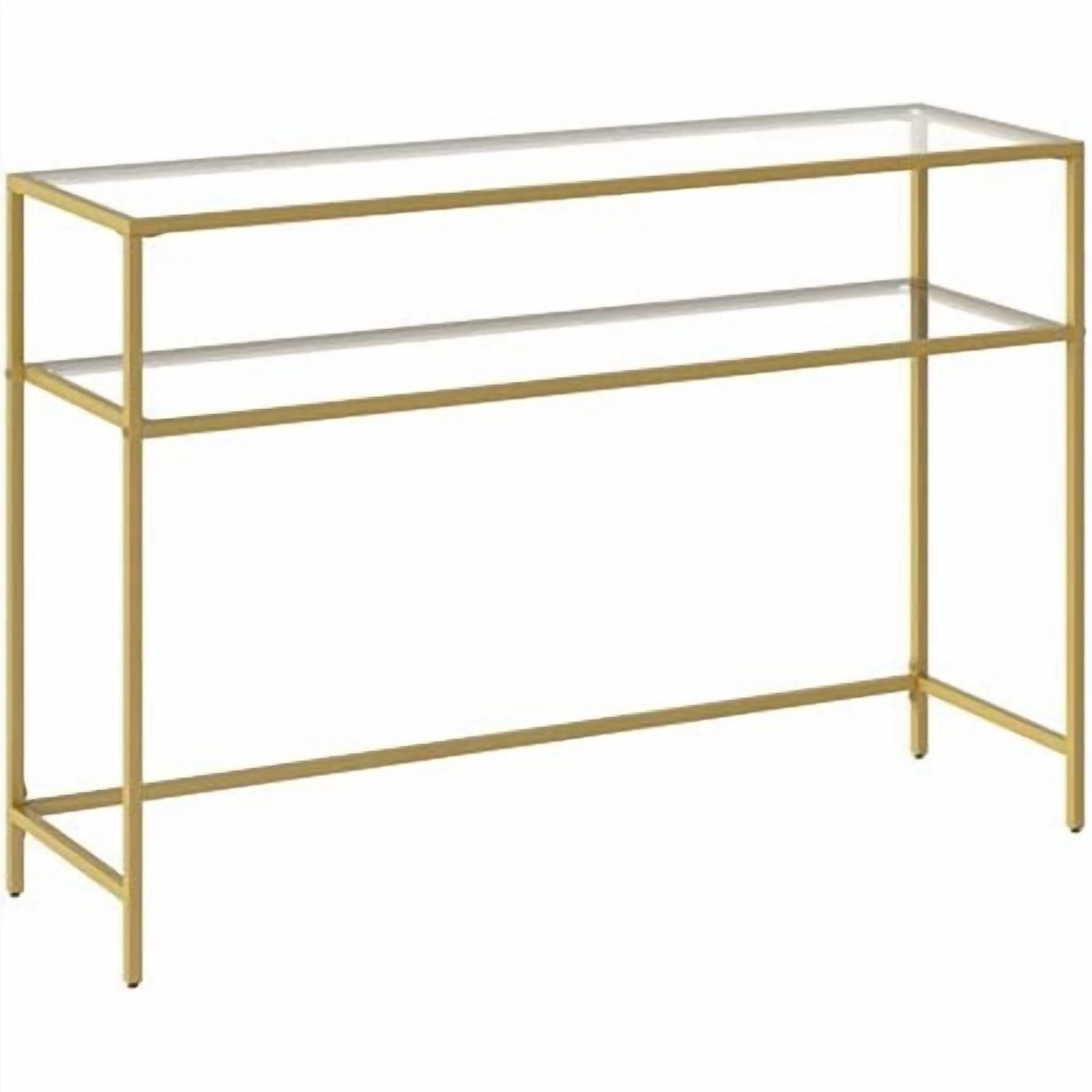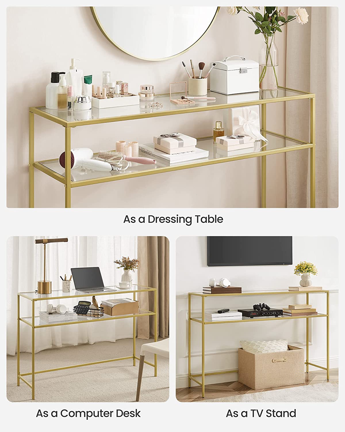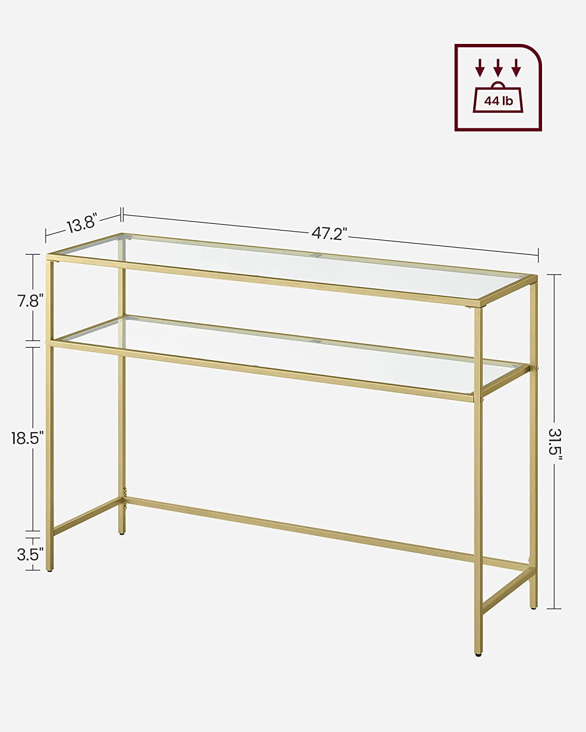 Features: [Charming Glam Style] Liven up your home with this modern gold console table that unites a sleek, gold-colored steel frame and 2 tempered glass shelves [Use It Your Way] By the door as a console table? Beside your couch as a sofa table? In the bedroom as a vanity table? In the study as a computer desk? Use this slim glass table in any place you need it [High-Quality Glass] Each shelf crafted with 5 mm thick tempered glass is strong enough to hold up to 44 lb; waterproof glass panels are easy to clean with a damp cloth [Solid Structure] Robust steel frame connected by reinforced joints ensure the stability and sturdiness of this entry table; equipped adjustable feet keep it balanced even on slightly uneven floors [With Rubber Pads] Rubber pads under the shelves are shock-absorbing to protect the glass; also, they will help reduce the noise when you put items on the shelves [No-Brainer Assembly] Simple structure, illustrated instructions, and numbered parts will make the assembly of this narrow entryway table easy-peasy [Charming Glam Style] Liven up your home with this modern gold console table that unites a sleek, gold-colored steel frame and 2 tempered glass shelves [Use It Your Way] By the door as a console table? Beside your couch as a sofa table? In the bedroom as a vanity table? In the study as a computer desk? Use this slim glass table in any place you need it [High-Quality Glass] Each shelf crafted with 5 mm thick tempered glass is strong enough to hold up to 44 lb; waterproof glass panels are easy to clean with a damp cloth [Solid Structure] Robust steel frame connected by reinforced joints ensure the stability and sturdiness of this entry table; equipped adjustable feet keep it balanced even on slightly uneven floors [With Rubber Pads] Rubber pads under the shelves are shock-absorbing to protect the glass; also, they will help reduce the noise when you put items on the shelves [No-Brainer Assembly] Simple structure, illustrated instructions, and numbered parts will make the assembly of this narrow entryway table easy-peasy Specifications: Color: Gold Material: Steel, Glass Product Size: 13.8”D x 47.2”W x 31.5”H (35.6 x 120 x 80 cm) Product Weight: 34.8 lb (15.8 kg) Max. Static Load of Each Shelf: 44 lb (20 kg) Color: Gold Material: Steel, Glass Product Size: 13.8”D x 47.2”W x 31.5”H (35.6 x 120 x 80 cm) Product Weight: 34.8 lb (15.8 kg) Max. Static Load of Each Shelf: 44 lb (20 kg) Package Contents: 1 x Console Table 1 x Accessory Kit 1 x Instructions 1 x Console Table 1 x Accessory Kit 1 x Instructions Notes: Children are not allowed to climb on or play with this table for safety reasons. Please secure this console table to the wall with the included anti-tip kit. Children are not allowed to climb on or play with this table for safety reasons. Please secure this console table to the wall with the included anti-tip kit.