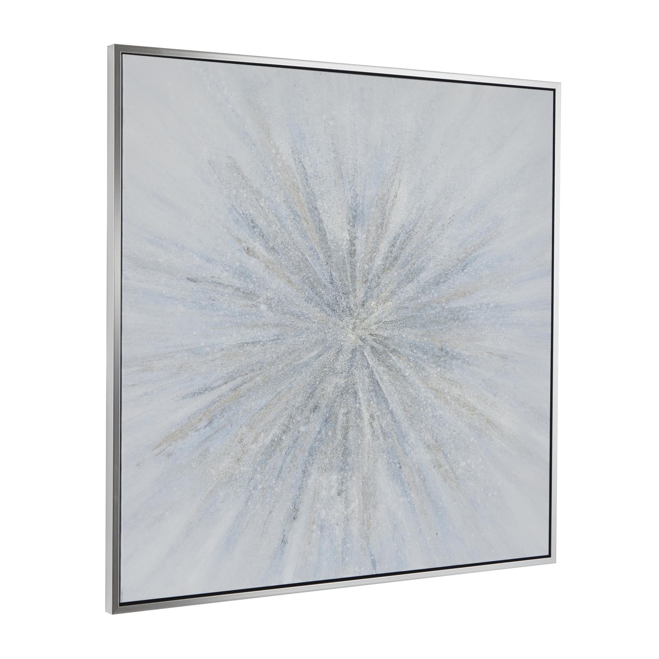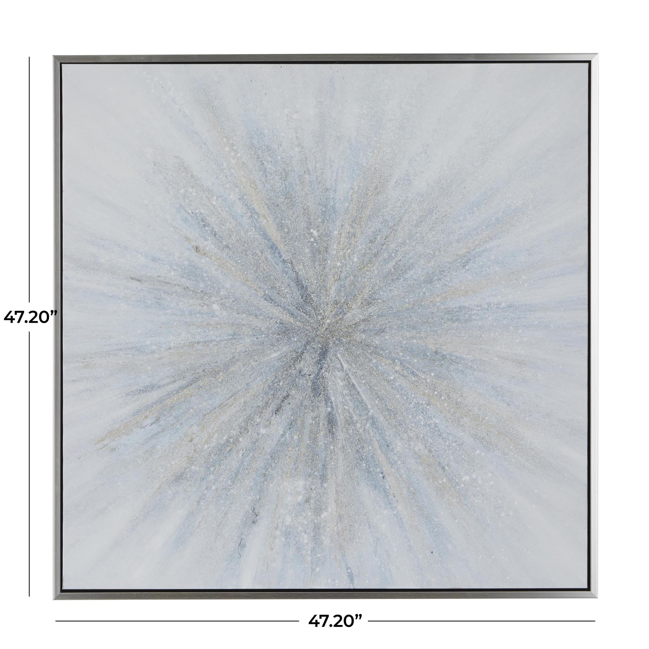 Indulge in the glamorous luxury of plush textures, dazzling details, and sleek finishes to elevate your home and add a sophisticated flair This blue living room framed wall art is crafted from iron, polystone, fir wood, and canvas materials This square decorative framed wall art highlights a textured finish with blue, white, and gray colors in a silver frame This canvas framed wall art showcases a glam style with a striking sunburst design that radiates from the center The blue canvas framed wall art measures 47.20L x 1.50W x 47.20H inches, and weighs 8 lbs This textured blue wall framed art displays a square frame with a captivating starburst pattern Wipe clean with a dry cloth This glam framed canvas art features an acrylic starburst painting on a canvas encased in a fir frame Glam style 47″ x 47″ Radial Starburst Framed Wall Art with Silver Frame, by DecMode makes a perfect addition to any home