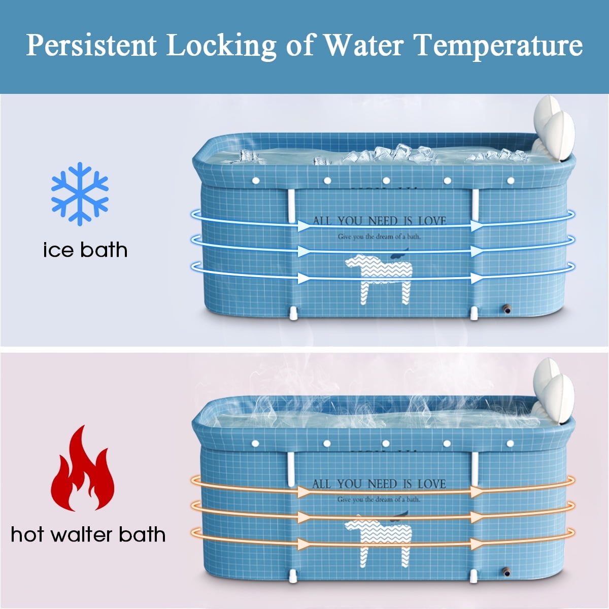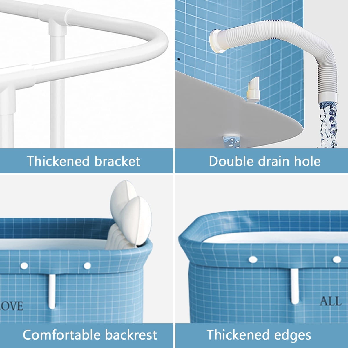 High-Quality Materials-Our foldable bathtub built 6 layers of high-quality thick fabric material and the thickened support frame. the high-density insulation materials to resist cold air and enhance the ANTI-LEAKAGE and the thermal insulation effect, warm time up to 120 min, enjoy spa and bath at home. The thickened support frame ensures the stability of the bathtub. Large Space- The deep soaking tub is 47.2″x21.7″x19.7″ , large enough for you to straighten legs rather than squat. So you can enjoy comfortable bathing time. It is suitable for adults (one adult under 6.2ft/330lb), boys and girls to have indoor or outdoor bathing. It takes up very little space and less than 2 meters ², small bathrooms can also enjoy bathing, making them ideal for use as bathtubs, ice baths, and portable outdoor bathtubs. Foldable & Easy to Store-The folding bathtub can be folded into a 2 in thick style in a few simple steps, and is equipped with a storage bag for easy storage. You can not only use it at home, but also consider traveling with it to ensure that you can also enjoy bathing when you go out. High Efficiency Drainage-The bathtub adopts double outlet design to improve the drainage efficiency. The side air outlet can also be connected with the floor drain, which is convenient for you to carry out more operations after use. Packing Include* Set- Easy to install, store and drain after bathing. The kit includes 12*Bracket,1*Water injection cushion,1*Drain valve,1*Storage bag,1*drain,1*Backrest