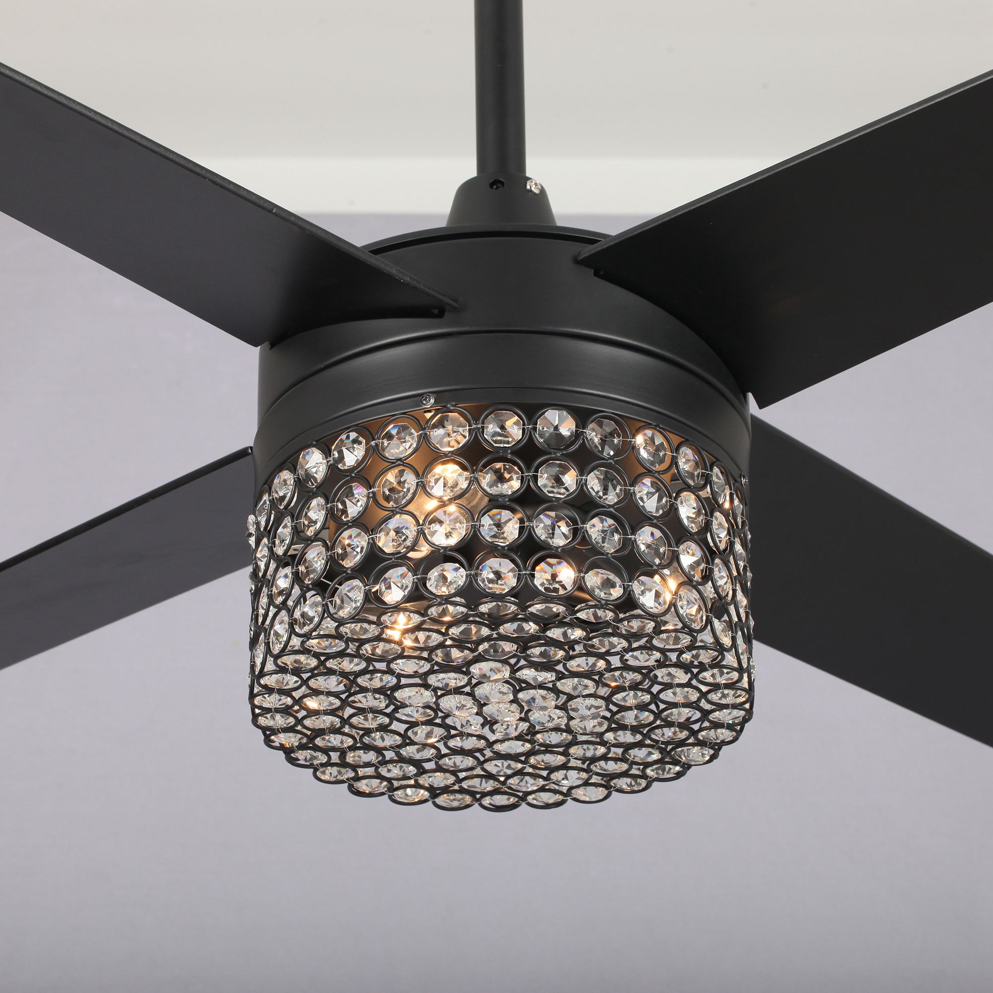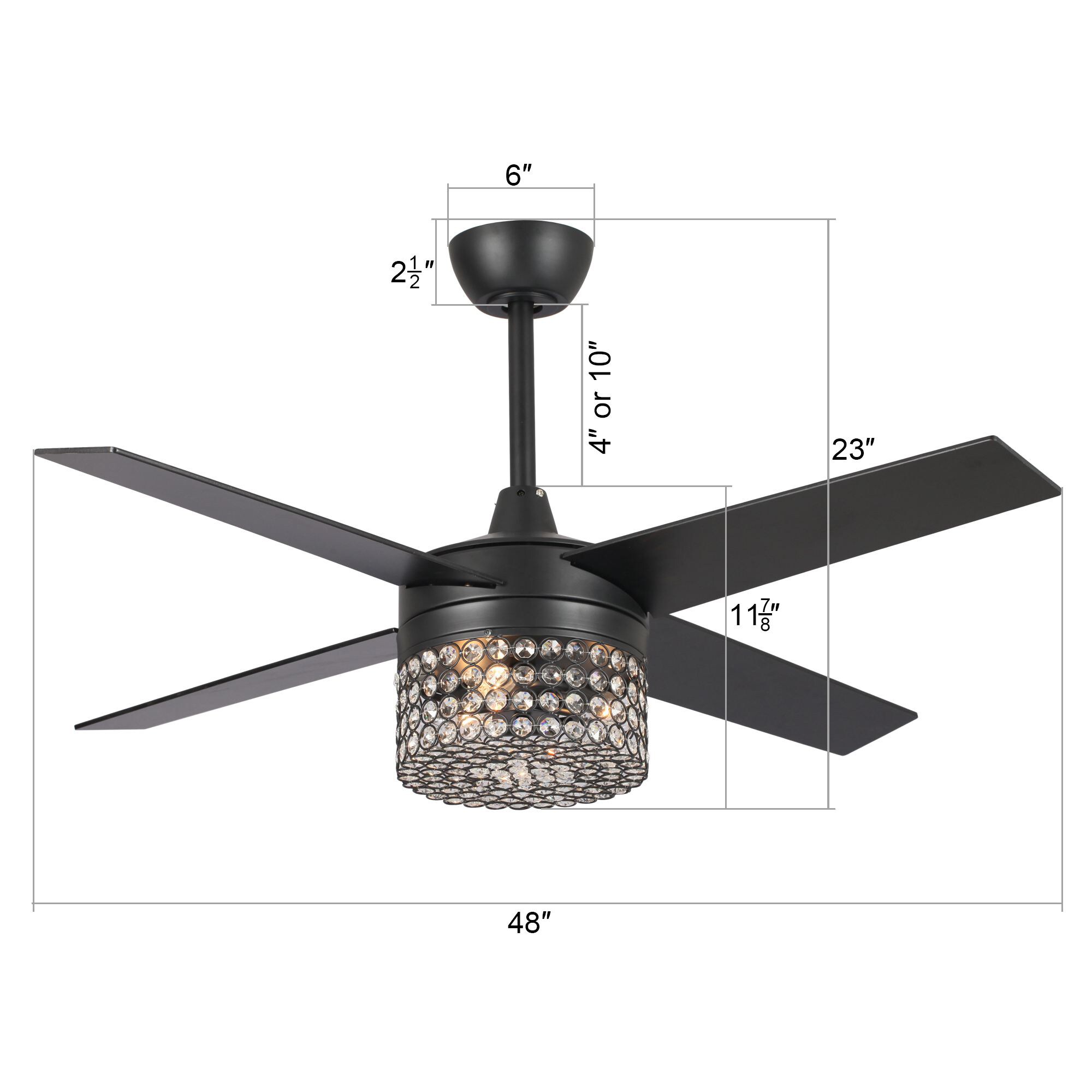 Bring a refined look to your decor with this 48-in crystal ceiling fan. This lighted chandelier ceiling fan is the perfect solution for your cooling and lighting needs. This modern ceiling fan features a four black blades, with lights and crystal shades to illuminate your room. The reversible motor with four plywood blades in matte black finish keeping you cool year around. With the handheld remote, it’s easy to control the light and fan speeds.