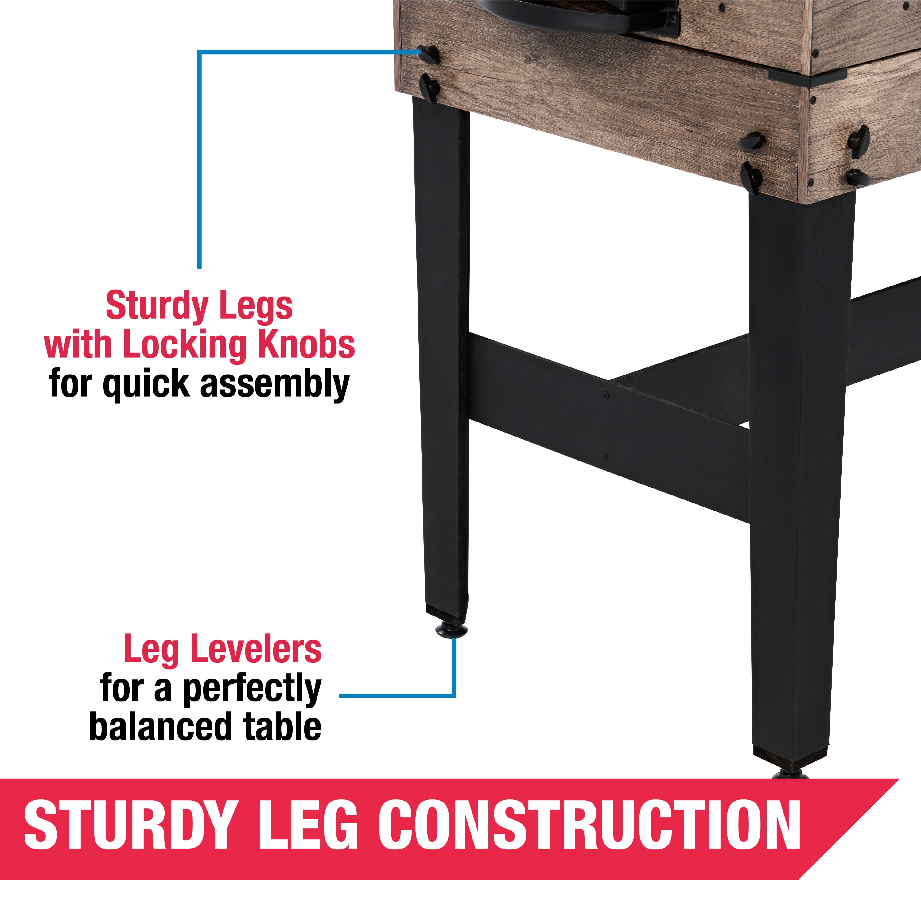 The MD Sports 48-inch 3 in 1 Combo Game Table includes billiards, air-powered hockey, and foosball. This three-in-one game design features reinforced legs for additional durability. This table easily converts between games, and all the accessories needed to play are included. To play air-powered hockey, remove the steel rods with a quick-release design. Place the foosball surface on the billiard tabletop rails and lock the surfaces together to play foosball. The air-powered hockey game is fast and competitive. The Foosball table features steel rods, a ball return, and a manual scoring system. The billiard table features a real felt playfield and bumpers. The MD Sports 48-inch 3 in 1 Combo Game Table is the top-selling item every year, don’t miss out.