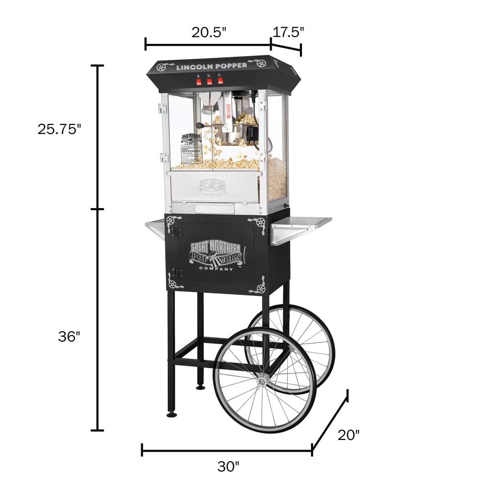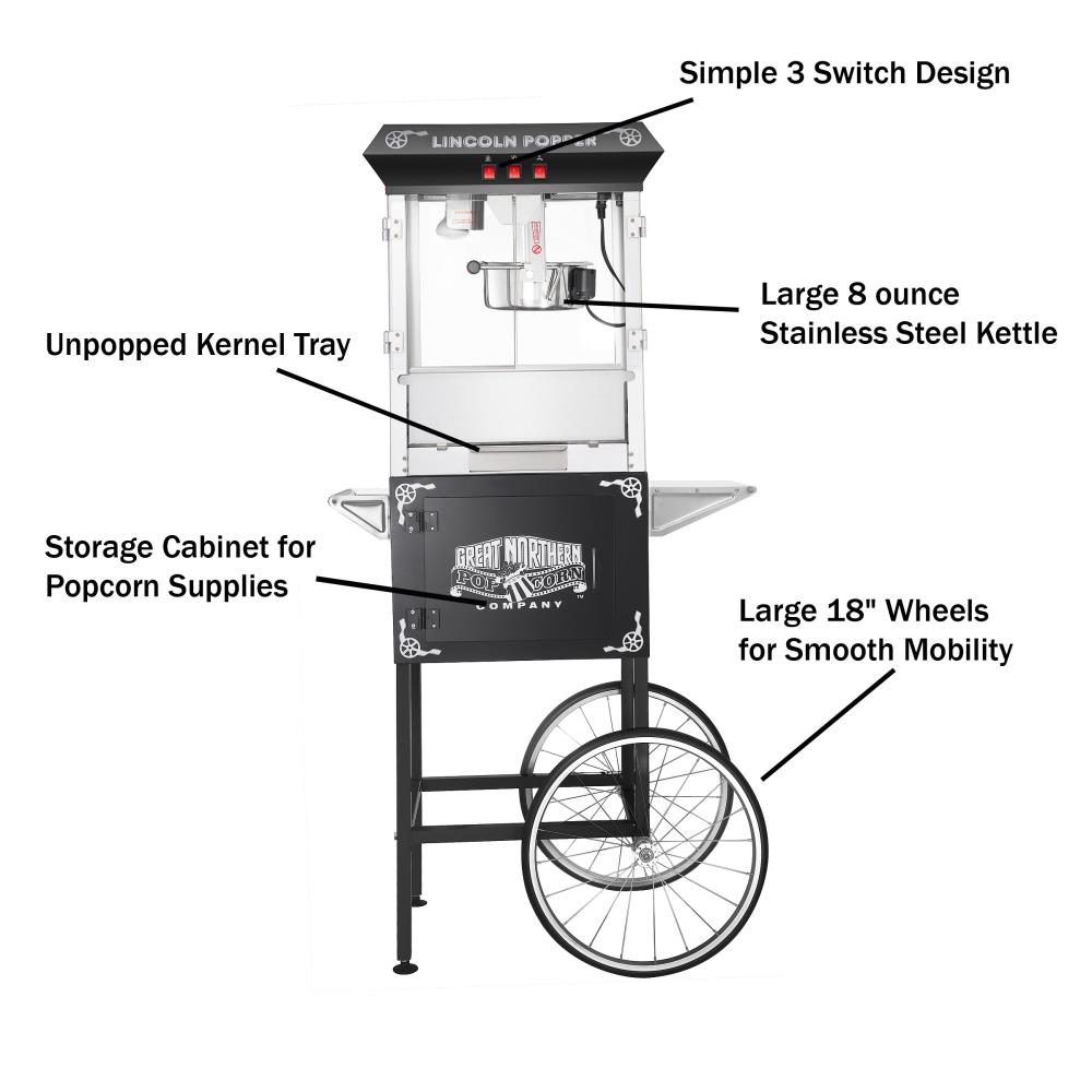 Package Contents: Lincoln Popcorn Machine with Cart- Popper Makes 3 Gallons- 8-Ounce Kettle, Old Maids Drawer, Warming Tray and Scoop by Great Northern Popcorn (Black)