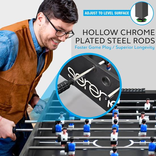4’x 2’ FULL SIZE GAME TABLE: 48” by 24” adult size wood foosball table is professional competition approved for any basement man cave or indoor arcade multigame kids adults games room NO SLIP GRIP: Hollow chrome-plated steel rods mean faster gameplay. Counterweighted players drive power into every twist. Foose ball board sports combo set great for a family activity FOLD-OUT DRINK HOLDERS: Foosebsllball table included 2 football accessories and a multi-fold-out convertible cup holder. Best recreation furniture sets durable and compact game table BUILT TO LAST: Thick bolted table legs, steel cross bar, hard laminated playing surface. Adjust football legs to level the fuse ball tables surface 2 OR 4 PLAYERS: Fuseball home arcade gaming machine. Play one on one or 2 on two table football. Standing or Tabletop setup has high-quality metal hardware and luxury modern design included 2 black and white soccer balls