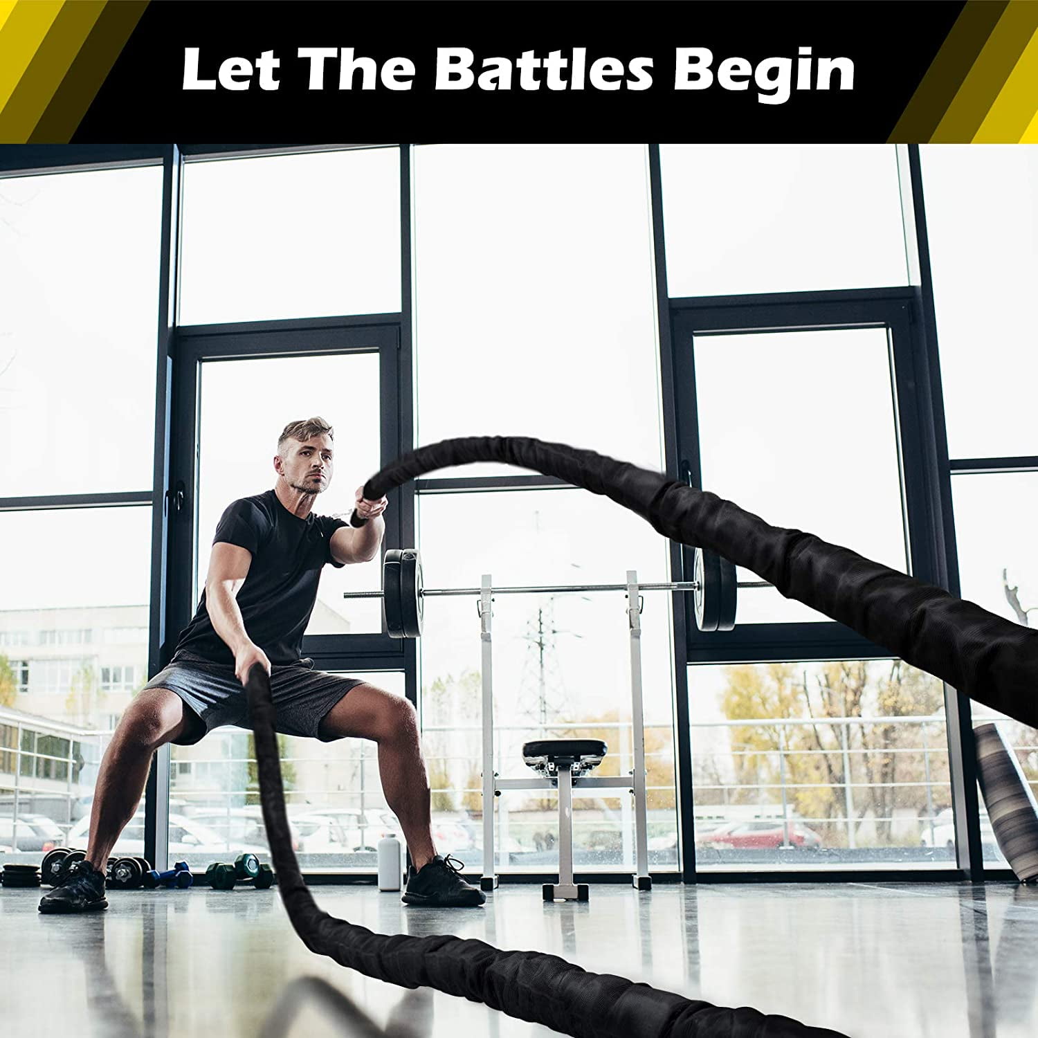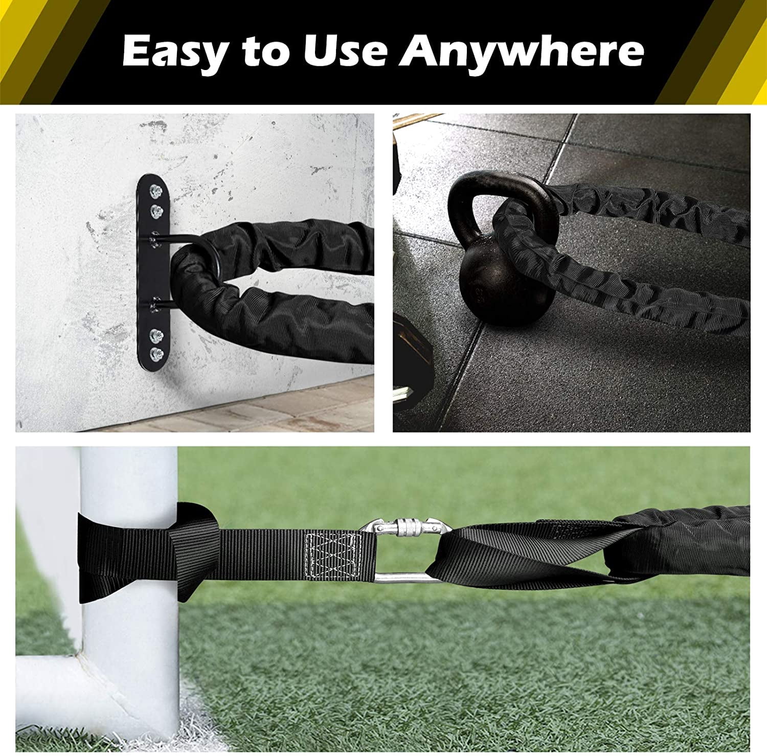 SCULP YOUR MUSCLE AND BURN AWAY THE FAT – Finally! A must-have Battle Rope Set that includes everything you need for abs, arms, shoulders, back, thigh, and legs workouts. Sculp your body and boost your core and abdominal strength. Cardio exercise with this equipment can effectively increase your stamina and provide overall health benefits. DURABLE MATERIAL FOR LONG-LASTING PERFORMANCE – Premium, heavy-duty material guarantees this weighted battle rope won’t start fraying or come apart easily, even on concrete. 2000D polyester sleeve provides extra protection. Long coated handles protect your hands and give you a secure grip for all your training and exercises! Our heavy battle rope is tougher than your toughest workouts. EASY TO SET UP IN GARAGE OR OUTDOORS – Comes with a battle rope anchor and 2 straps with a sturdy carabiner offers more ways to train. Easy and quick to install whether you’re training in a home gym or as part of an outdoor fitness program. Maximize your workout time and reduce time setting up and adjusting equipment. GET AMAZING RESULTS – Battle rope helps you get a full-body, cardio-pumping, and endurance-challenging workout through slams, waves, jacks, throws and pulls. Squat low and build your upper body with core-engaging exercises. Using a range of movements and exercises in a short span of time, you can attack every part of your body with battle ropes just as well as you can during other full-body methods of training. CUSTOMER SERVICE – We fully protect your interests. If you have any questions, please feel free to contact us.