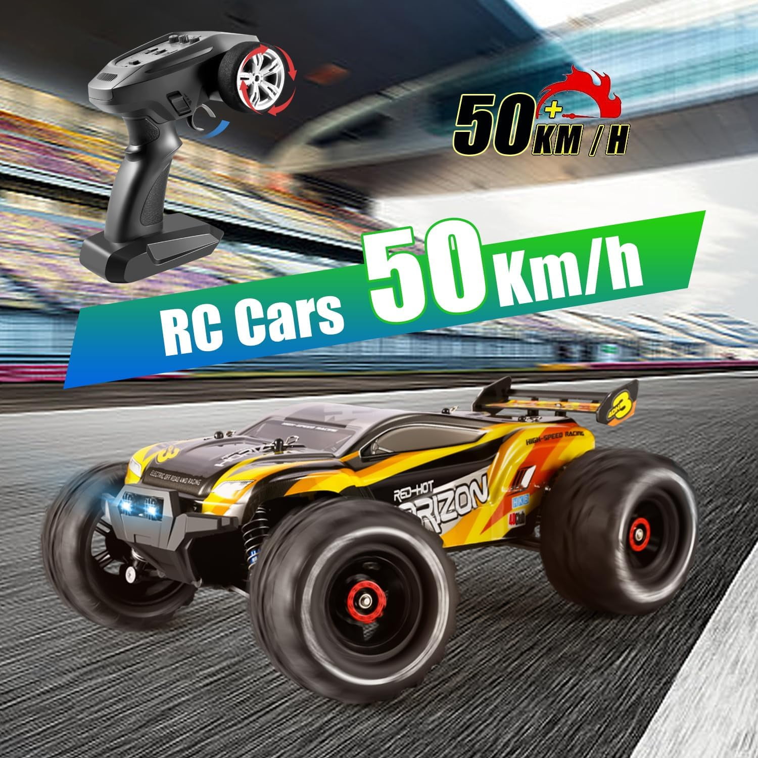 4WD High-Speed RC Truck 60+km/h, 7.4V 850mAh Dual Batteries, Oil-Filled Shock Absorber, PVC Shell – Professional Off-Road Remote Control Car for Adults & Kids (Key Features) 60+ km/h Racing Speed – 380 high-speed motor with 4WD system for extreme off-road performance 2×7.4V 850mAh Batteries – Double runtime (30+ mins total) with 2 charging cables included Military-Grade PVC Shell – High-toughness protective coating withstands brutal crashes Professional Shock Absorbers – Oil-filled damping system conquers rugged terrain Competition-Grade Tires – Ultra-grip tread pattern for dirt/gravel/sand surfaces Complete Accessory Kit – Includes spare parts, tools, and detailed manual Drive System: 4WD 380 high speed motor Speed: 60+ km/h, 23+ mph Playing Time : 2* 15+ mins (Depends on playing operations) Charging Time: about 120mins Remote Control Battery: 3 x 1.5V AA Battery(Not included) Truck Battery: 7.4V/850mAh battery (x2) PACKAGE CONTENT: 1* RC Truck 1* 2.4GHz Remote Controller 2* Truck Batteries 2* USB Charging Cable 1* User Manual 1* Spare Parts Kit (1* Socket Wrench, 1* Cross Screwdrivers, 4* Body Clip)