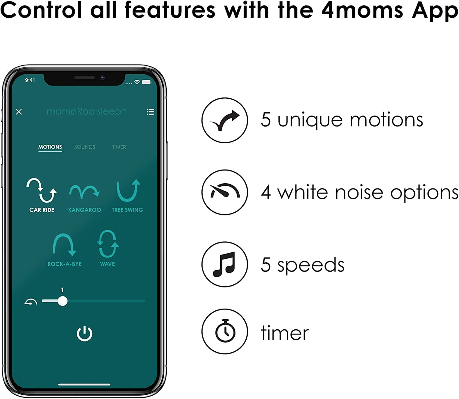 5 parent-inspired motions, 5 speeds 4 white noise options Safe Sleep Environment – firm, flat sleep surface with mesh sides for visibility and breathability Bluetooth functionality – easily adjust motion, speed, sound, or set a timer with the 4moms app Find Your Roo, exclusively on the 4moms app, helps you find the best MamaRoo motion and speed combination for your infant that are inspired by your own natural soothing moves Adjustable height (2 options) Water resistant mattress (sheet included)