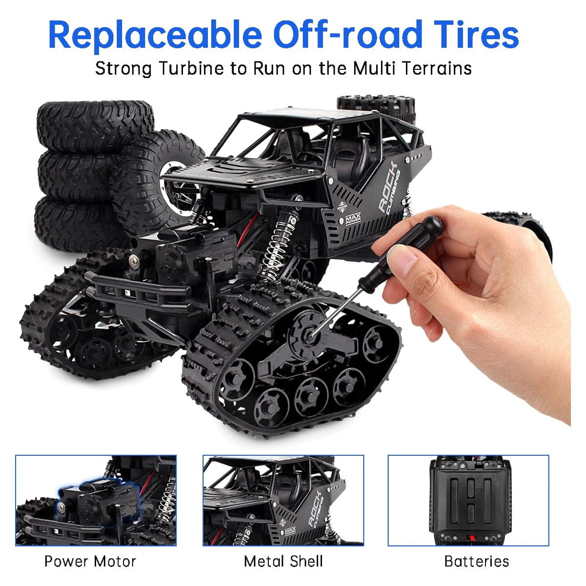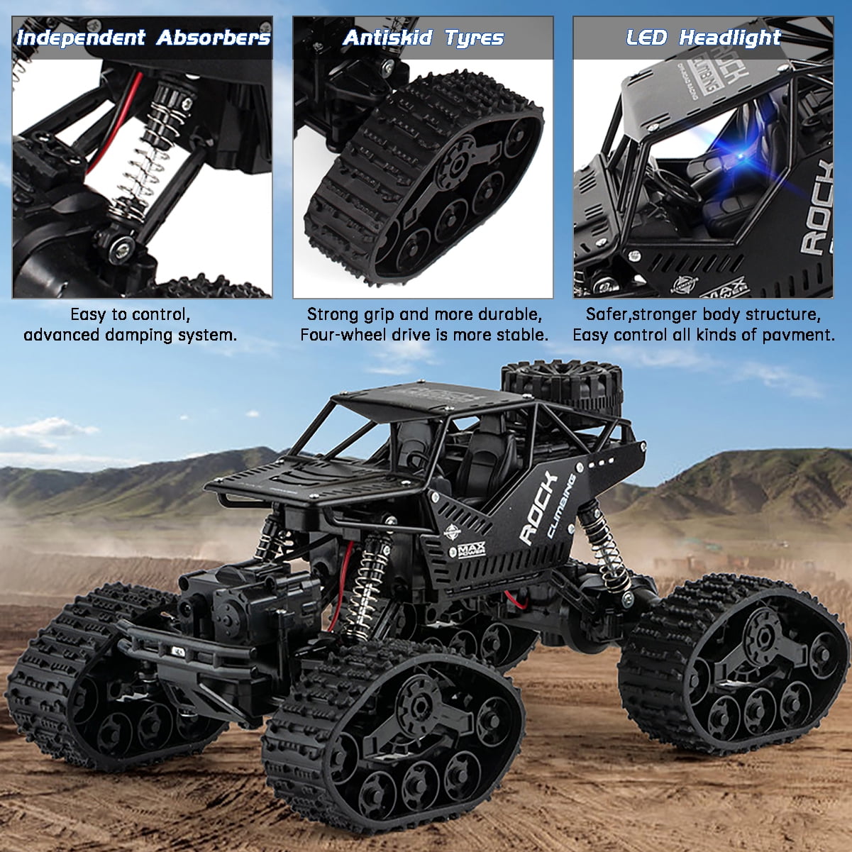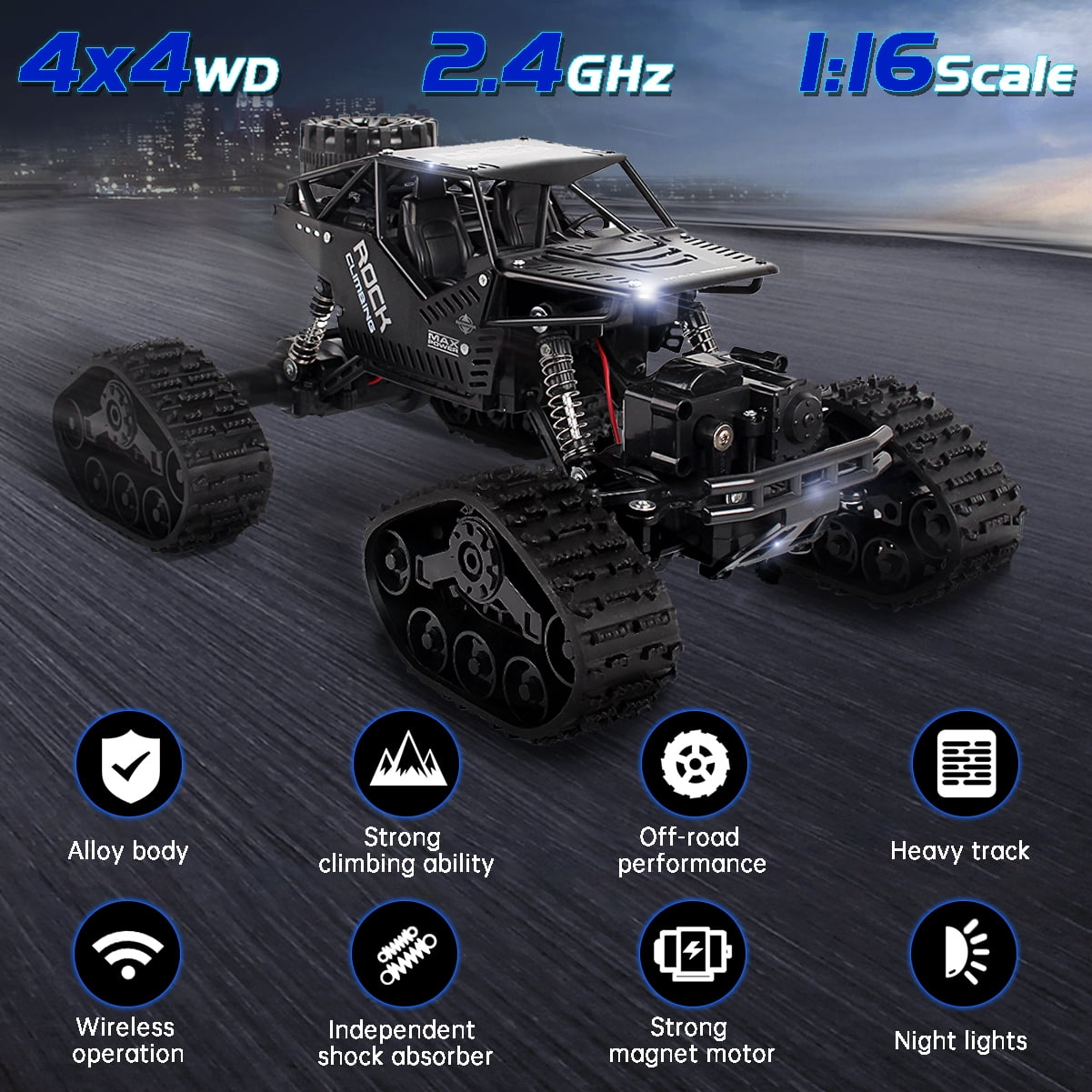 The whole chassis of the remote control car is made of ABS plastic and the main body is made of aluminium alloy material. All these properties give the truck a better collision resistance to prolong its life span. High strength, scratch-resistant, corrosion resistant characteristics – better protect the body in daily use and enjoy the fun of this truck This is a toy grade rc car. The 1/16 scale makes it easier to control,it can go up to 18Km/h at full speed with a brushed powerful built-in motor With Metal Oil-filled Shock Absorbers: The four wheels are all packed with the Metal Oil-Filled Shocks. Allow you to drive the remote control car in all terrains like beach, sand, rock, or concrete road. It can protect the electronic components inside the car body, make you enjoy the toy car for a longer period of time. Equipped with a 2.4GHz full-scale synchronous remote control system and can proportional controlled to throttle and speed. Very easily! Adjust the speed switch clockwise to increase driving speed, and adjust the speed switch counterclockwise to decrease the driving speed. Adjust the driving direction of the wheels through the steering trim.