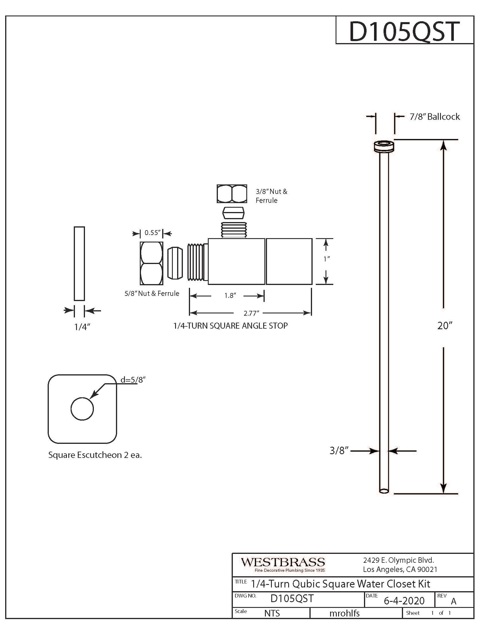 The Westbrass 5/8 inch compression (1/2 In. nominal copper pipe) inlet x 3/8 In. OD outlet valve and matching sure-grip escutcheon, combines with a 3/8 x 20 In. annealed copper toilet supply riser to make it easy to outfit your toilet. The kit includes everything required to supply water to your water closet, including an attractive Qubic angle stop, flange and flat head riser. Available in a variety of decorative finishes, this is sure to turn a functional but ugly installation into a complementary work of art.