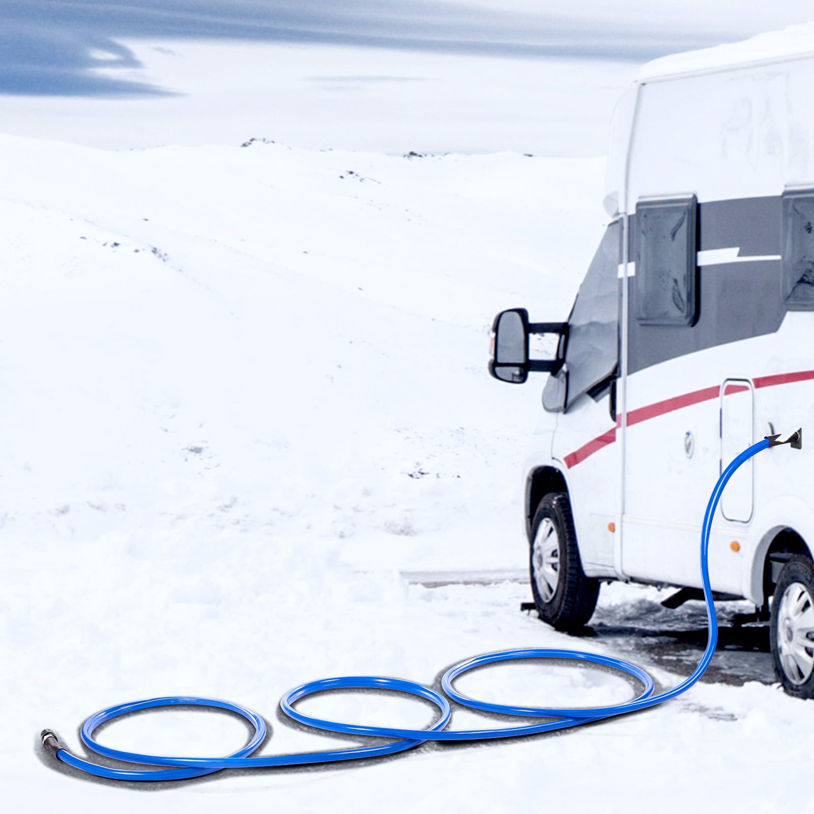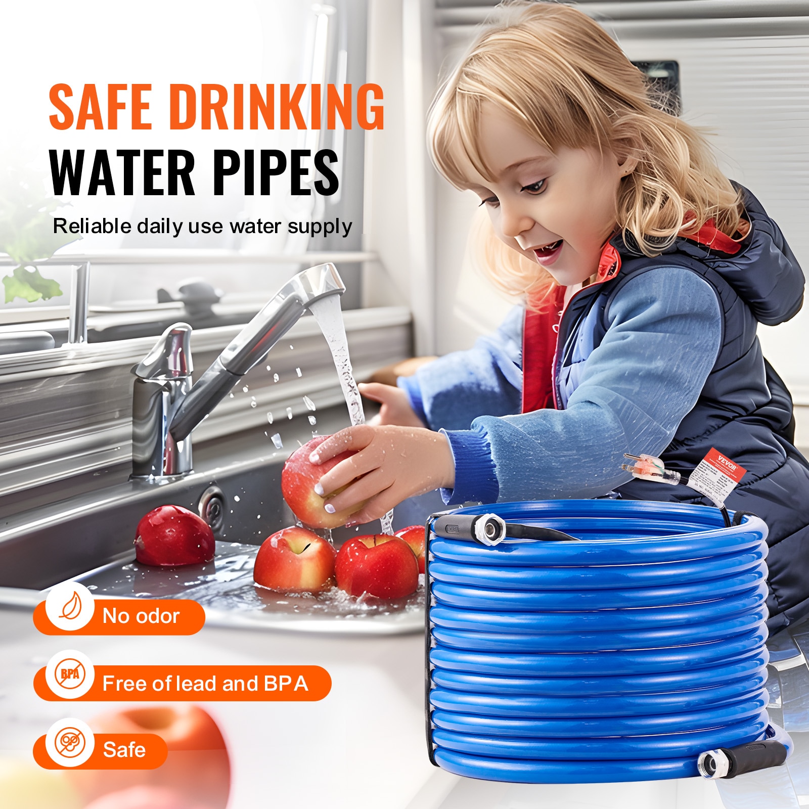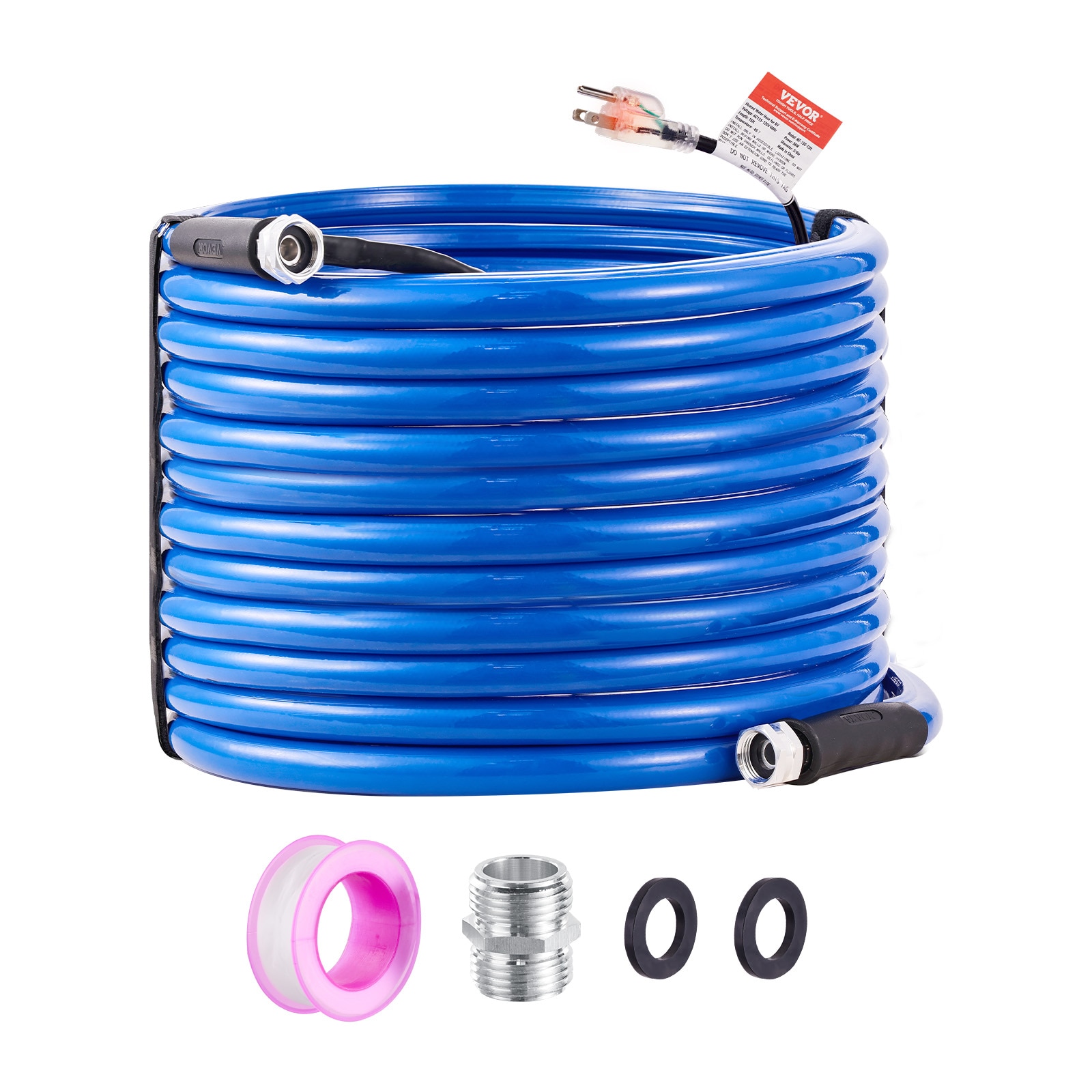 Use VEVOR RV Heated Water Hose, No More frozen water in winter!: Our corrugated heated water hose ensures steady water flow at -45°F; The durable outer layer provides even heating and prevents breakage, while the safe inner material ensures clean water; Compatible with various faucets; Available in 15, 25, 30, 50, 75 and 100 ft lengths to meet your needs;; [Package Content] 1 x 3/4″ Male Connector; 2 x Waterproof Rubber Rings; 1 x Thread Seal Tape; 1 x User Manual