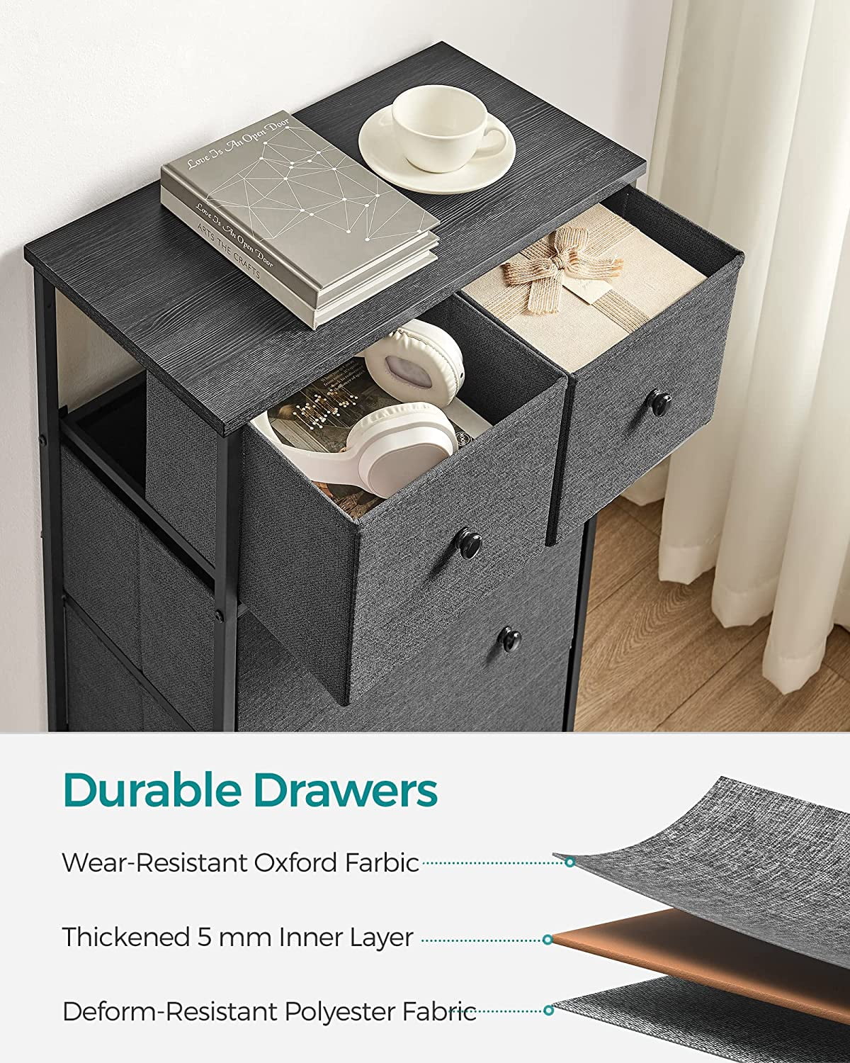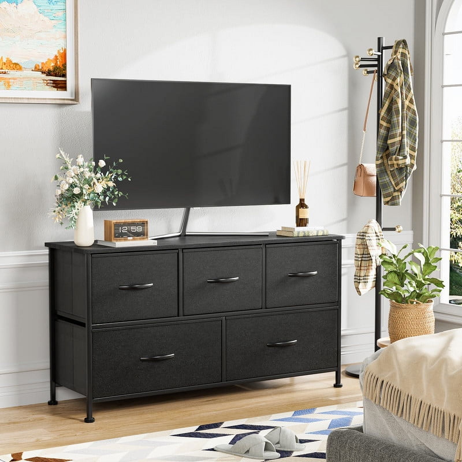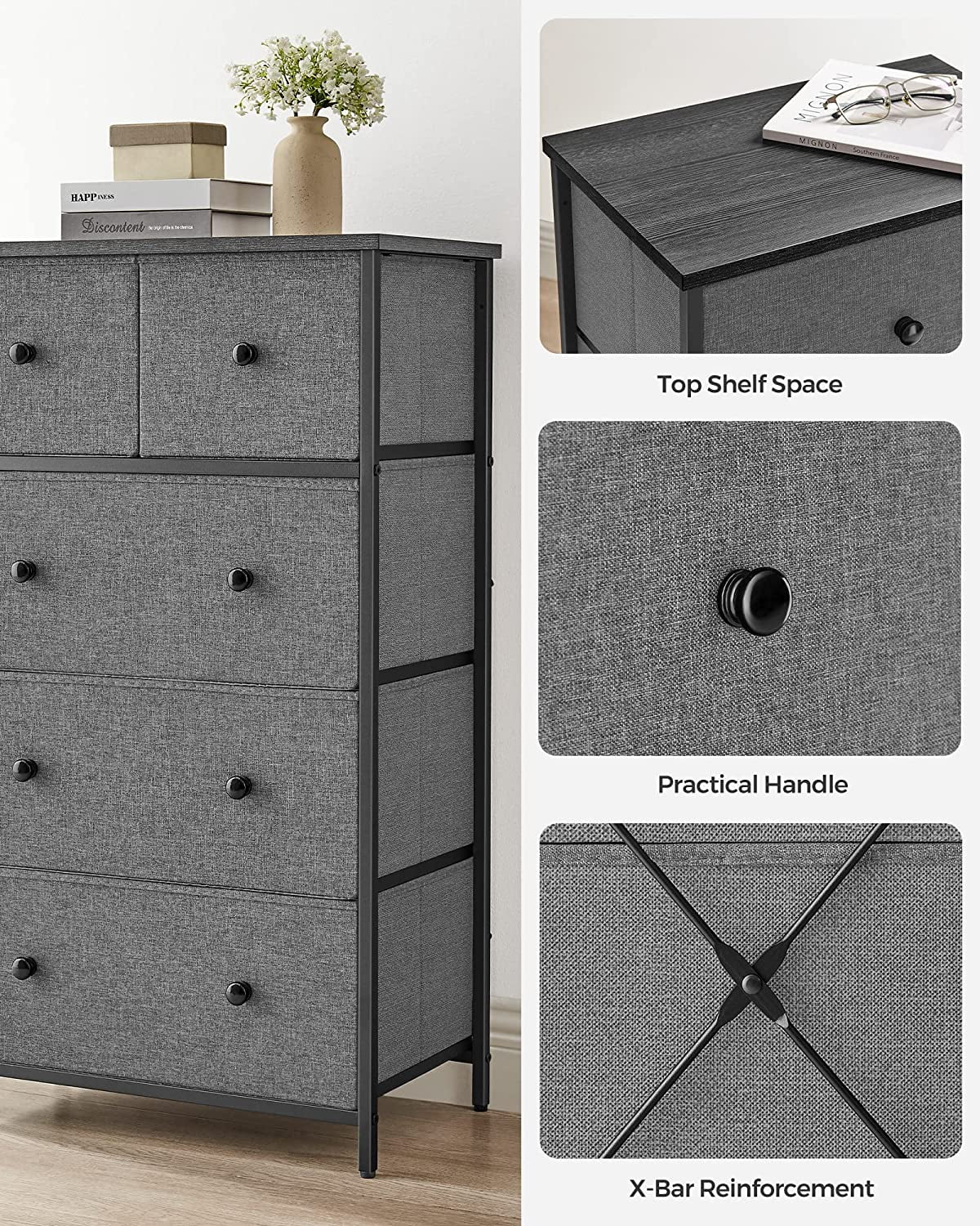 5-Drawer Fabric Storage Unit Dresser with Wooden Front and Metal Frame, Gray Organize your space with ease using this 5-drawer dresser, perfect for storing clothes and freeing up closet space Stylish design featuring gray fabric drawers, a black panel with wood grain, and smooth solid wood knobs for a charming look Constructed with a sturdy metal frame, particleboard top and front, and lightweight fabric drawers for durability and stability Versatile storage solution suitable for various rooms: use it in the closet for workout gear, in the for items, or in the entryway for everyday essentials Includes 5 fabric drawers, adjustable feet for stability, and easy assembly for a practical addition to your home