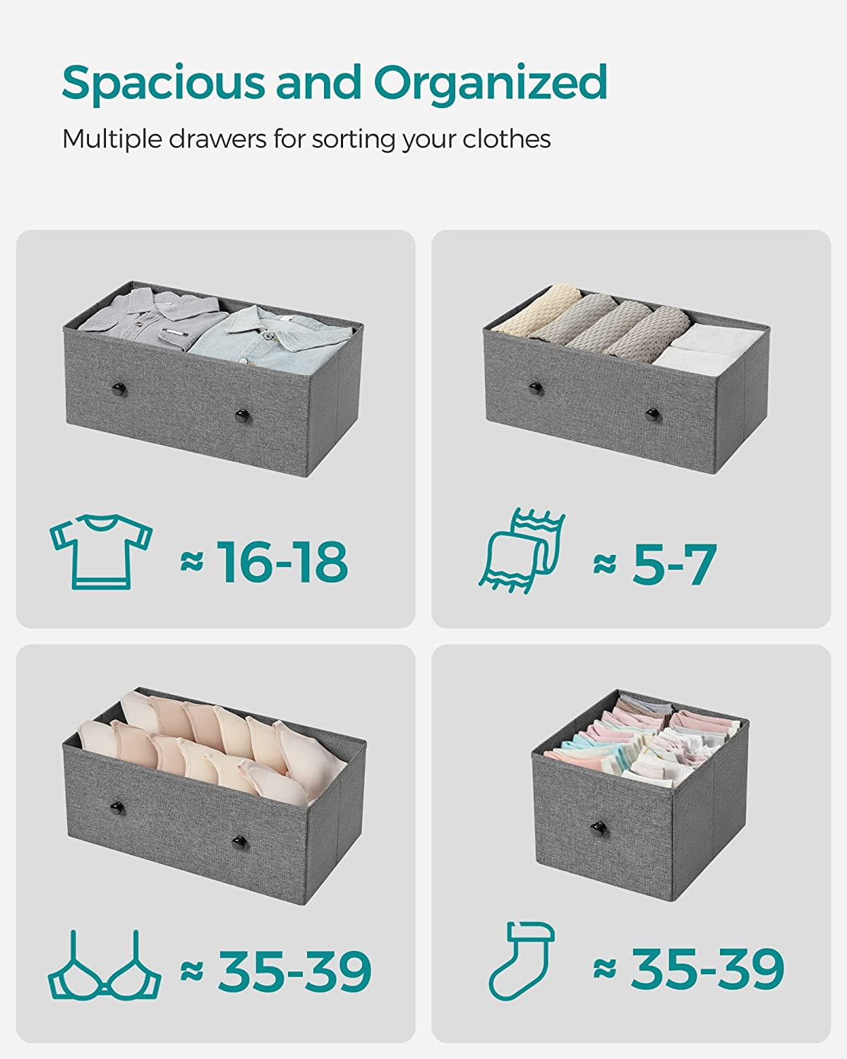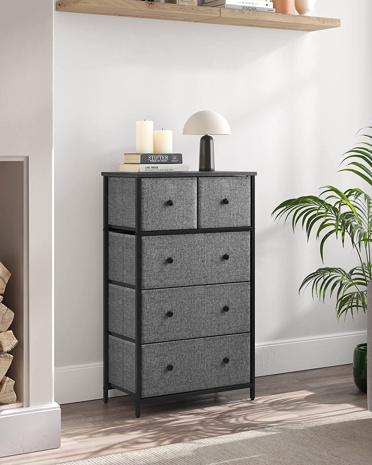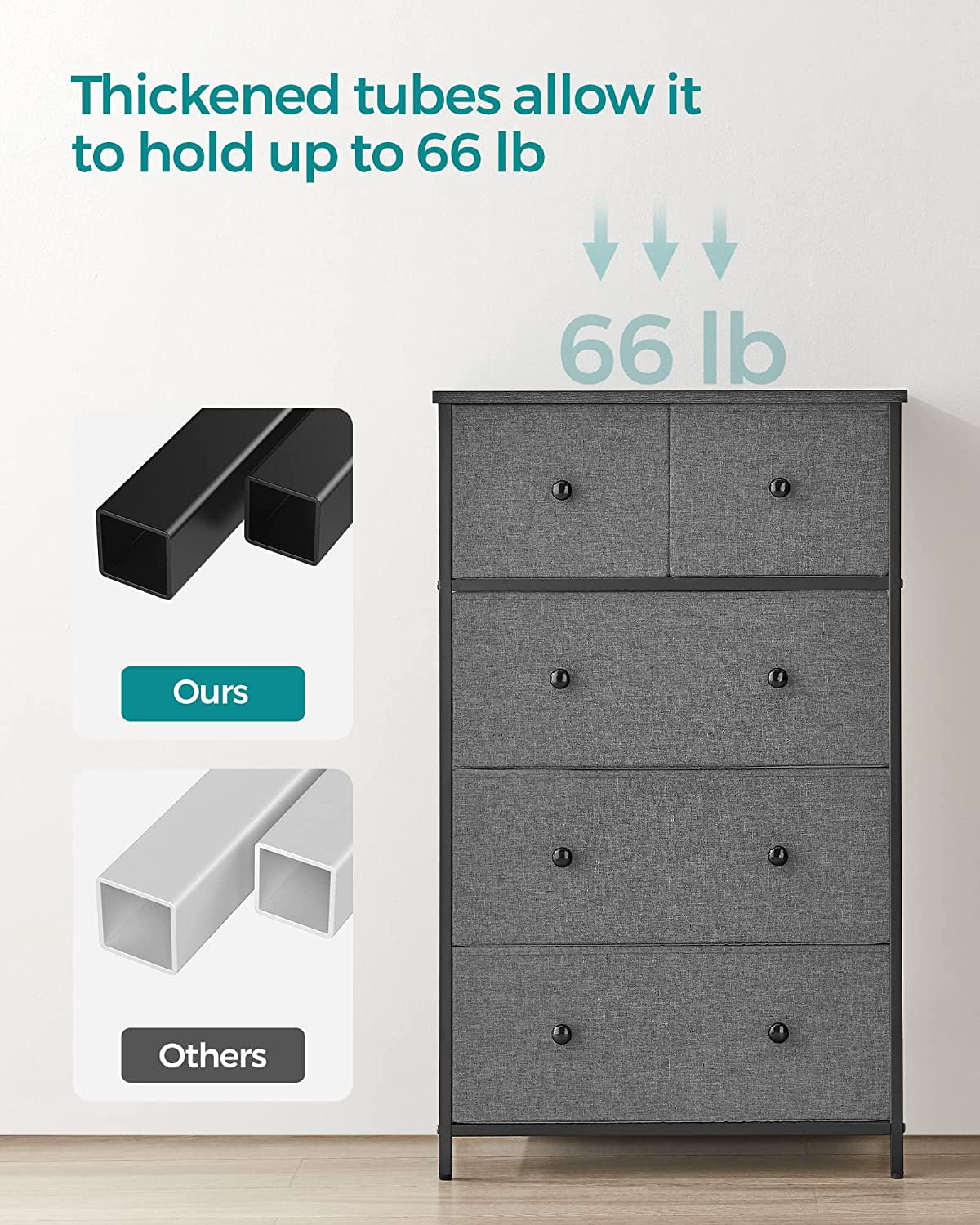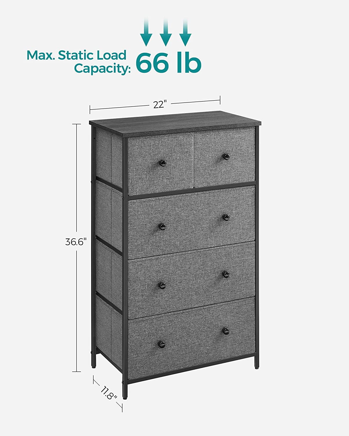 5-Drawer Fabric Storage Unit Dresser with Wooden Front and Metal Frame, Gray Organize your space with ease using this 5-drawer dresser, perfect for storing clothes and freeing up closet space Stylish design featuring gray fabric drawers, a black panel with wood grain, and smooth solid wood knobs for a charming look Constructed with a sturdy metal frame, particleboard top and front, and lightweight fabric drawers for durability and stability Versatile storage solution suitable for various rooms: use it in the closet for workout gear, in the for items, or in the entryway for everyday essentials Includes 5 fabric drawers, adjustable feet for stability, and easy assembly for a practical addition to your home