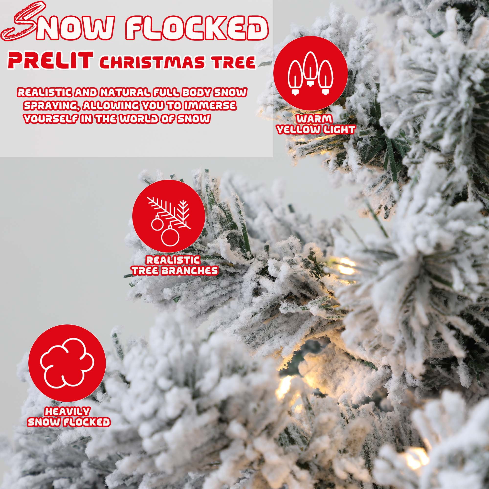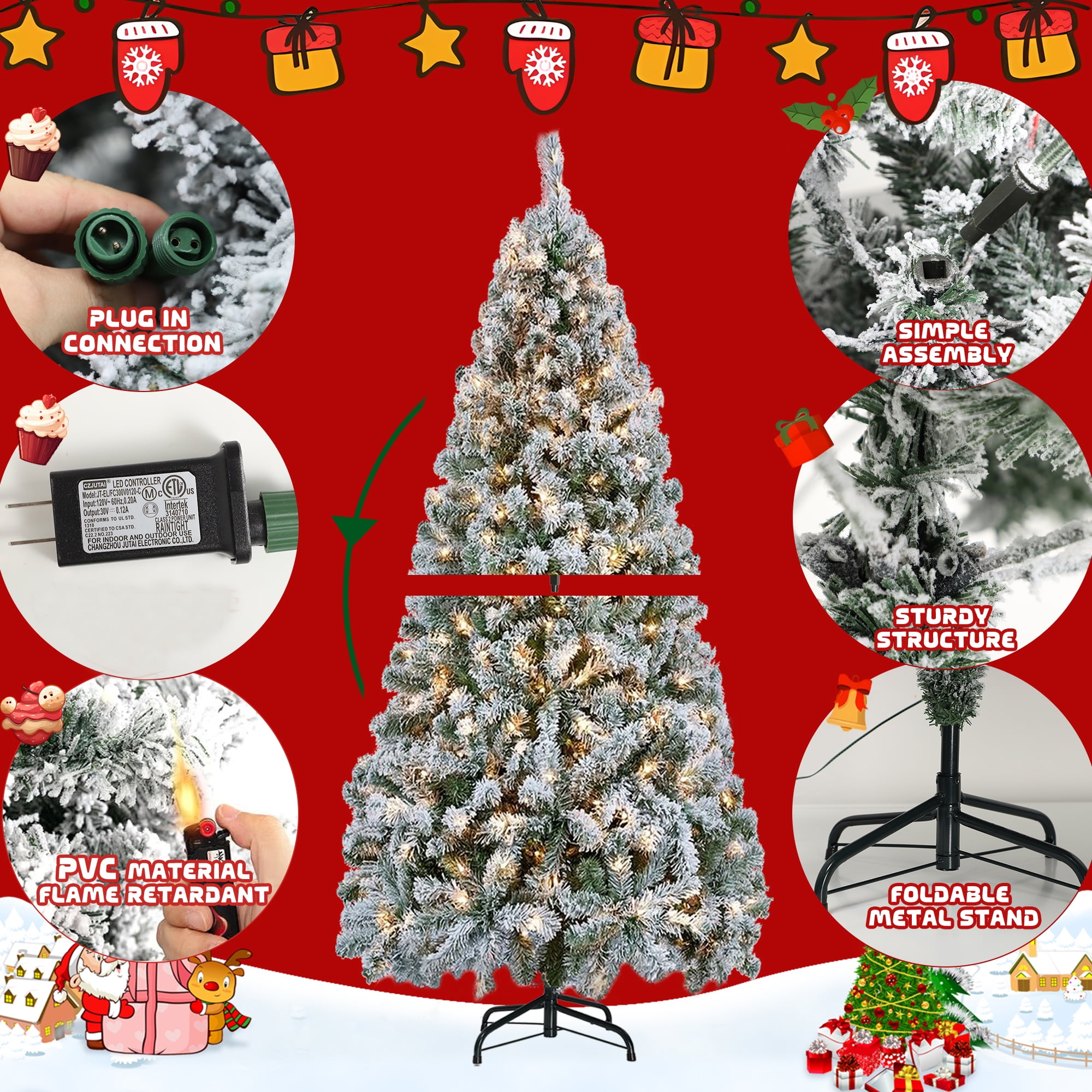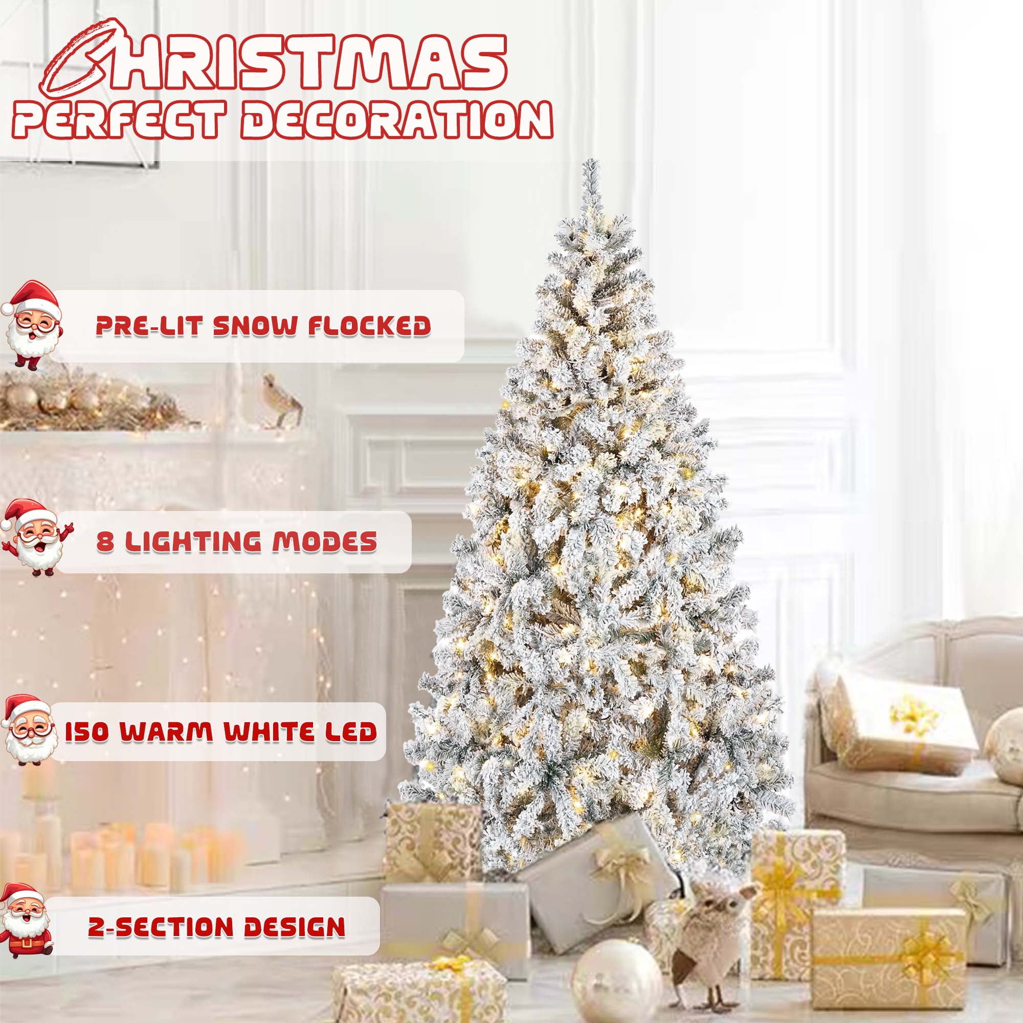 ????Exquisite Snow-Flocked Design: Our artificial Christmas tree covered with flocking with a foldable metal stand and 400 tips. The hinged-fir holiday tree with 150 incandescent warm white lights will give your house a cozy and inviting glow. ????Pre-Lit Design & 8 Lighting Modes – The pre-lit Christmas tree is equipped with 150 warm-white LED lights, 8 dynamic lighting modes to choose from, allowing you to customize the ambiance to match any occasion or mood. And it comes with a memory function that will restore the previous mode upon startup. ????Durable Branches & Sturdy Base: Experience a blend of realism and durability with our artificial Christmas tree, featuring lifelike branches and a robust metal base. Each branch is crafted from durable PVC to mimic a real tree, and the stand can safely support this Christmas tree with lush tips. ????Convenient Hinges & 2-Section Design – The artificial Christmas full tree is equipped with a convenient hinged structure, which can help branches automatically spread out, saving time and effort on installation. In addition, it can be detached into 2 sections, allowing for space-saving storage when the season is over. ???? DIY Decoration: The sturdy metal frame of this pre-lit Christmas tree prevents collapse, allowing you to decorate it to your liking. Gather your loved ones and enjoy a delightful time hanging ornaments (not included), creating a full and glittering centerpiece for your holiday celebrations.