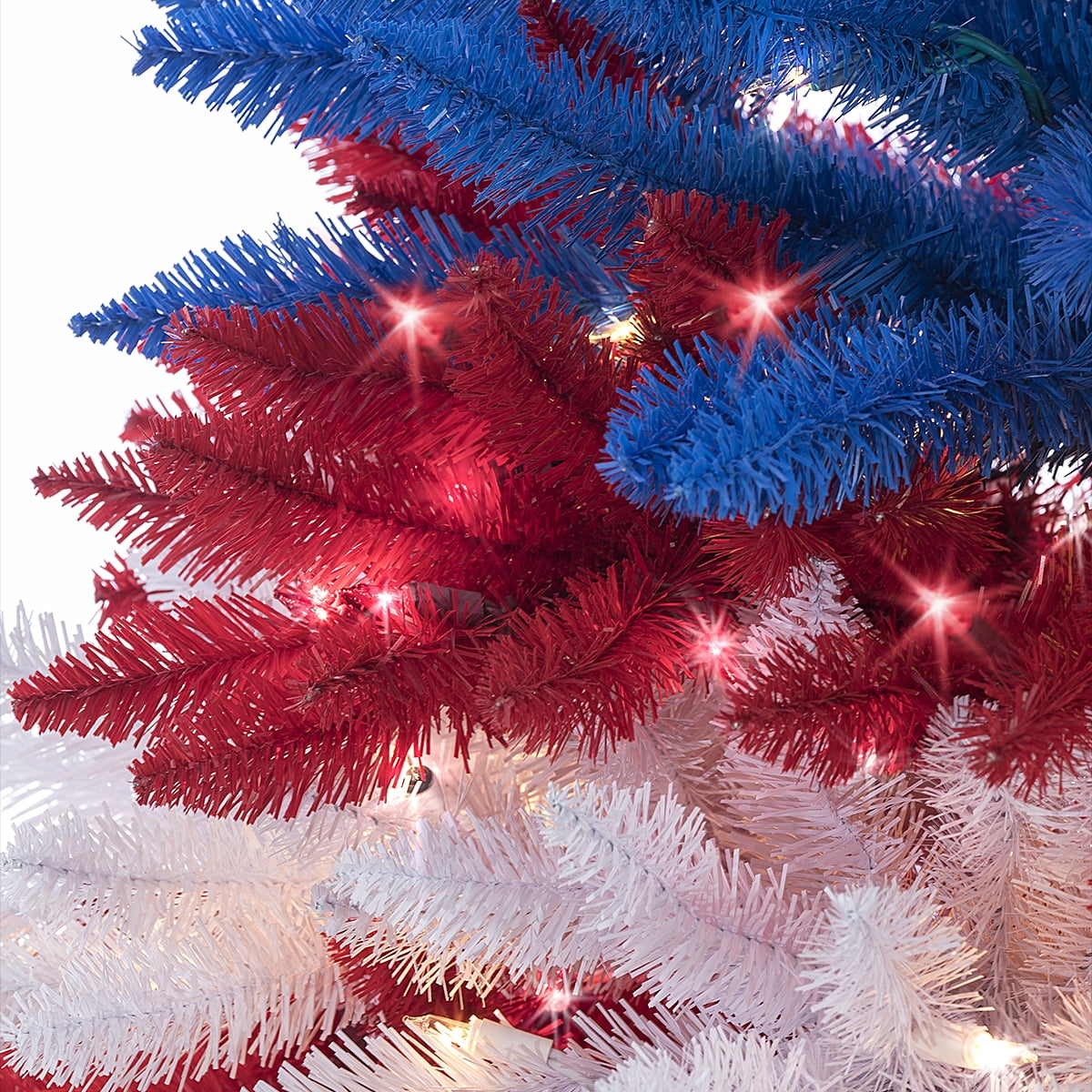 Assembled Tree Dimensions: 38InL by 38InW by 60InH Pre-Strung with 495 Clear Incandescent Lights and 5 Twinkle lights on the top section This tree has 1057 branch tips to show off your favorite ornaments and decorations Includes 17-Inch Diameter Metal Four Prong Stand for Stability in any Environment Operates by Brown 72″ Lead Cord Allowing Versatility in Placement This tree is perfect for celebrating the Fourth of July with it’s red, white and blue colored PVC branches