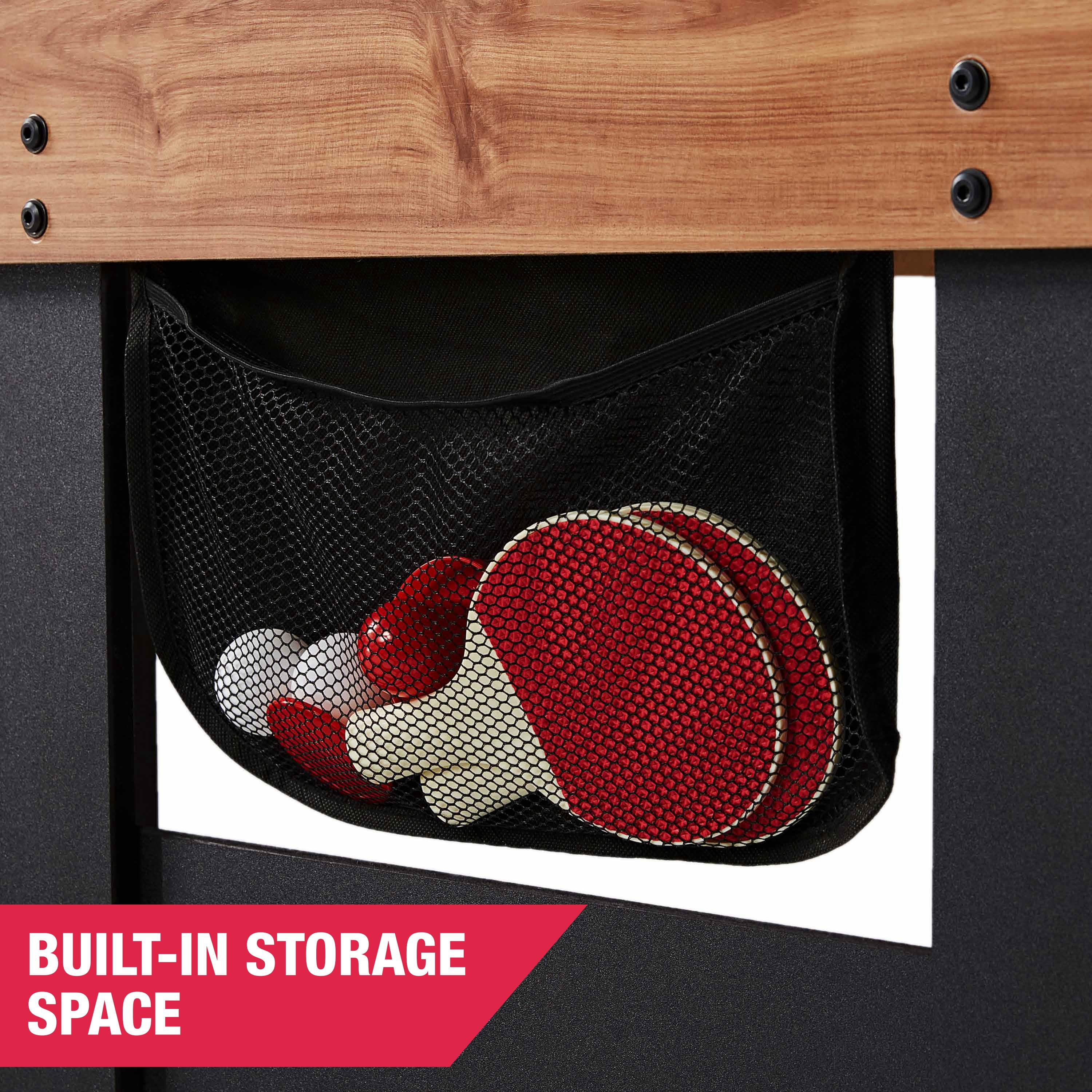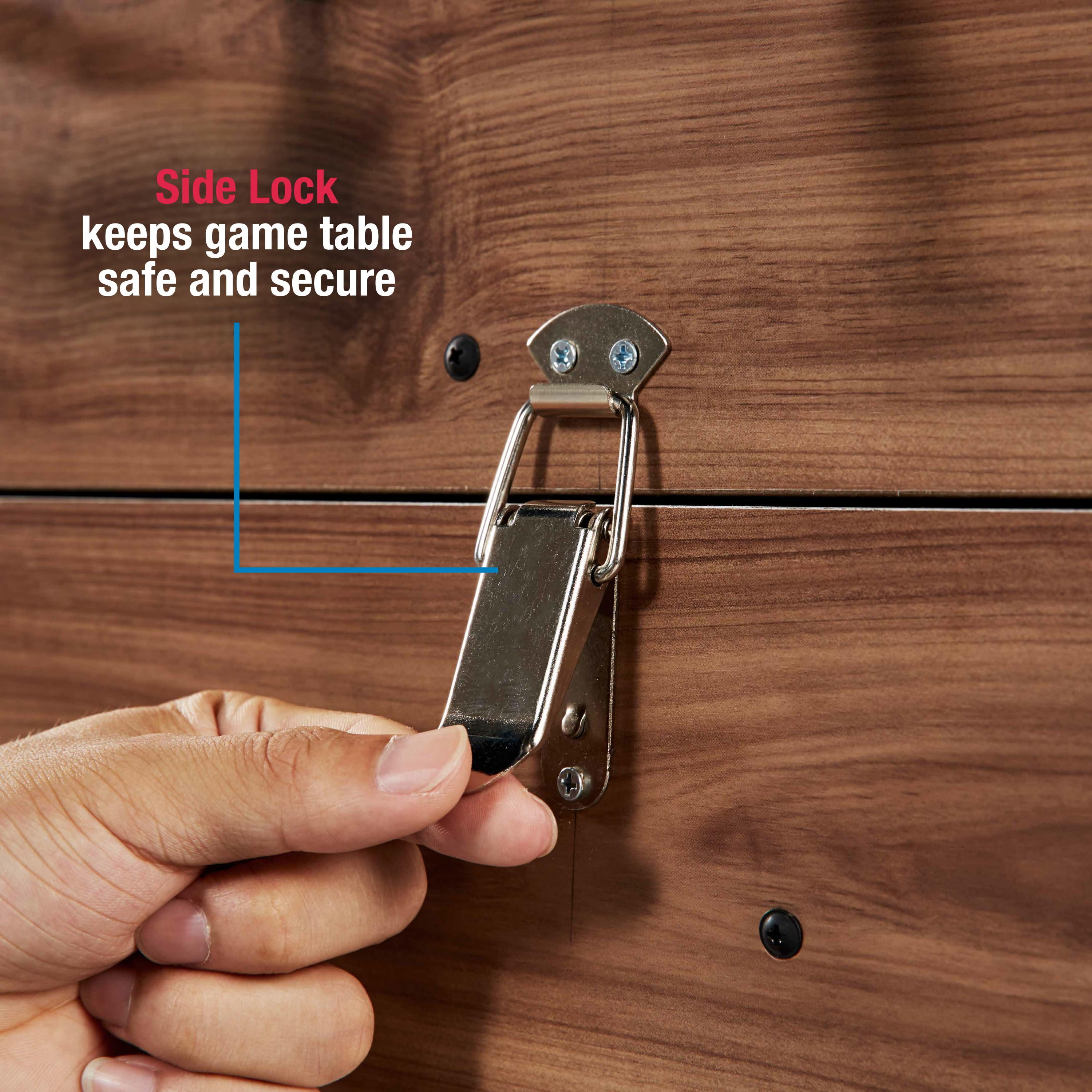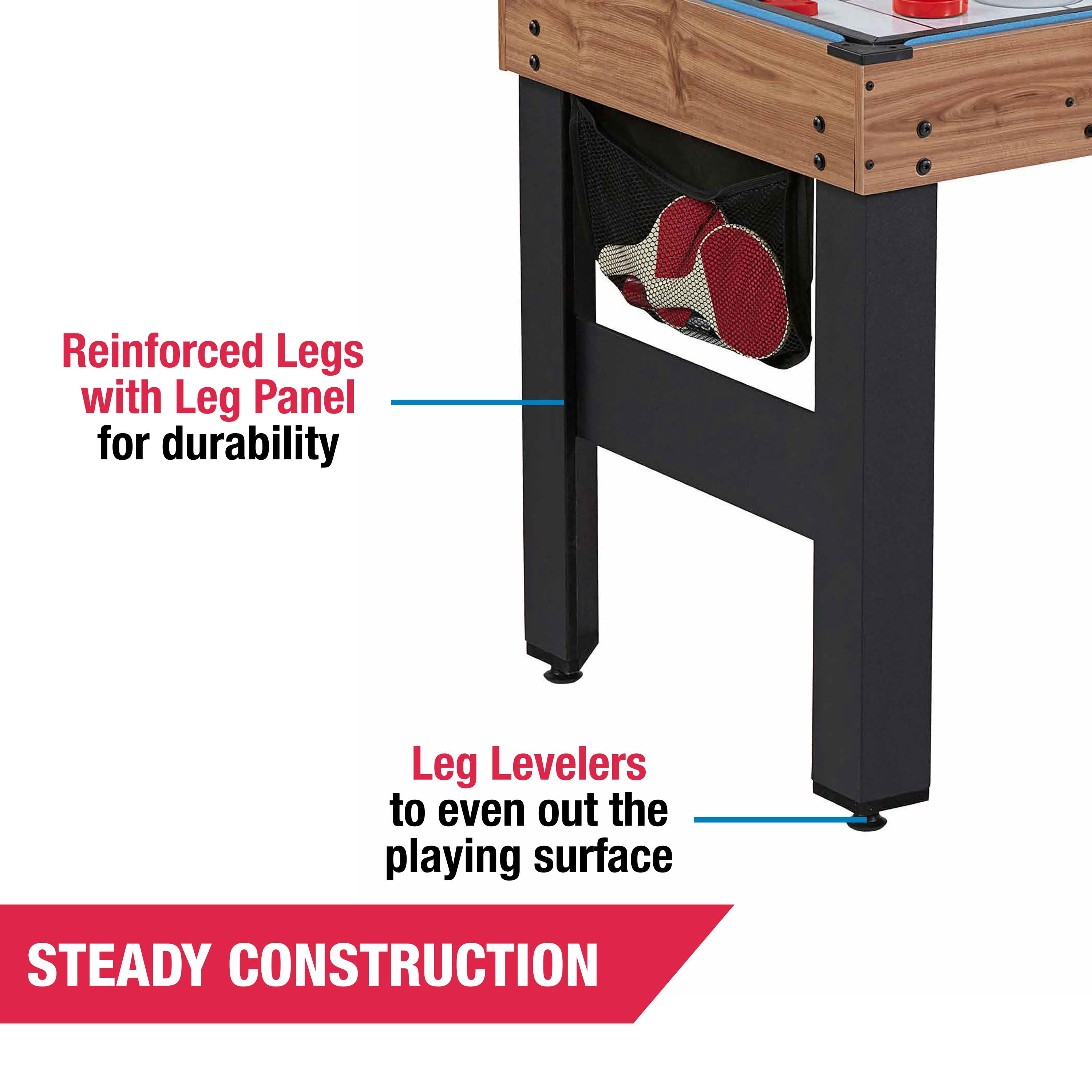 MD Sports 48” 5-in-1 Combo Game Table, Slide Hockey, Billiards, Foosball, Table Tennis and Basketball, All-in-One Multi Game Table Perfect for Family Game Rooms 5-IN-1: Enjoy five exciting games on one compact table. This game table measures 48” (foosball goal to goal) and includes Slide Hockey, Billiards, Foosball, Table Tennis, and Basketball. It’s cost-effective and keeps the family entertained for hours. BILLIARDS AND FOOSBALL – The velvet-covered pool table allows a smooth ball roll into drop pockets. The foosball table stacks securely on top with latches on each side. Easy to assemble soccer players fit onto 0.5” steel rods. A slide scorer tracks goals. HOCKEY, TABLE TENNIS, & BASKETBALL: Hockey and table tennis use a 9mm laminated board for smooth puck gliding and responsive ball bounce. Just flip the board for each game. The tennis top doubles as a backboard for shooting hoops with a 9.5” plastic rim. CRAFTSMANSHIP: The table features a durable .5” apron made of resilient, woodgrain-laminated engineered wood and sturdy legs reinforced with PVC laminated panels. 1.5″ leg levelers ensure an even playing surface on various flooring. SIZE AND SPACE – The compact table (48.5″L x 22.75″W x 32.5″H) is a space-saver. The suggested room size is 11’ x 9’. A netted storage bag holds your hockey and table tennis accessories. The multi-game table is a great gift for any member of the family. GET READY TO PLAY: Includes Air Pump and Needle, 5” Basketball, Billiard 1.25” Ball Set, Net Set with 9.5” Plastic Rim, Brush, (2) Chalk Sticks, (2) 36” Cue Sticks, (2) Pushers, (2) Pucks, (2) Soccer Balls, (2) Paddles, (2) Table Tennis Balls.