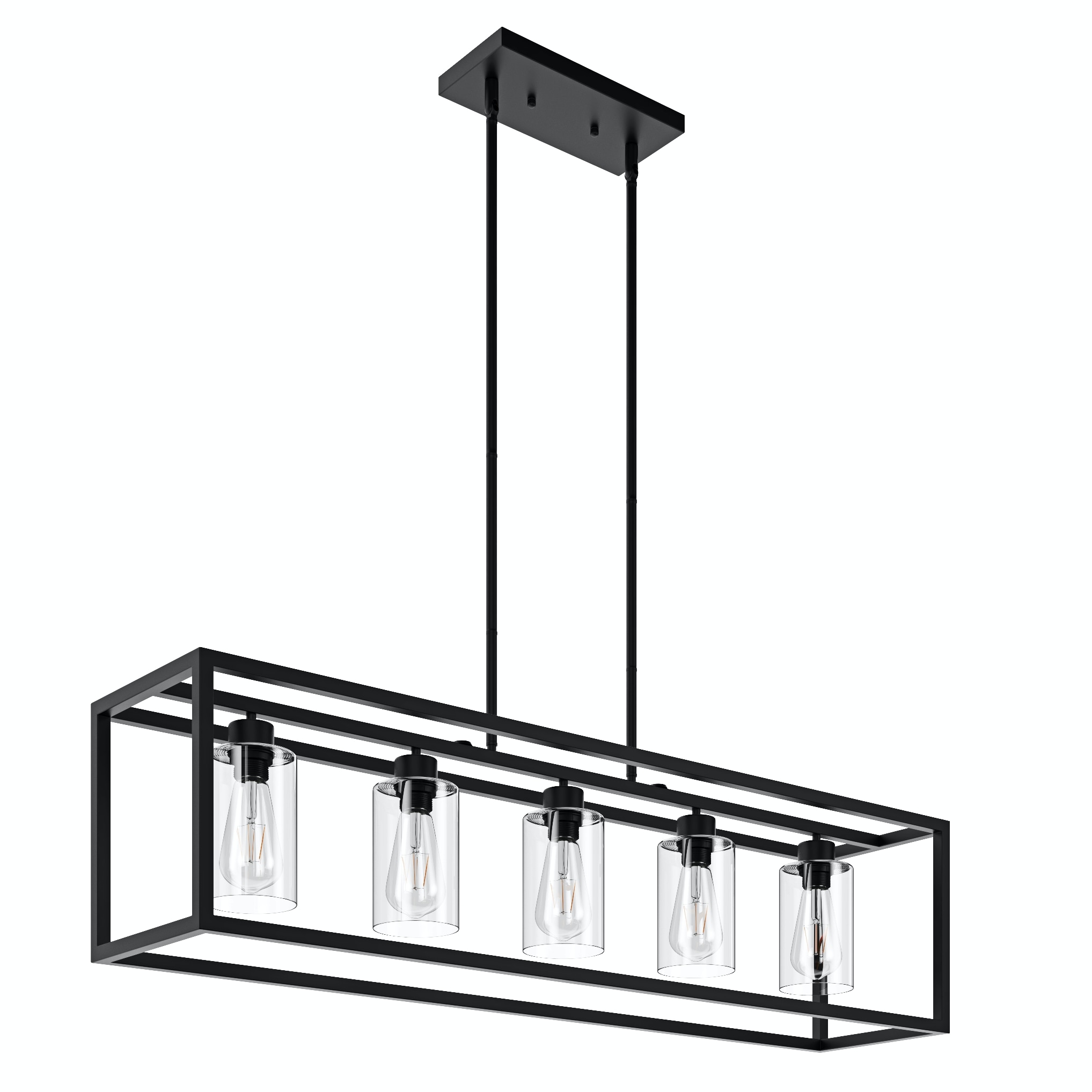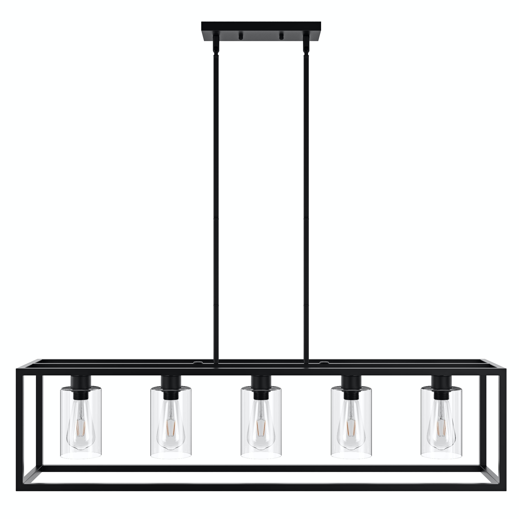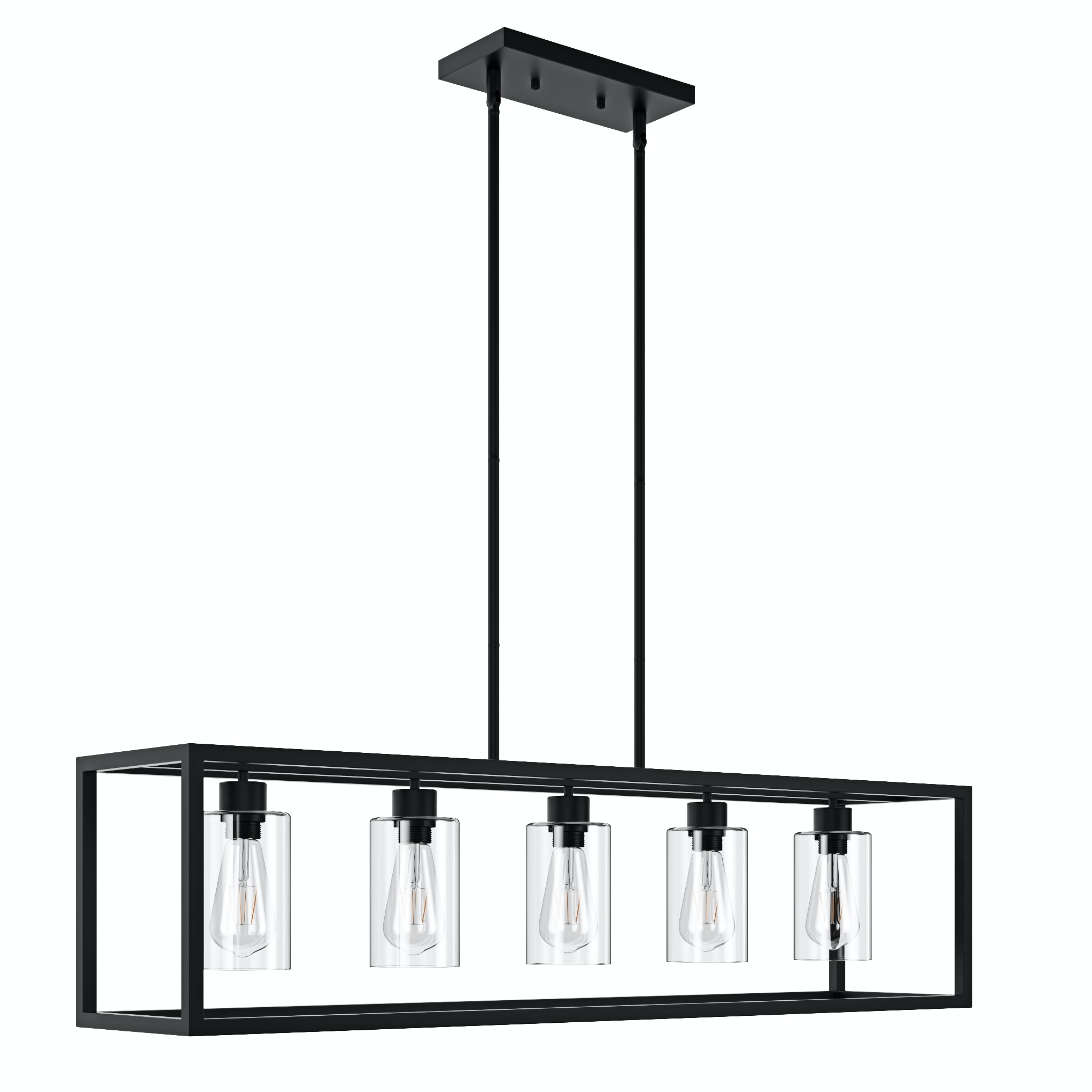 This 5 light rectangular chandelier is unique and perfect decoration for the modern or farmhouse home, minimal lines and modern tones give the light an edge that never disappoints. The corners of its simple cage frame are accented by square blocks, all finished in a deep earth black with clear glass. Perfectly for kitchen island,dining room,living room,cafe, bar,club,warehouse,hallway.