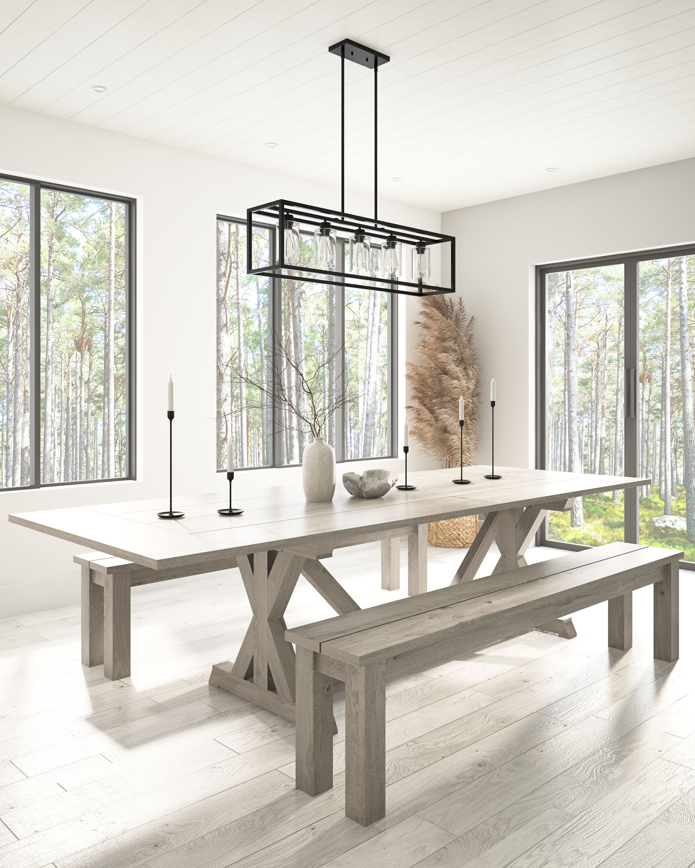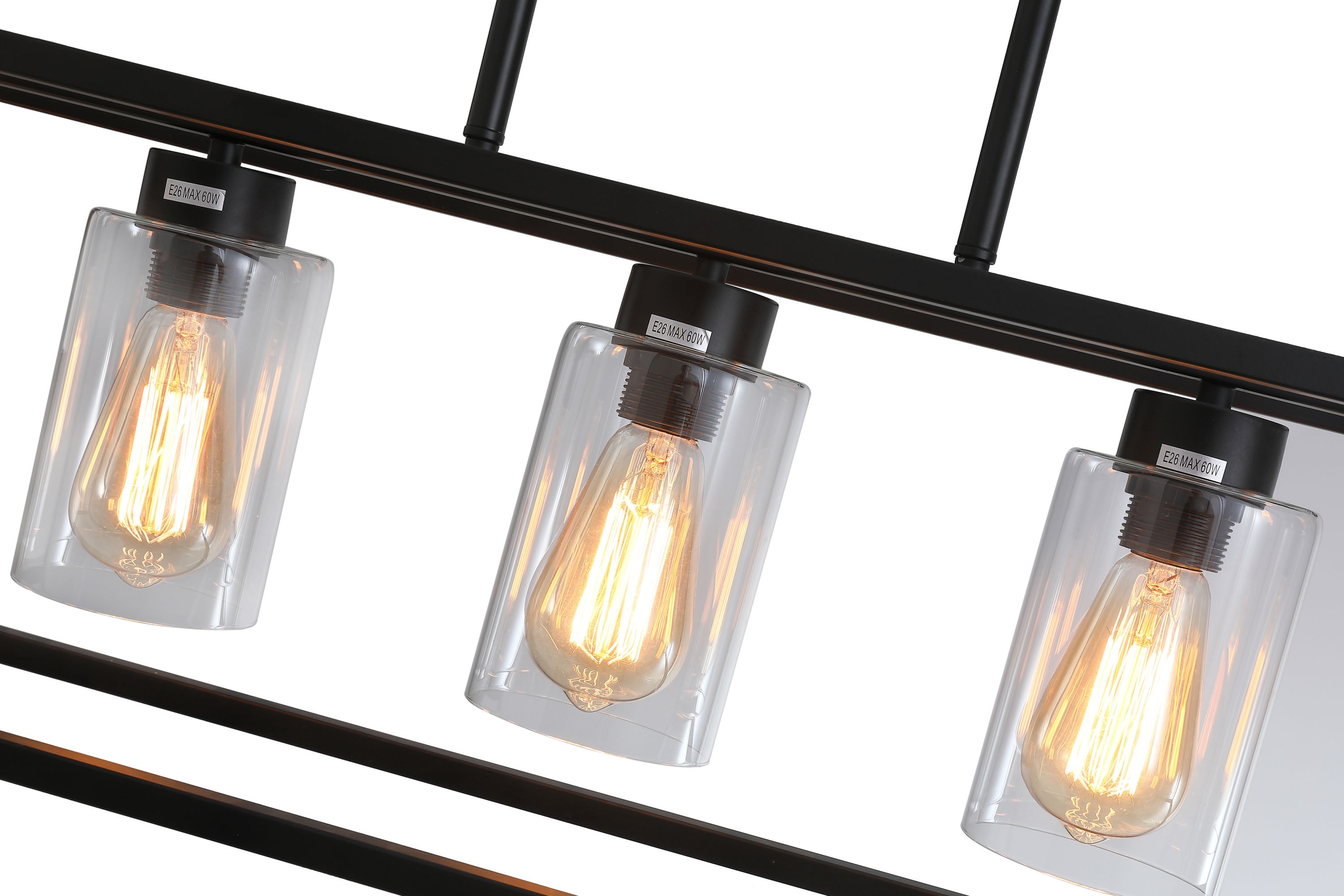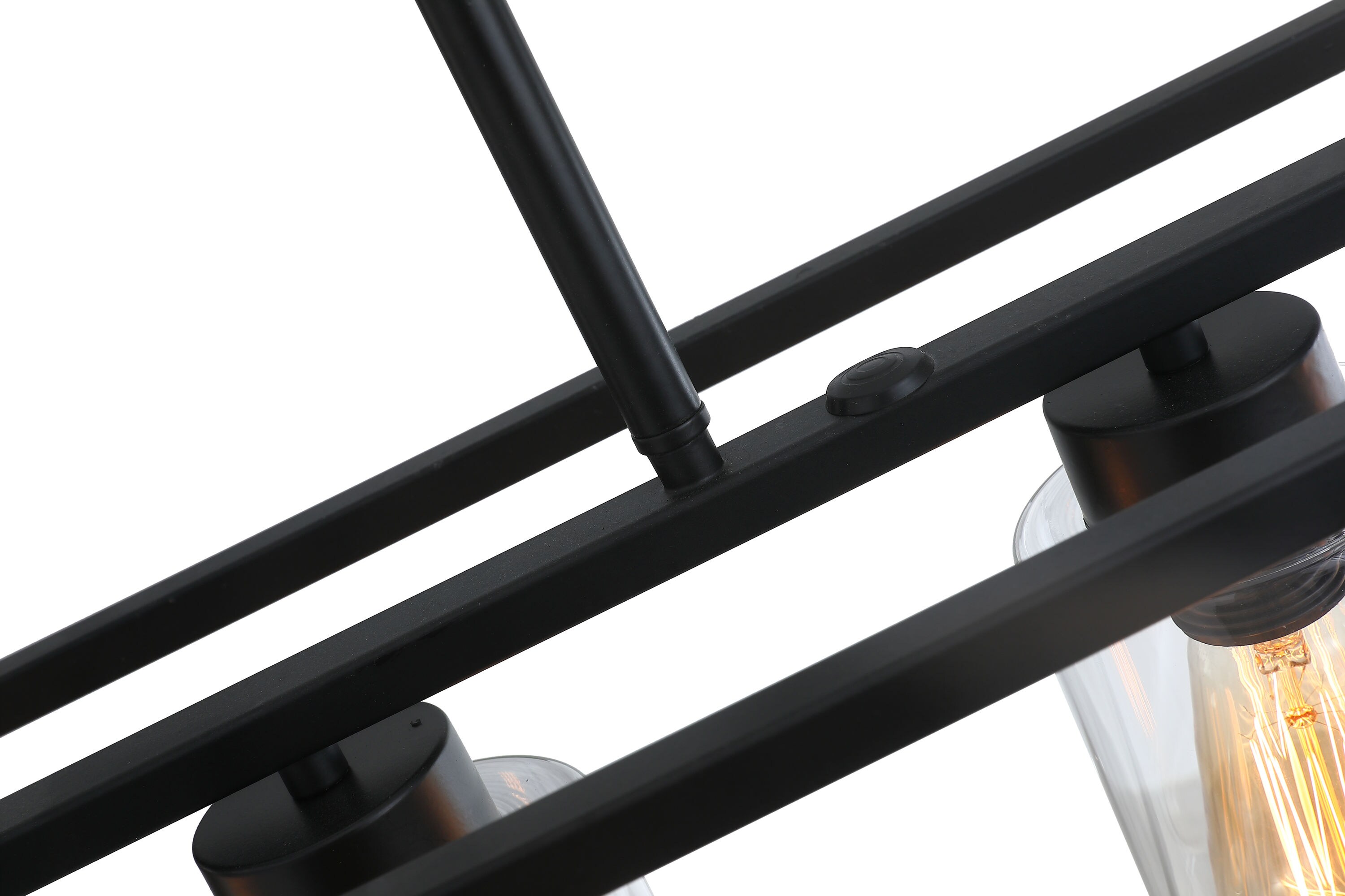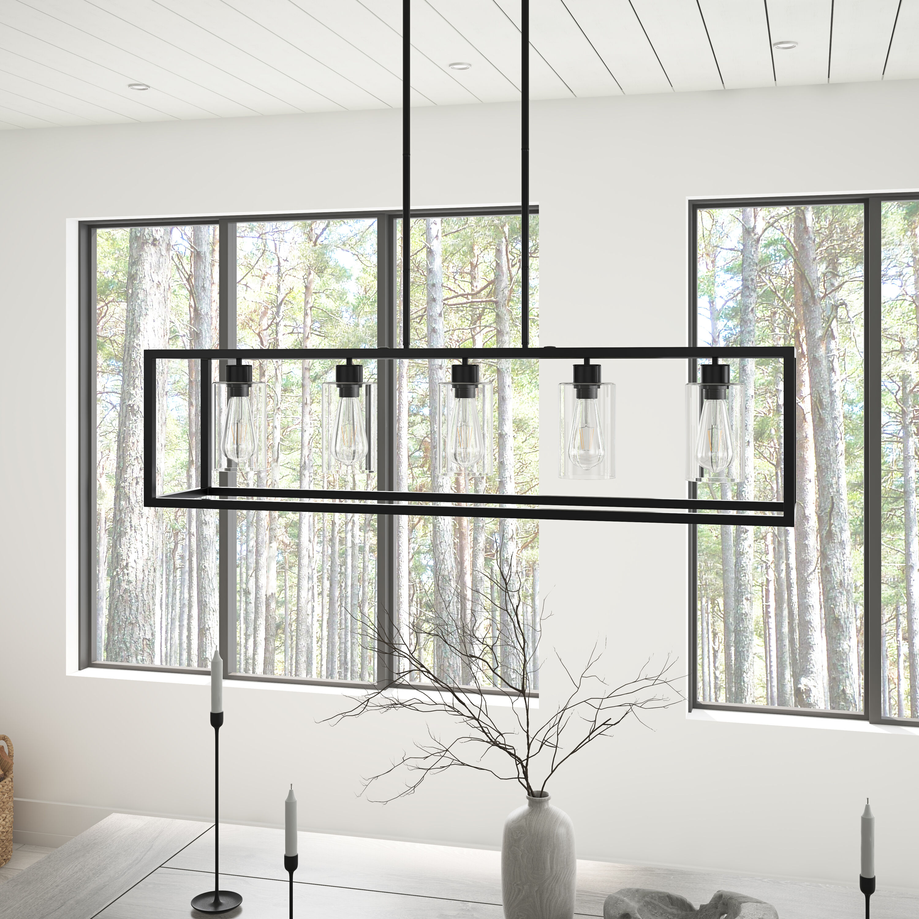 This 5 light rectangular chandelier is unique and perfect decoration for the modern or farmhouse home, minimal lines and modern tones give the light an edge that never disappoints. The corners of its simple cage frame are accented by square blocks, all finished in a deep earth black with clear glass. Perfectly for kitchen island,dining room,living room,cafe, bar,club,warehouse,hallway.