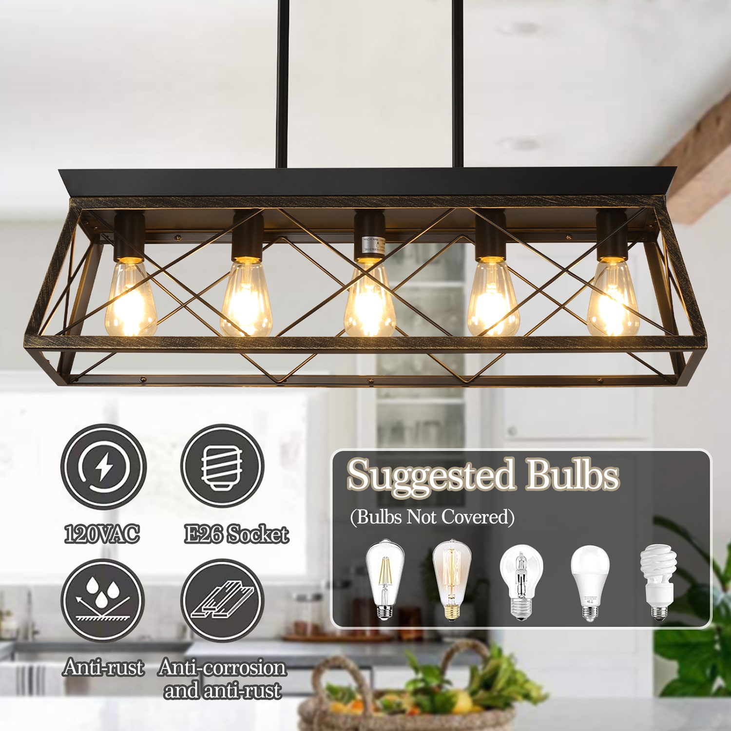 The 32″ Black Gold Industrial 5-Light Pendant Chandelier features a modern metal cage design with an adjustable hanging mechanism, making it a versatile and stylish lighting option for various spaces. With a durable metal frame, easy installation, and compatibility with multiple bulb types, this chandelier is an excellent choice for enhancing dining rooms, kitchens, living rooms, and more.