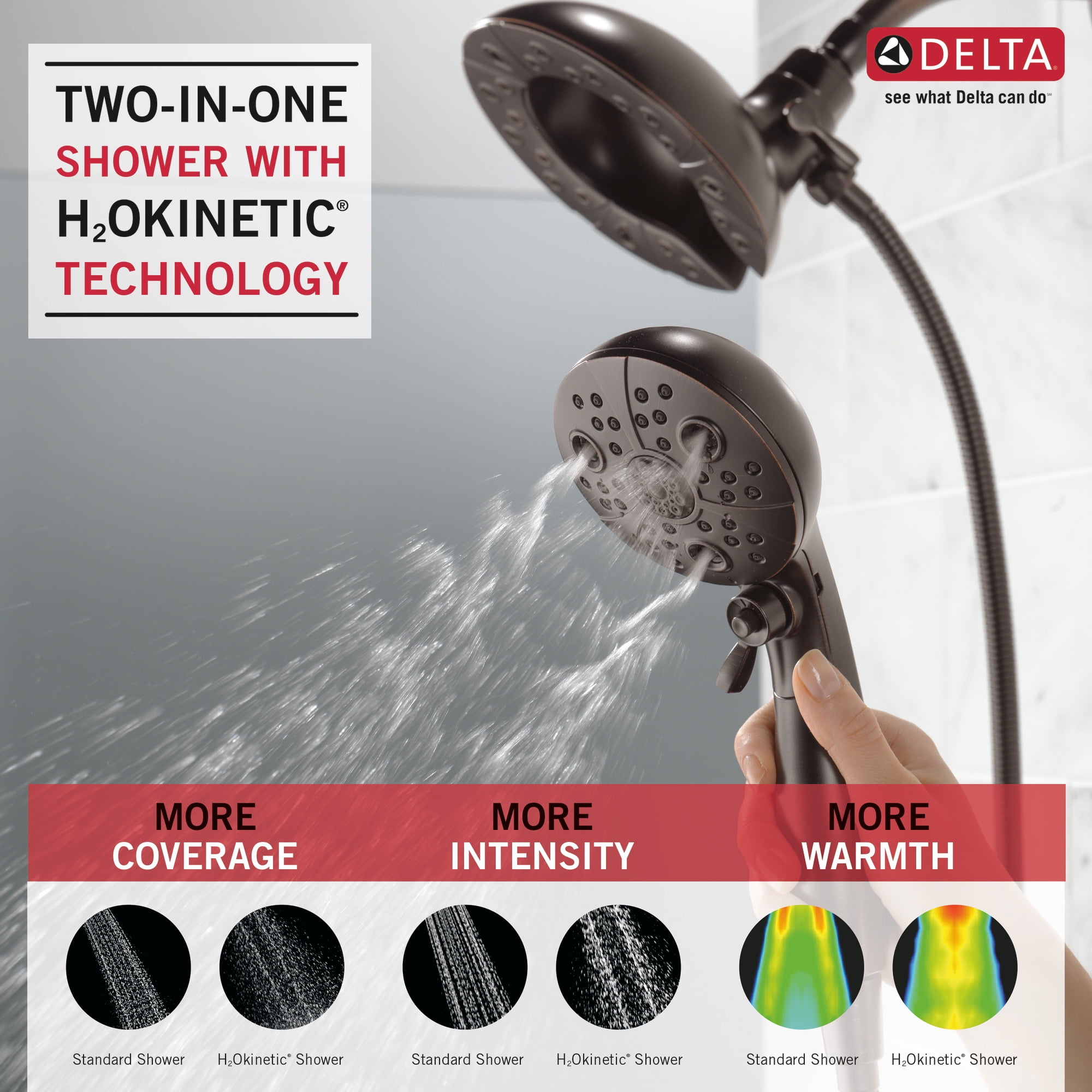 The In2ition® Two-in-One Shower gets water where you need it most using the integrated shower head and hand shower separately or together Perfect for bathing loved ones and pets as well as keeping the inside of your shower and tub clean H2Okinetic® Shower technology sculpts water into a unique wave pattern, forming a powerful drench spray Gives you the feeling of more water without using more water MagnaTite® Docking uses a powerful integrated magnet to hold your In2ition® Two-in-One Shower Head precisely in place for easy docking every time Installs in minutes Spray settings include: H2OKinetic spray, Full Body spray, Full Spray with Massage, Massaging spray Pause feature reduces water to a trickle, giving you space for shaving, lathering and other shower tasks while maintaining your temperature settings Includes 60 in. hose WaterSense® labeled showers use at least 20% less water than the industry standard—saving you money without compromising performance