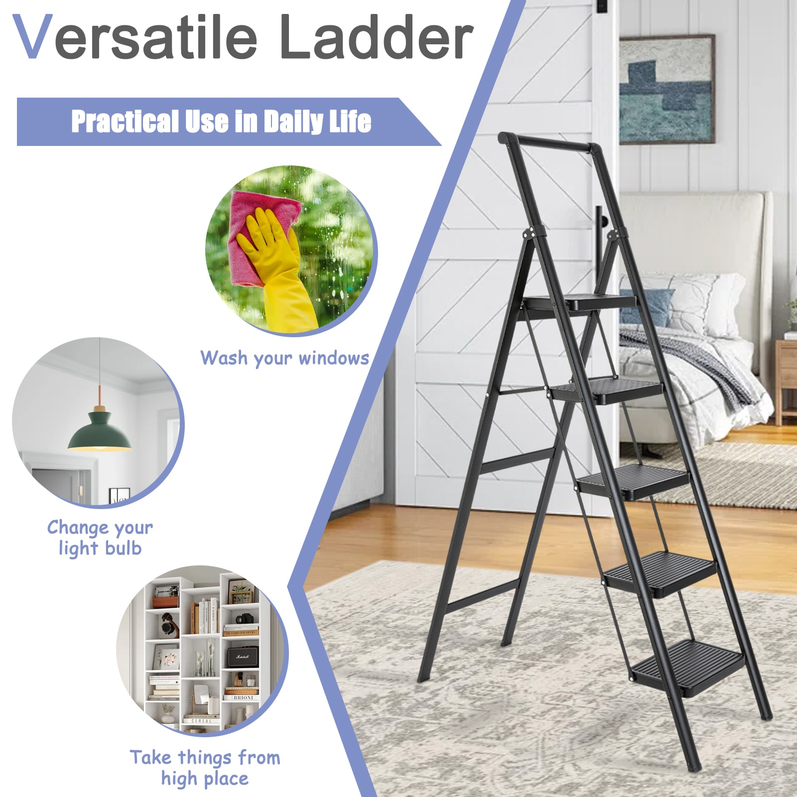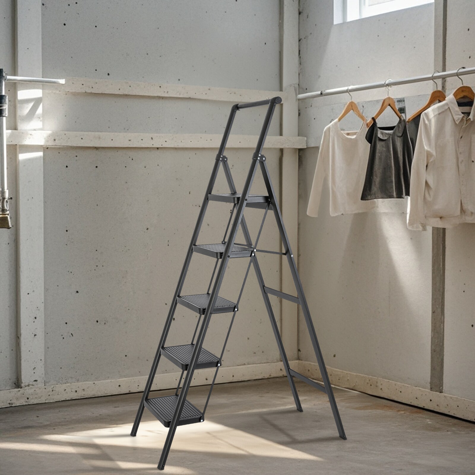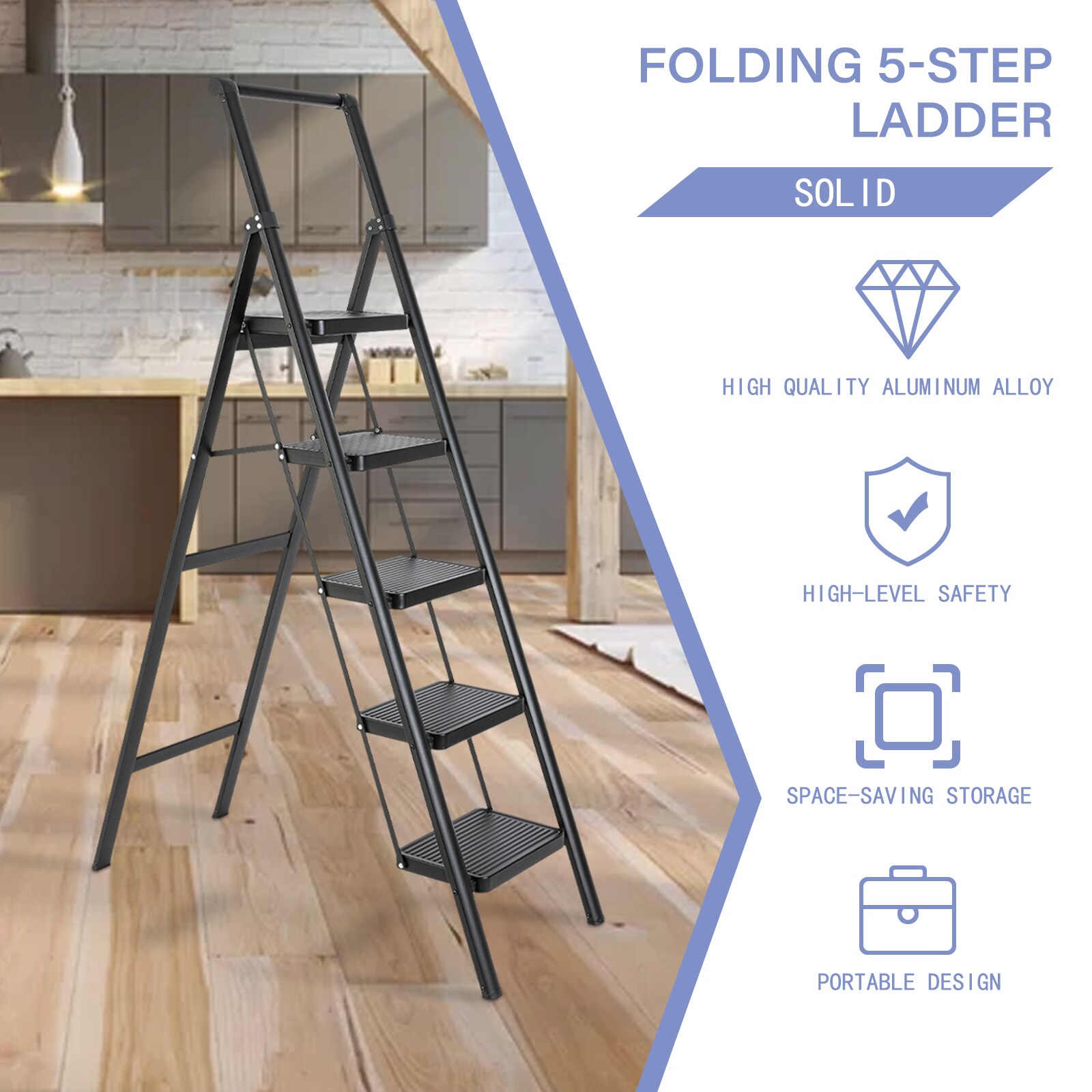 Upgrade your ladder needs with our 5 – step ladder! Made of high – strength aluminum alloy, it can handle loads over 330 pounds, ensuring stability and reliability. The anti – slip design keeps you safe, while the ergonomic features make climbing a breeze. It’s foldable, easy to install, and durable, with a sleek appearance that suits any setting. Whether for home or professional use, this versatile ladder is your reliable partner.